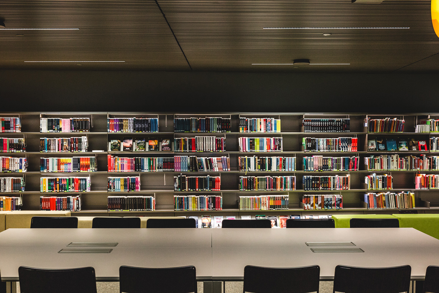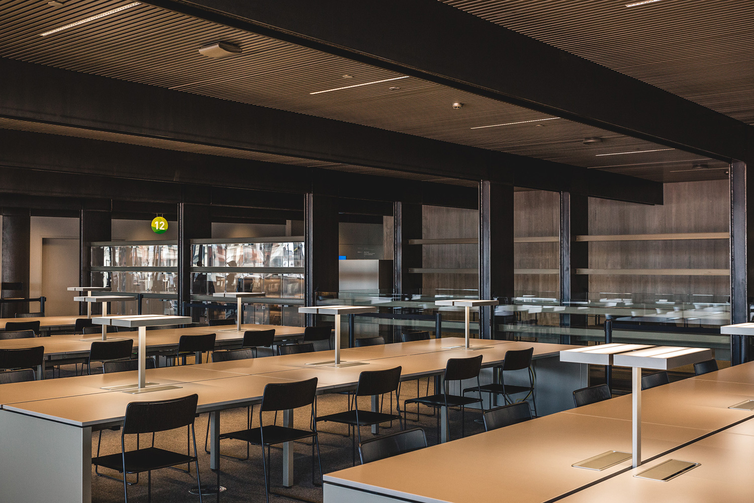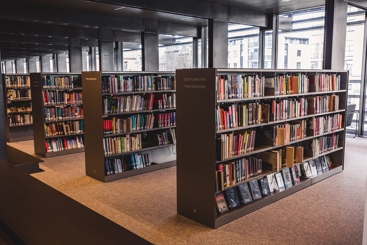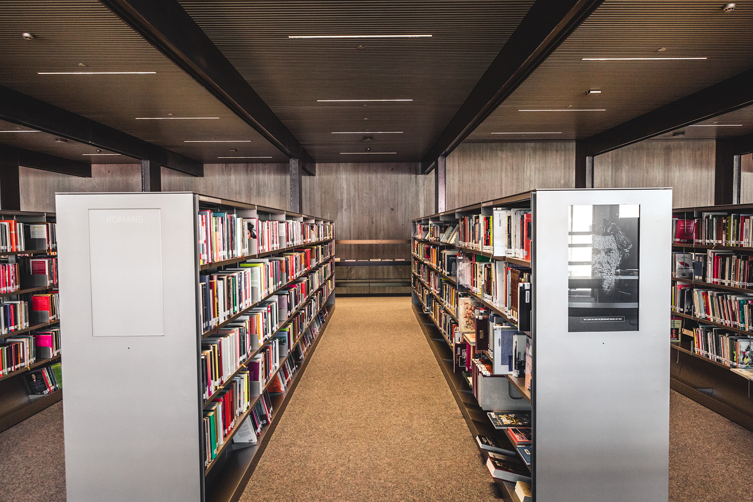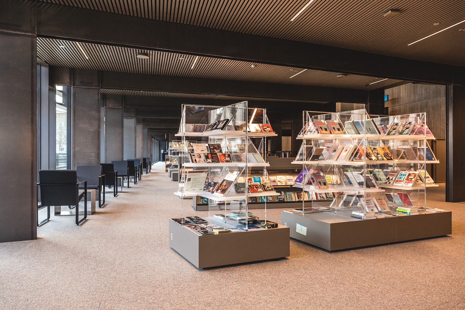The powerful design of the building is continued inside, with library shelving and custom made furniture in solid steel in a sober color palette. The spacious library collection has been arranged in an open and linear layout with shelving deliberately kept low to maintain the feeling of an open space. The shelving is based on the 60/30 shelving system, but were adapted to the library's needs and the aesthetic expectations of the architect. Steel cover plates and skirtings form a solid casing with LED strips illuminating sloping shelves. Simple but clear signage indicates the reader's way around the library.