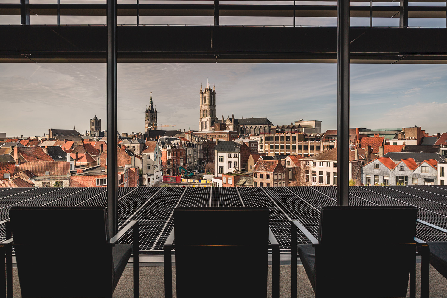 The Krook, a large-scale urban renewal project, is a building that looks like a steel barge and includes the new city library, laboratories and offices of Gent University. The Krook was designed by the Gent bureau Coussée & Goris in collaboration with RCR Arquitectes, 2017 winners of the Pritzker Prize.