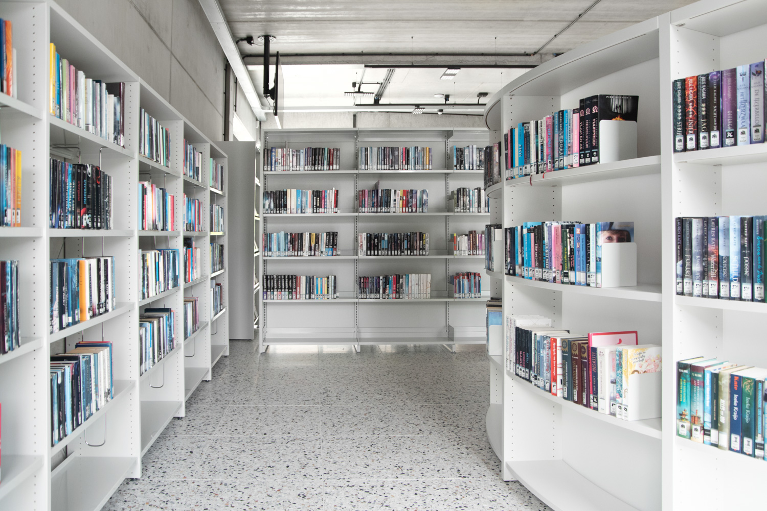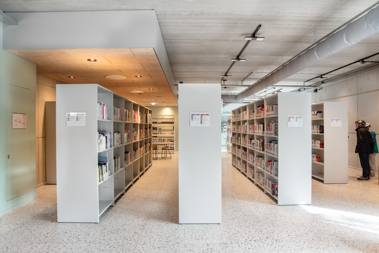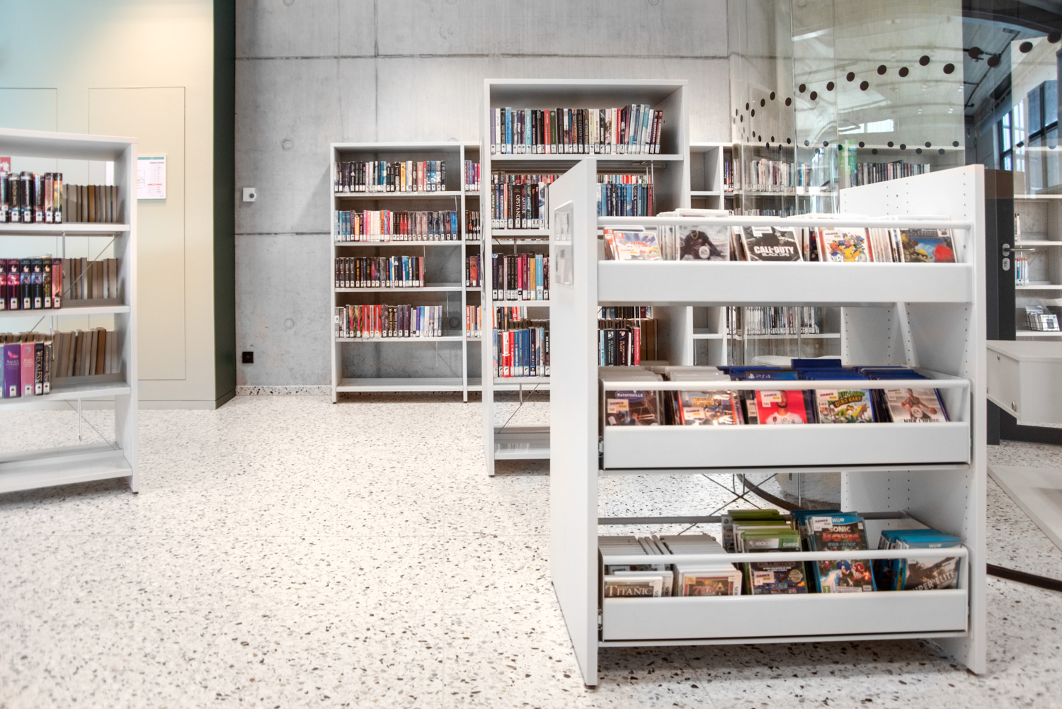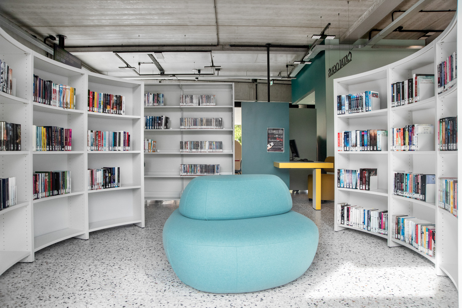 Throughout the library, the shelving is kept white to draw all attention to the contents – the books. The contemporary colour palette of the building is reflected in the furniture.