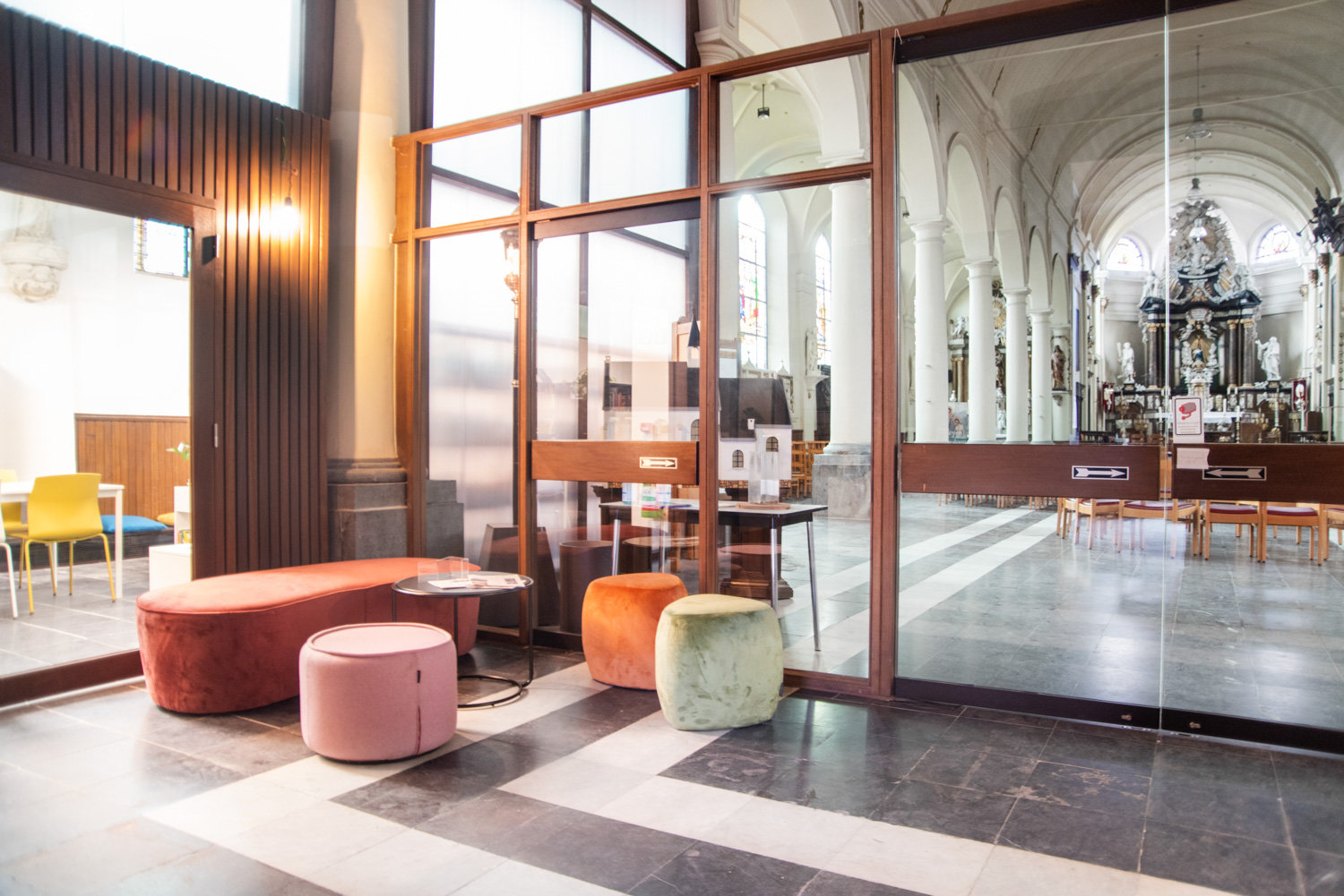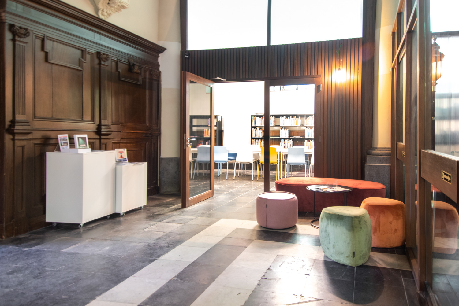 The rooms are tastefully furnished while respecting the building: the arches have been preserved, and the distinctive, abundant light from the large stained-glass windows typical of a church, is maintained through glass walls that separate the library from the church activities.