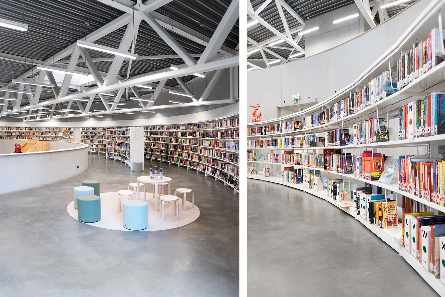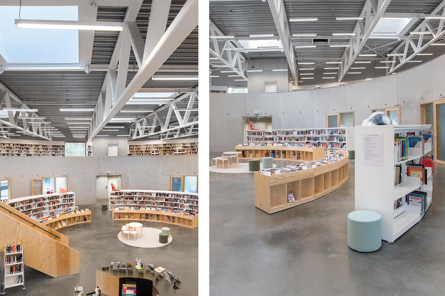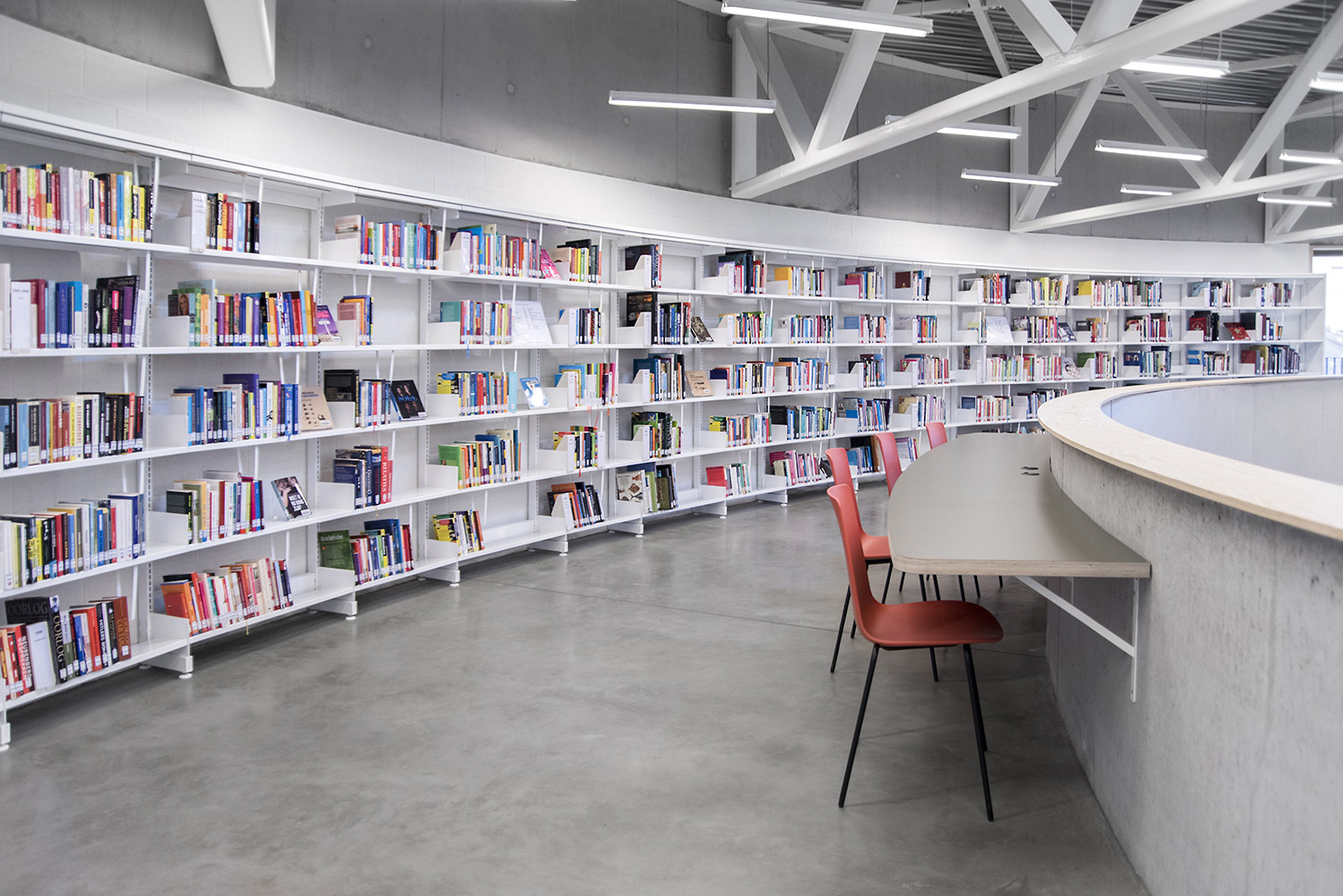 The 60/30 Shelving system follows the curved shape of the building so that the openness of the library is emphasized. The white shelving and the raw natural materials such as concrete and pine give the library a simplistic and sleek design.