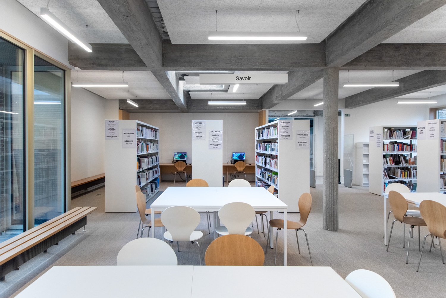 Distinct zones have been clearly defined for adults, young people, games, audiovisual materials and knowledge, enabling smooth navigation. Low shelving systems maintain a clear and cohesive view of the entire space, enhancing accessibility and openness.