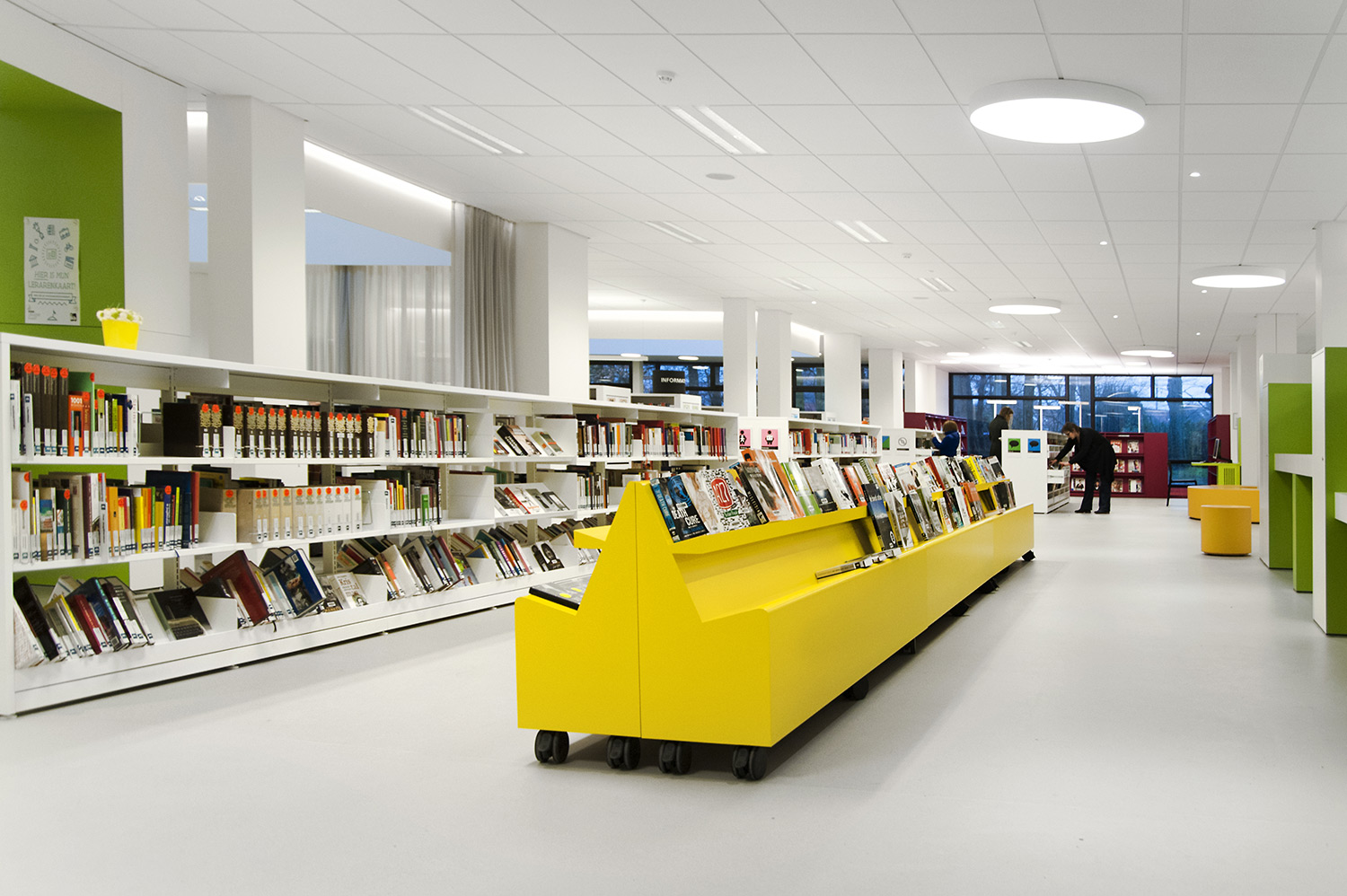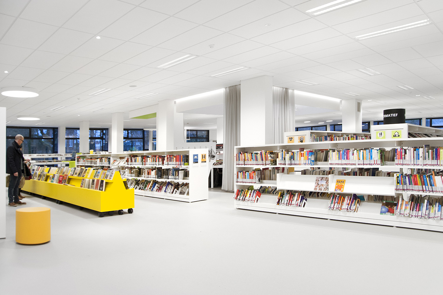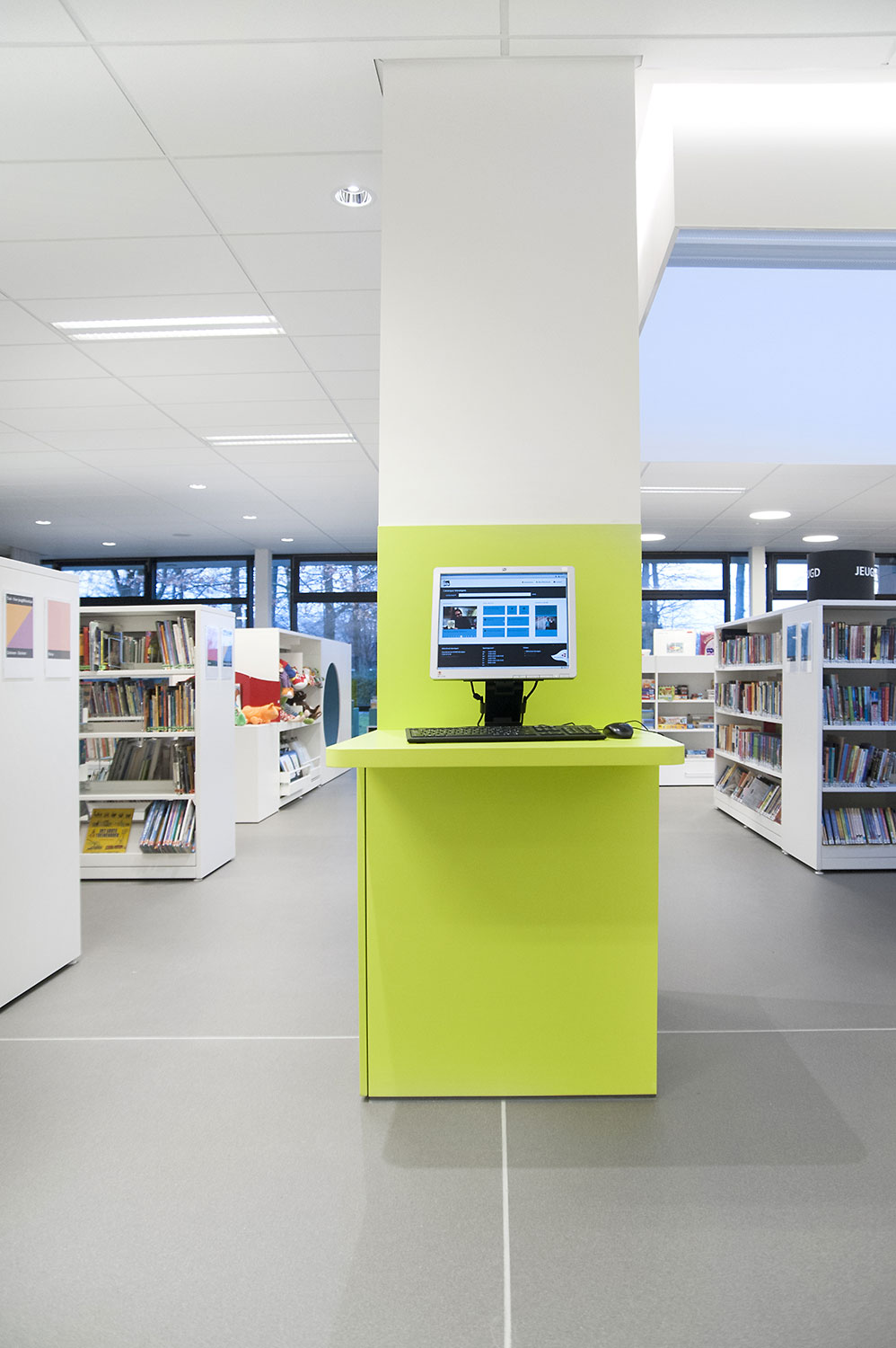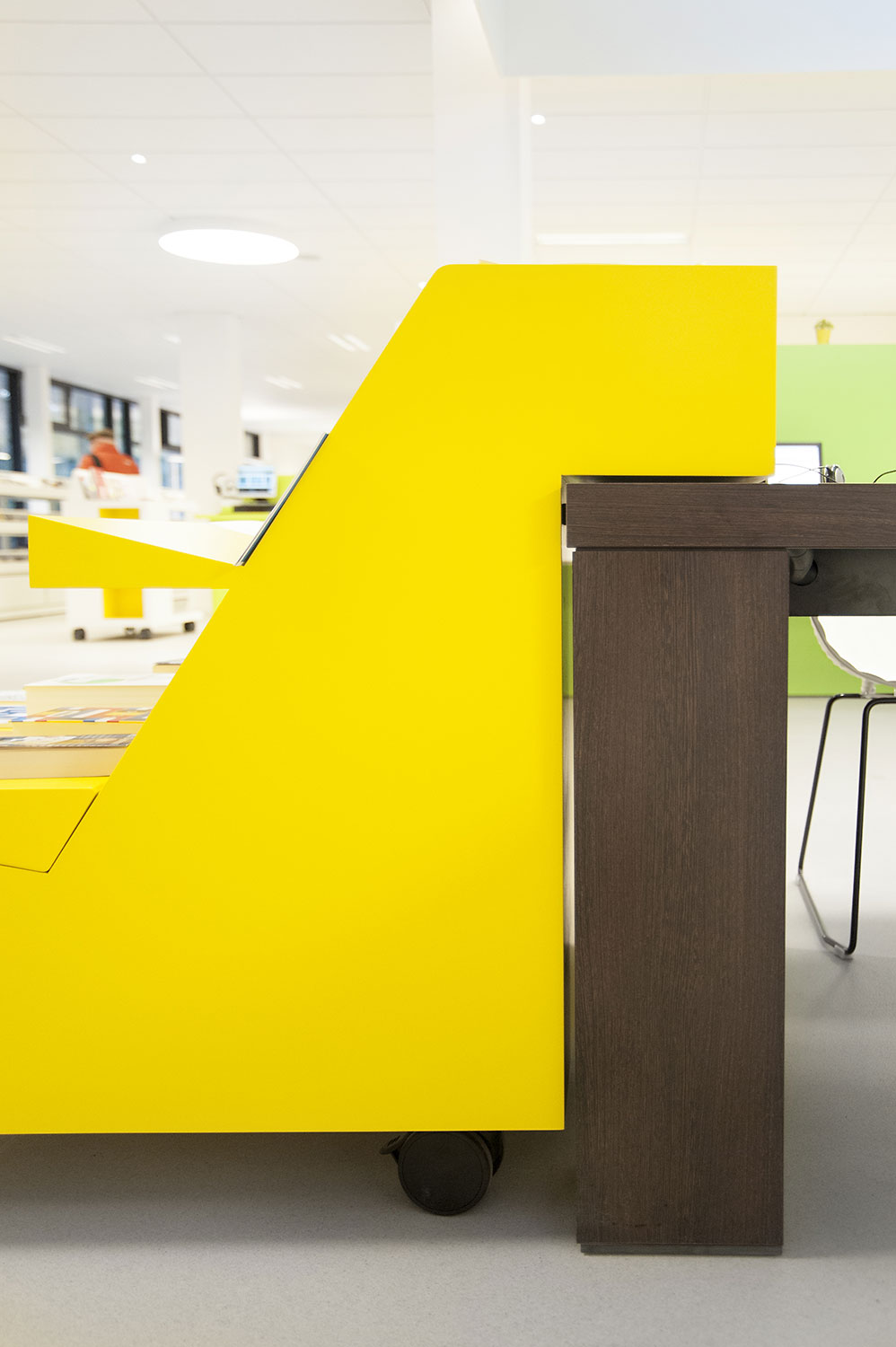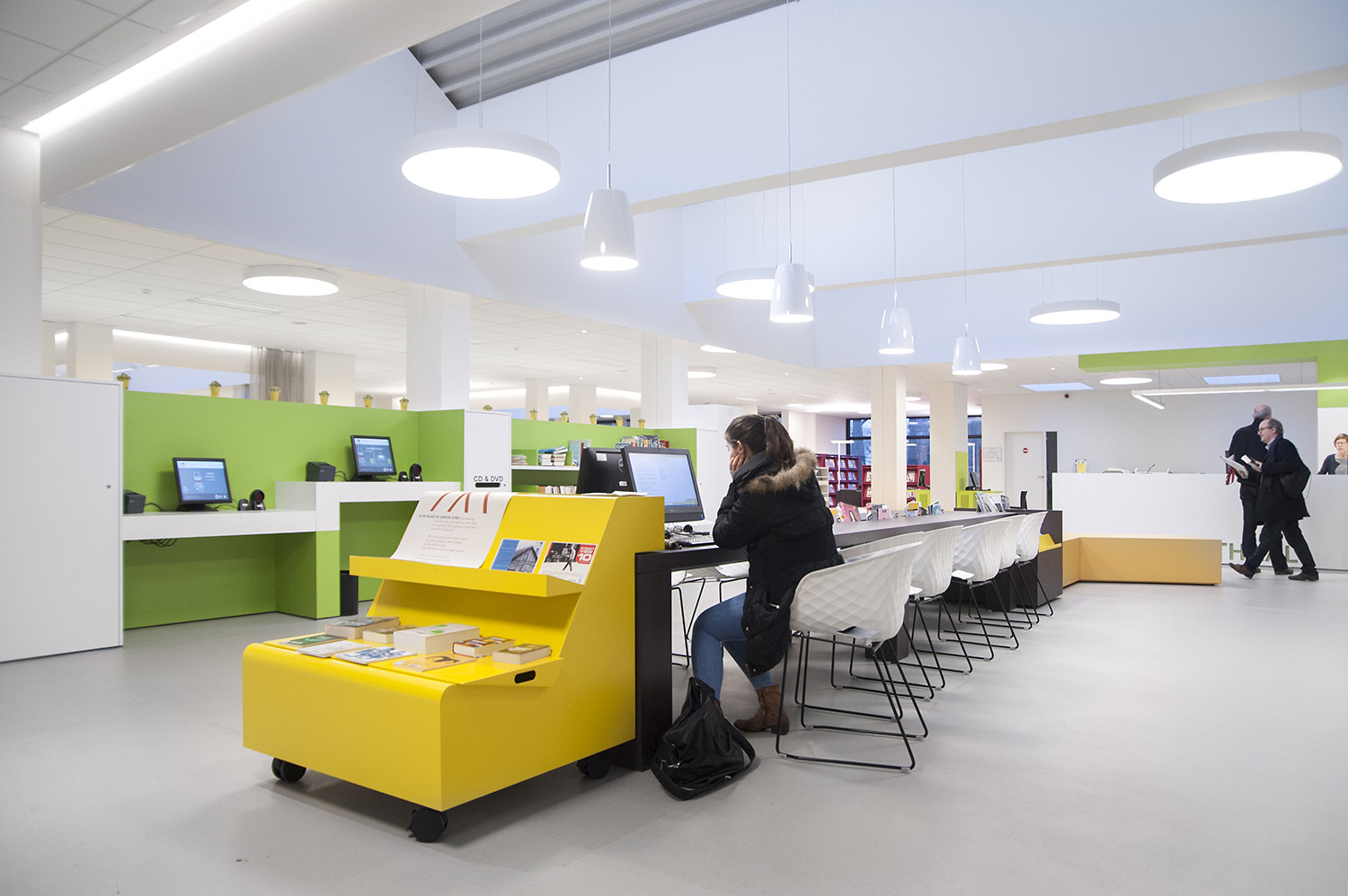 Not only the building has evolved, but also the way the library works. Wevelgem library is a so called user oriented library, a library with a high focus on a question based way of working. Visitors can turn to the library staff who helps and orients them.