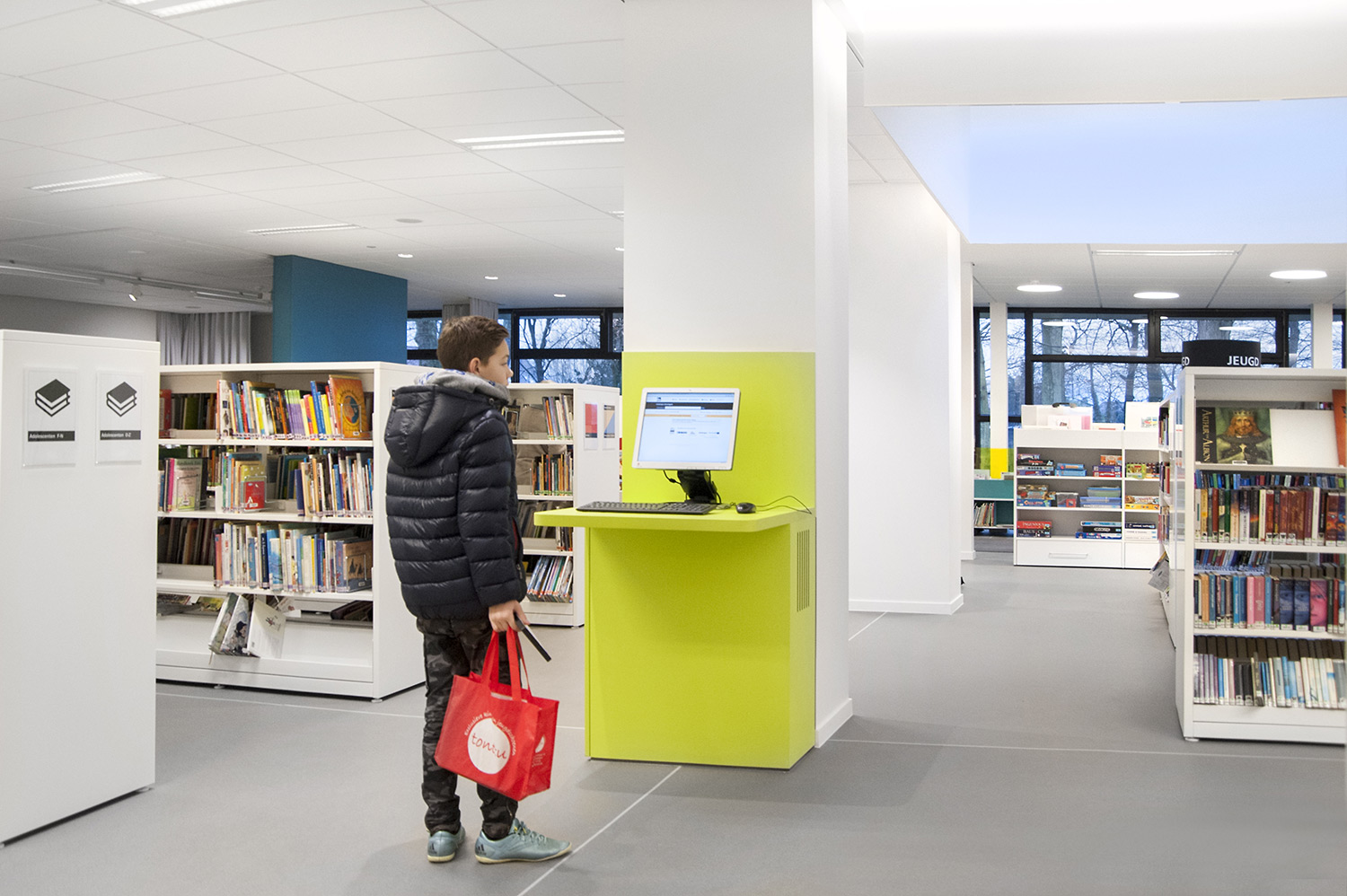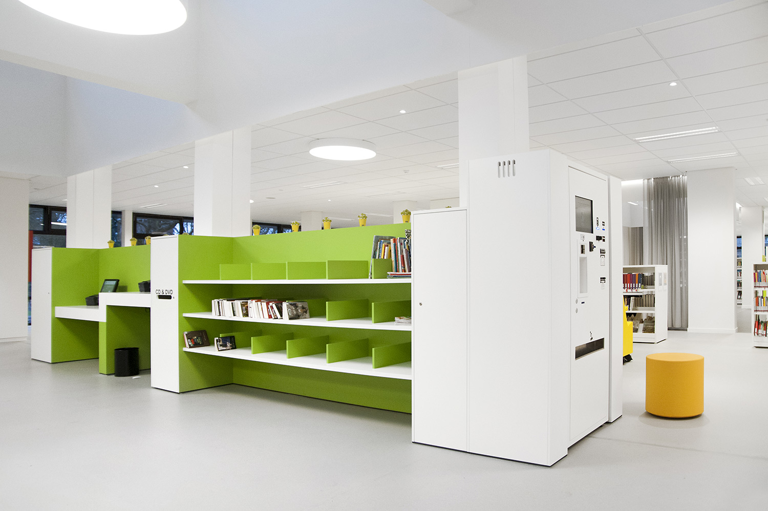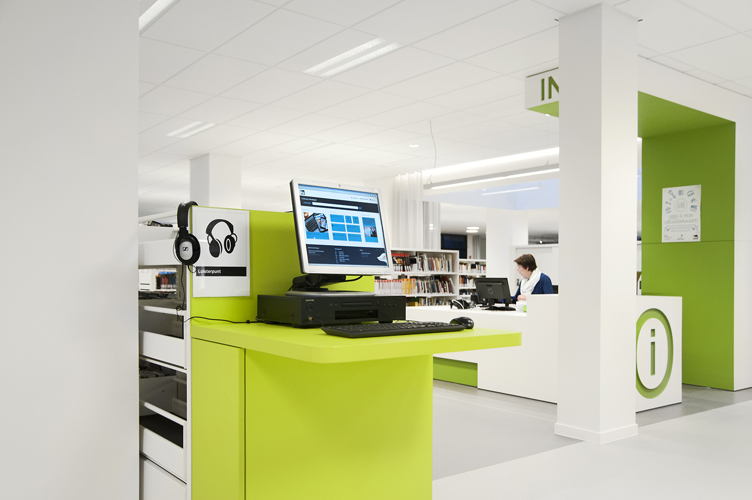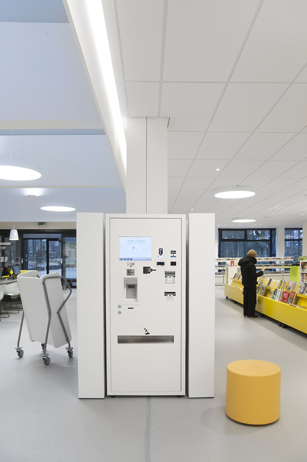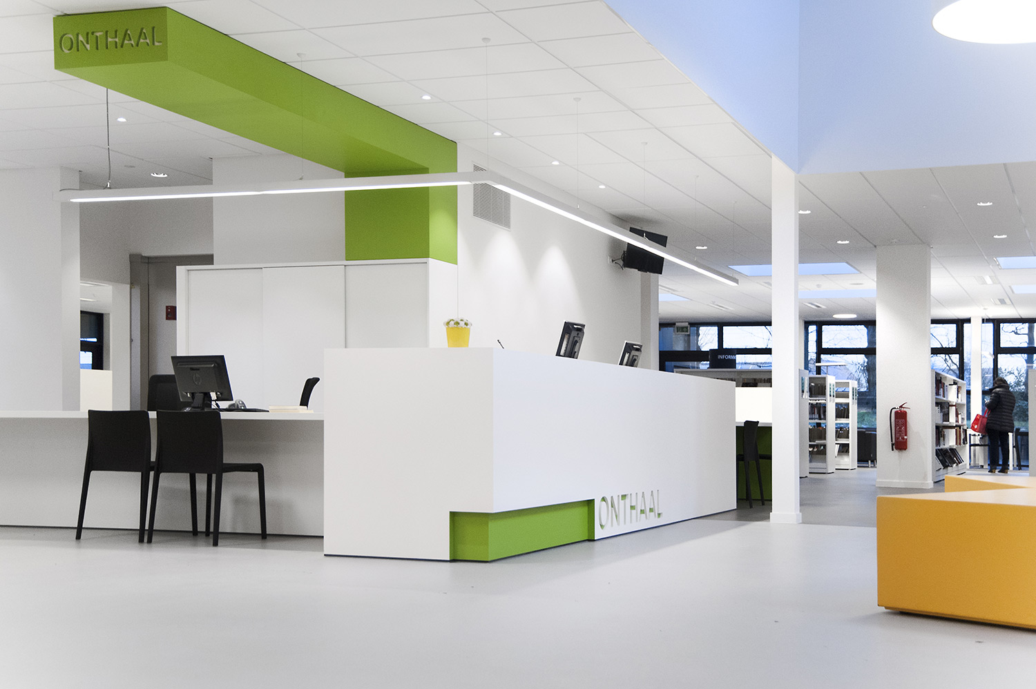 Not only the building has evolved, but also the way the library works. Wevelgem library is a so called user oriented library, a library with a high focus on a question based way of working. Visitors can turn to the library staff who helps and orients them.