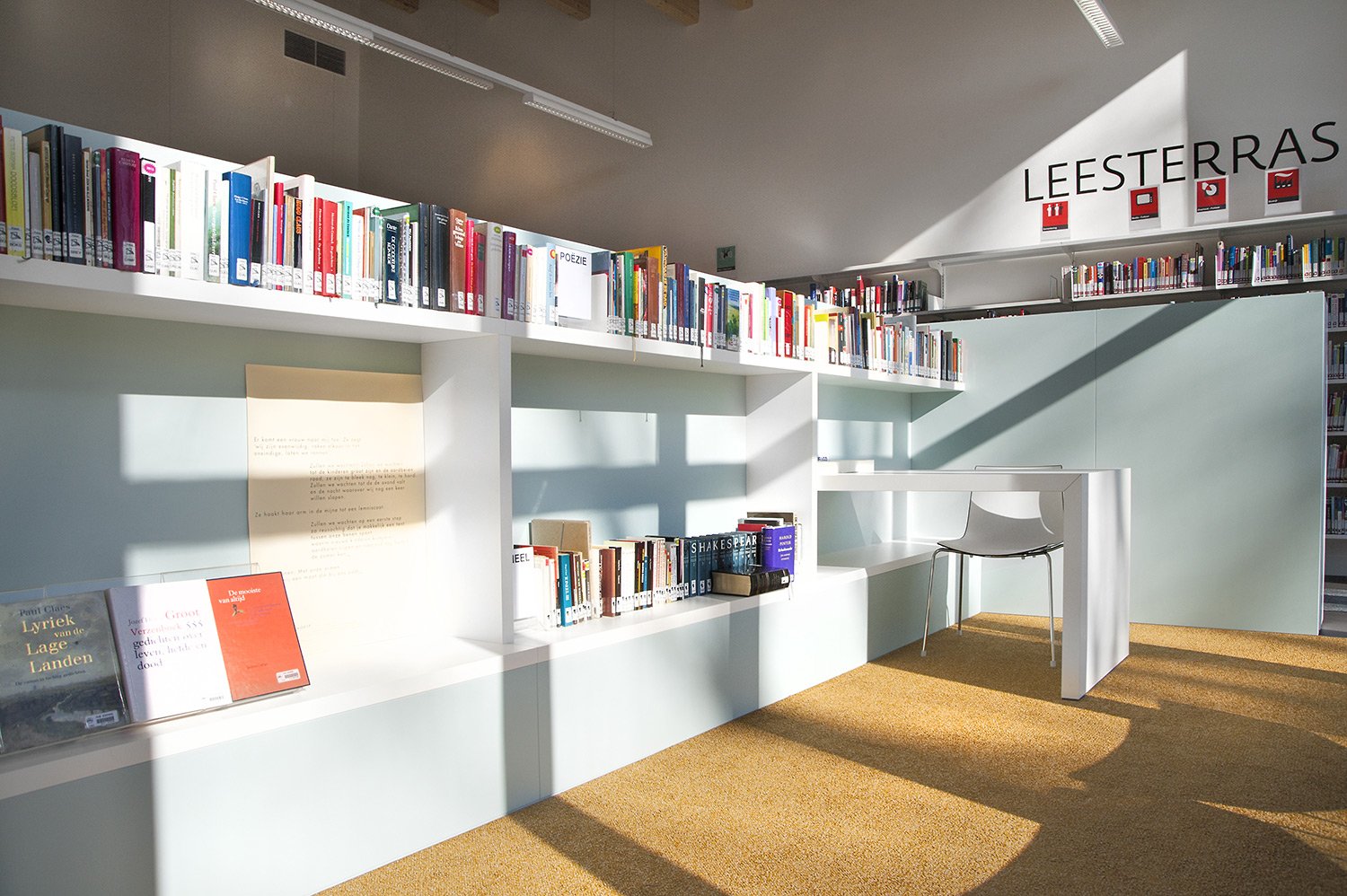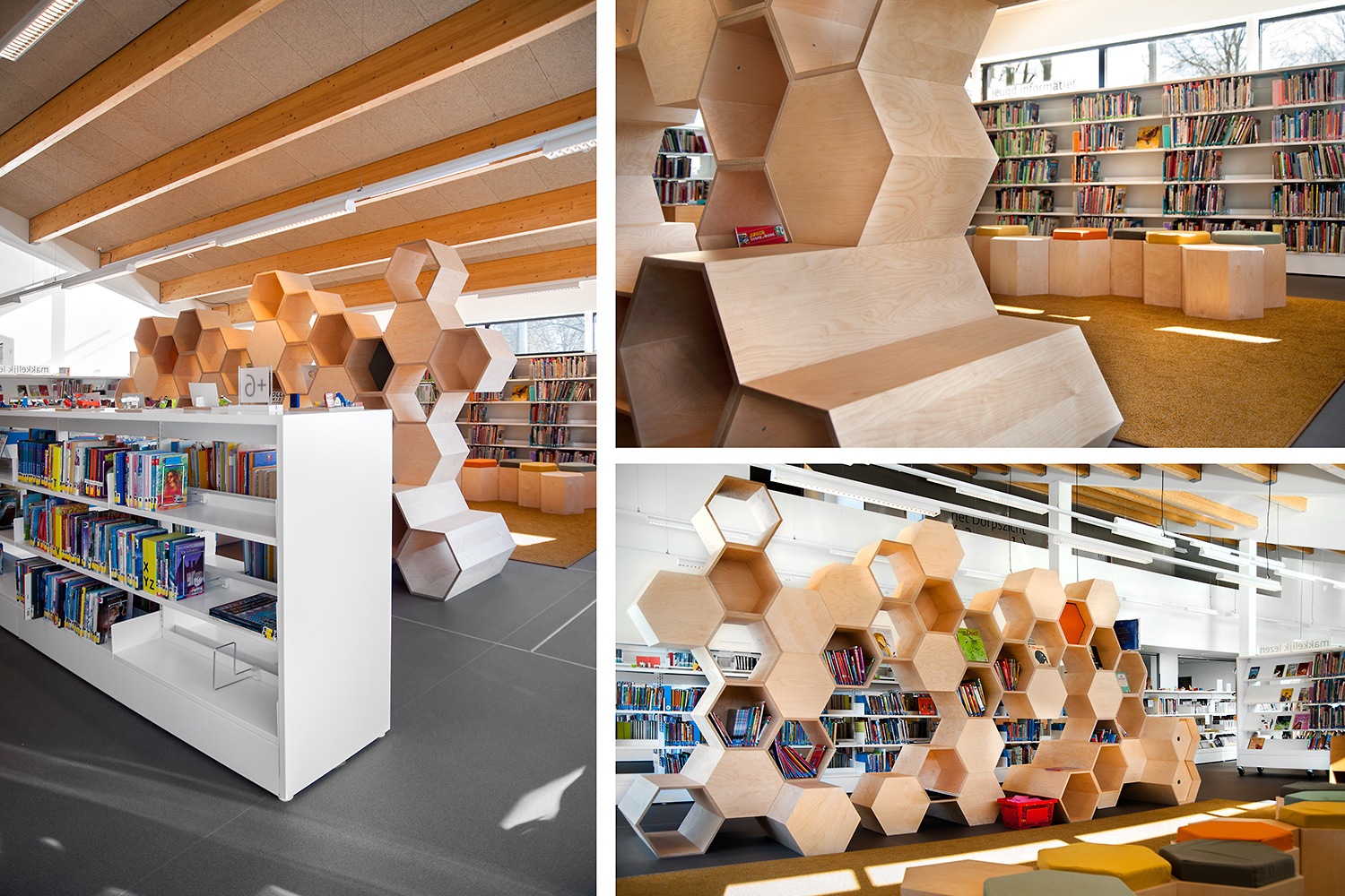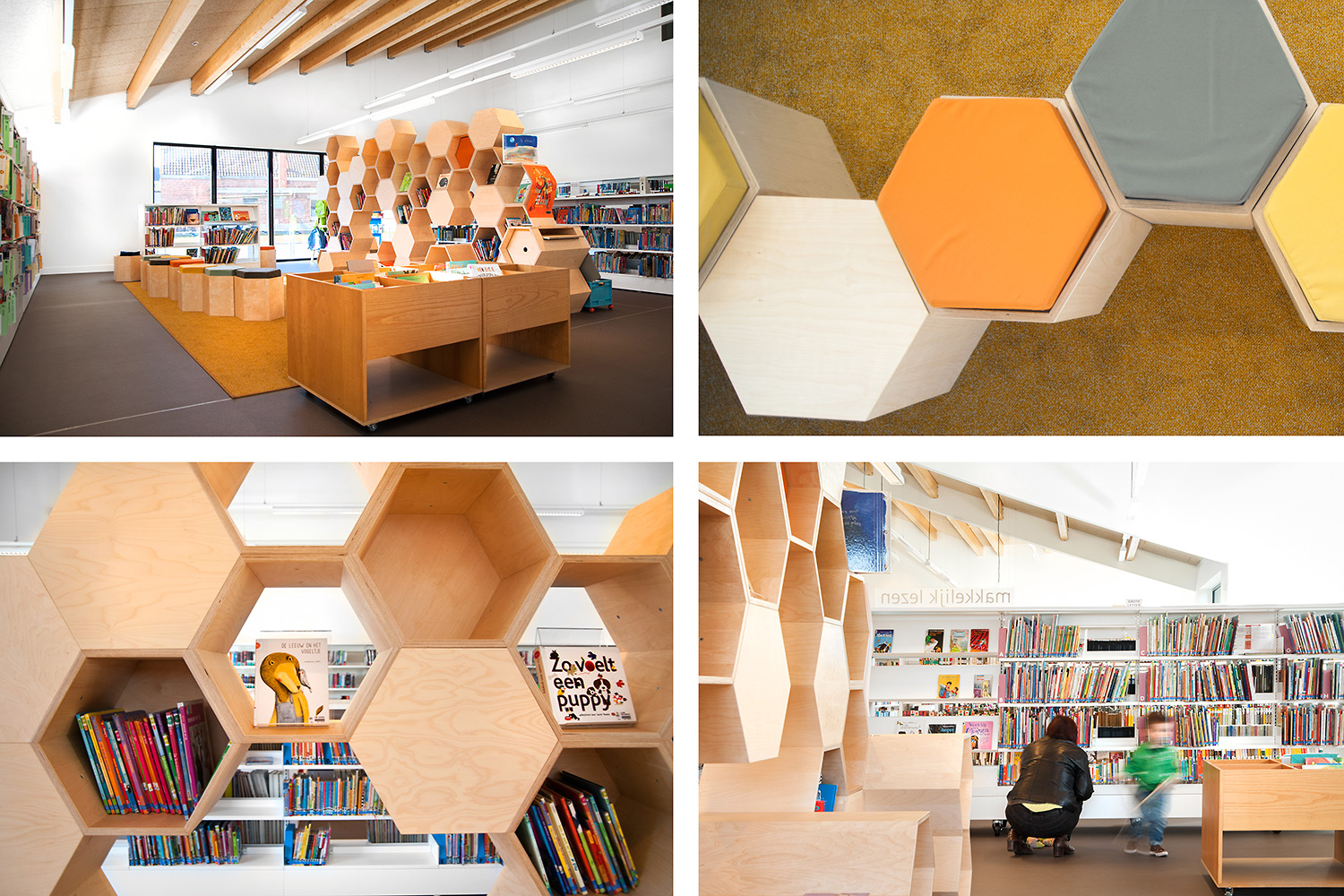 After years of not having a purpose-built location and being housed in a provisional building, the doors of the brand new Zoersel Public Library opened on 24 January 2015. The specified building's unique architecture and central location naturally turned it into the new town icon. It offers cozy reading spaces, study and laptop tables and custom-designed furniture. The combination of clean, white shelving alongside eye-catching, birch wood, hexagonal shapes that are punctuated with oranges and yellows, creates a modern yet calming atmosphere that draws people in from off the street. With a separate computer room and various meeting rooms, this library is fully attuned to the needs of its community and definitely deserves its new place in the heart of the town.