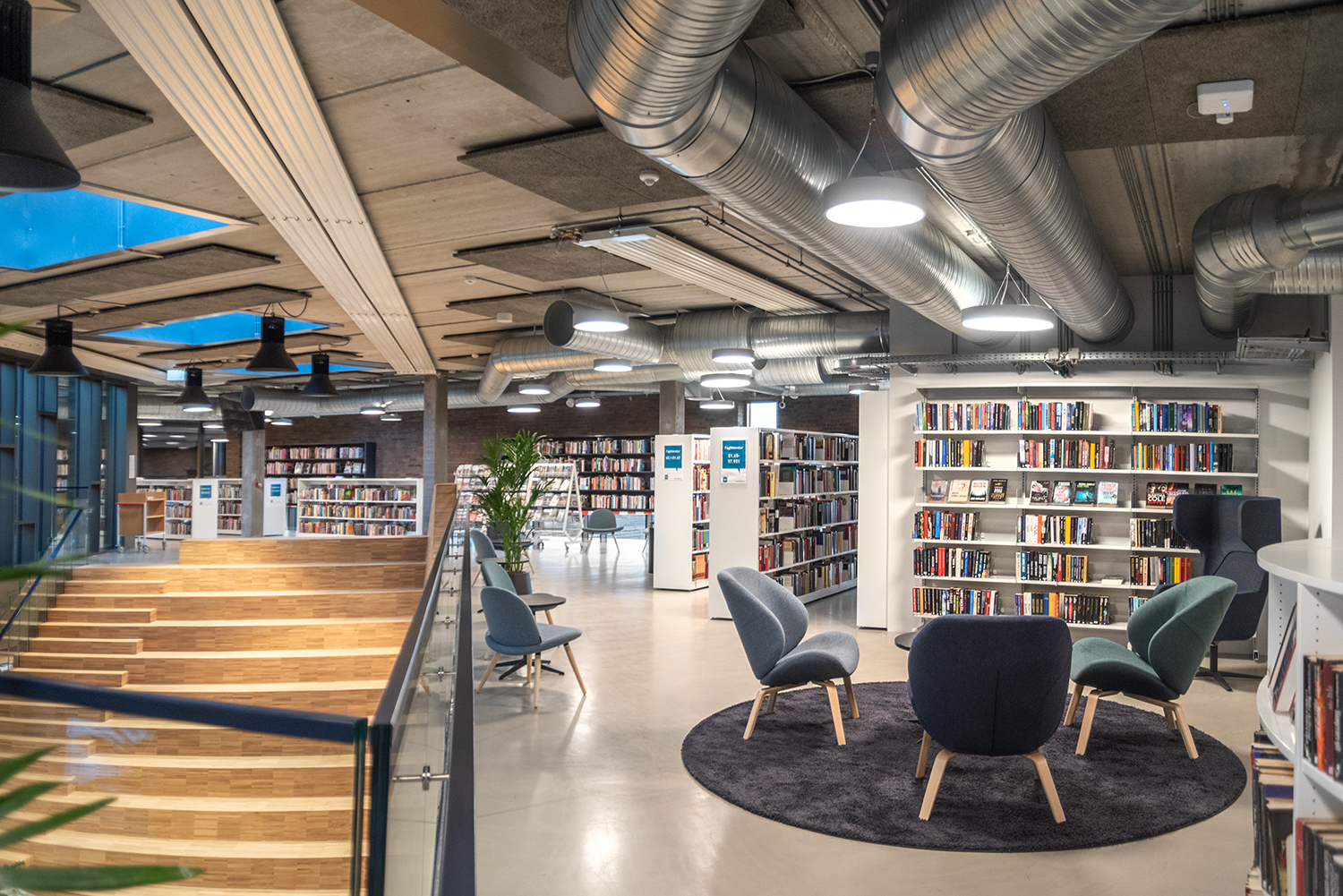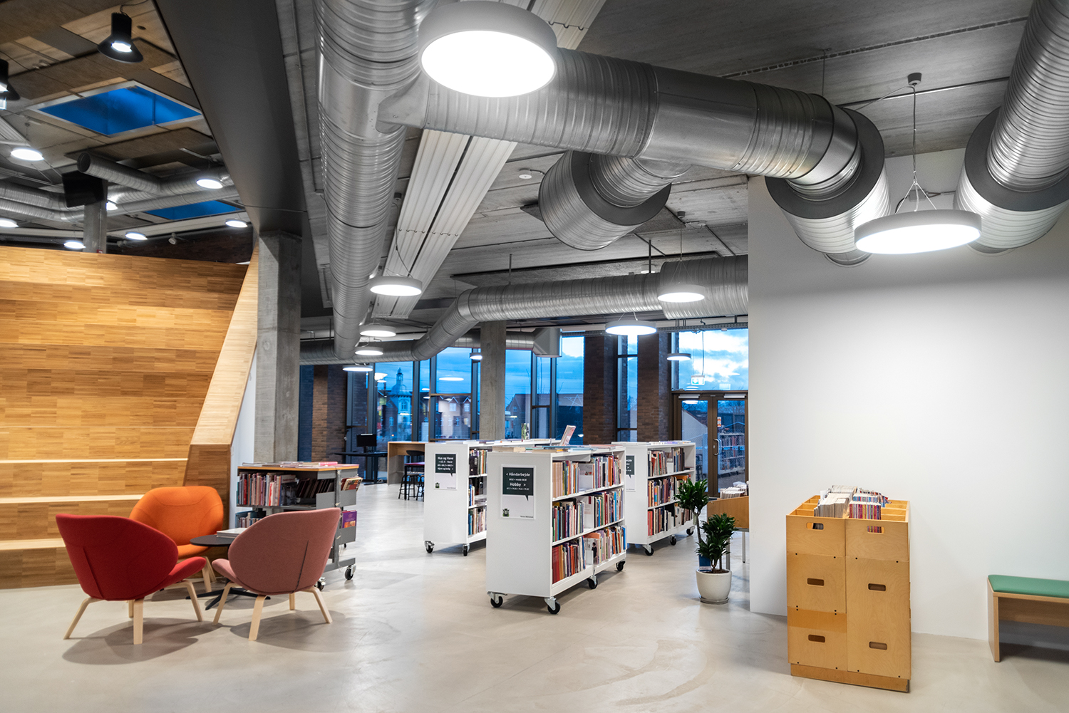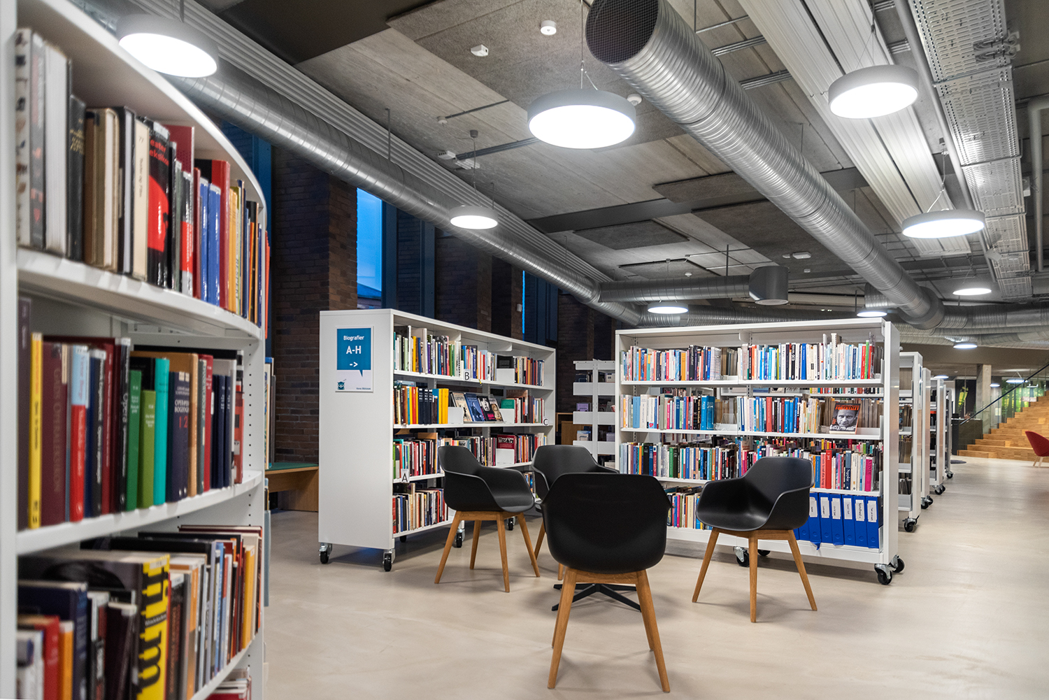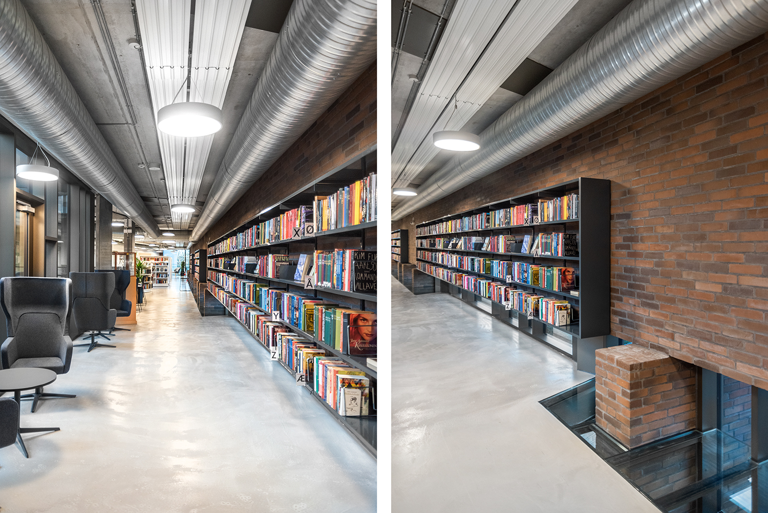 The library is spread over two floors, which in addition to books also have facilities for changing exhibitions and cultural events as well as a café. Panoramic windows flood the library with daylight to create vibrant contrasts with the dark brick walls. At the entrance, a large wooden staircase connects the two floors, while adding warmth to the other elements in the library interior.