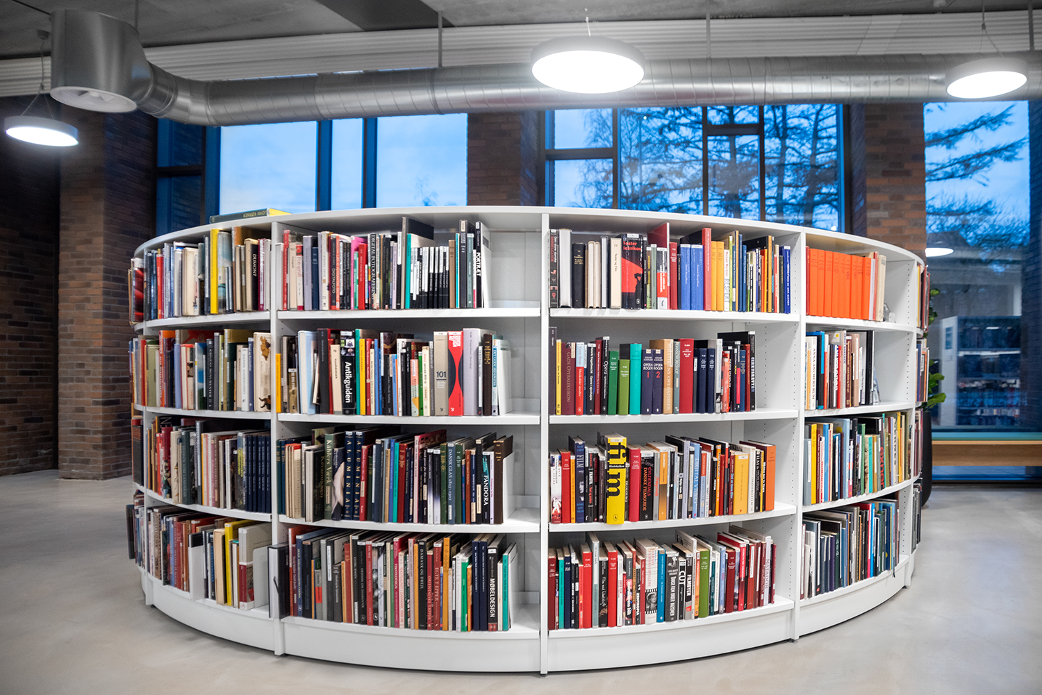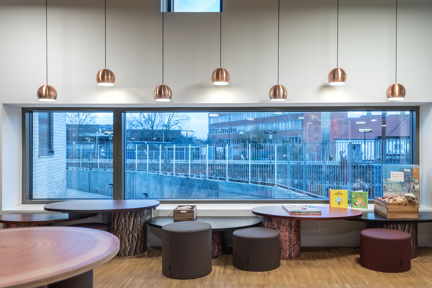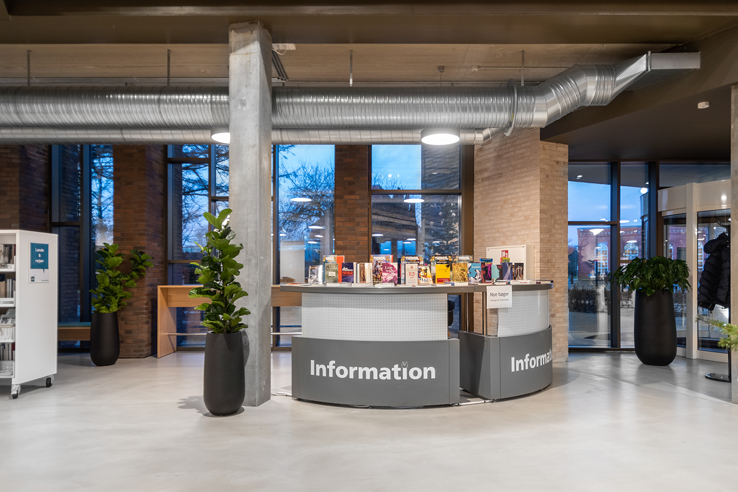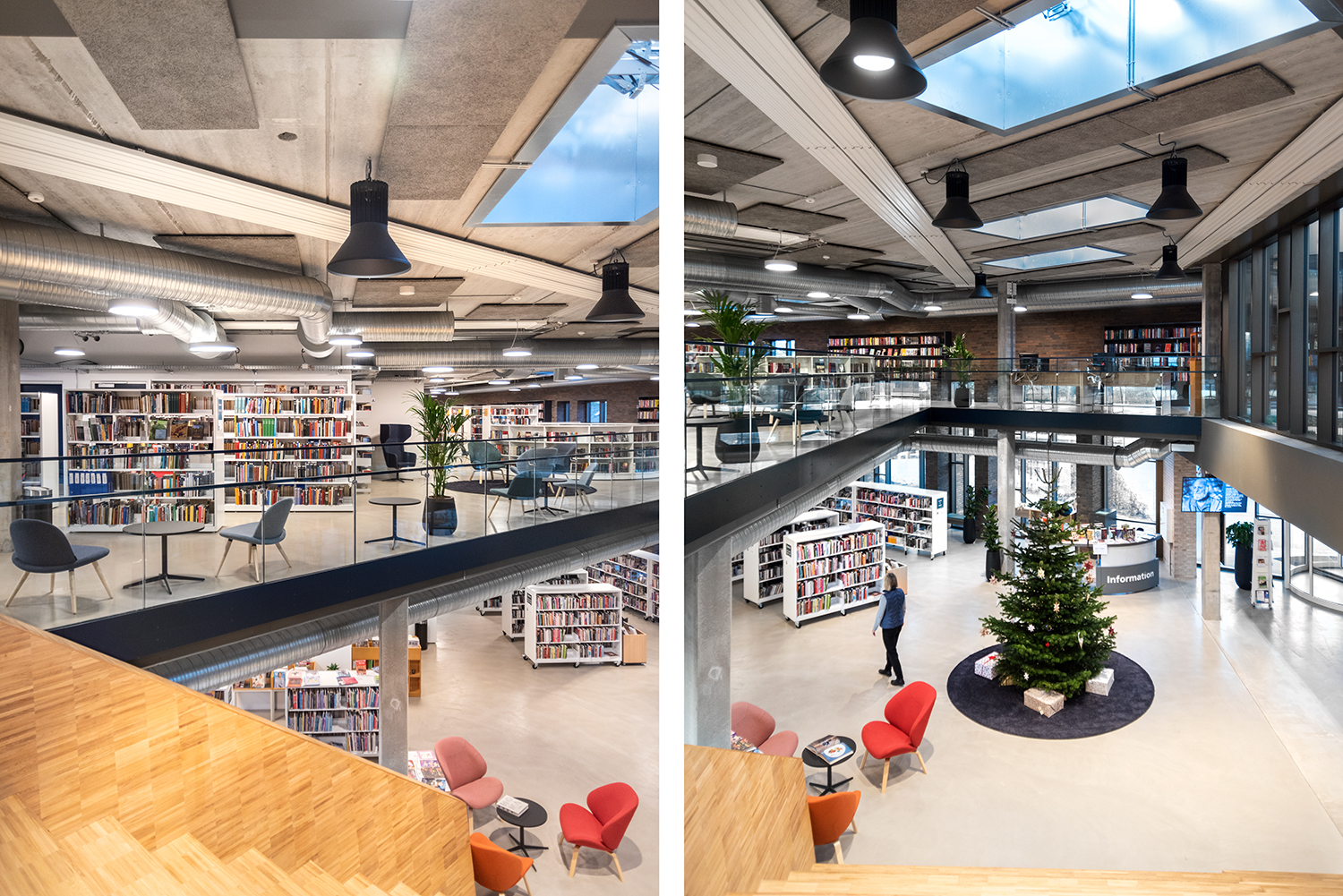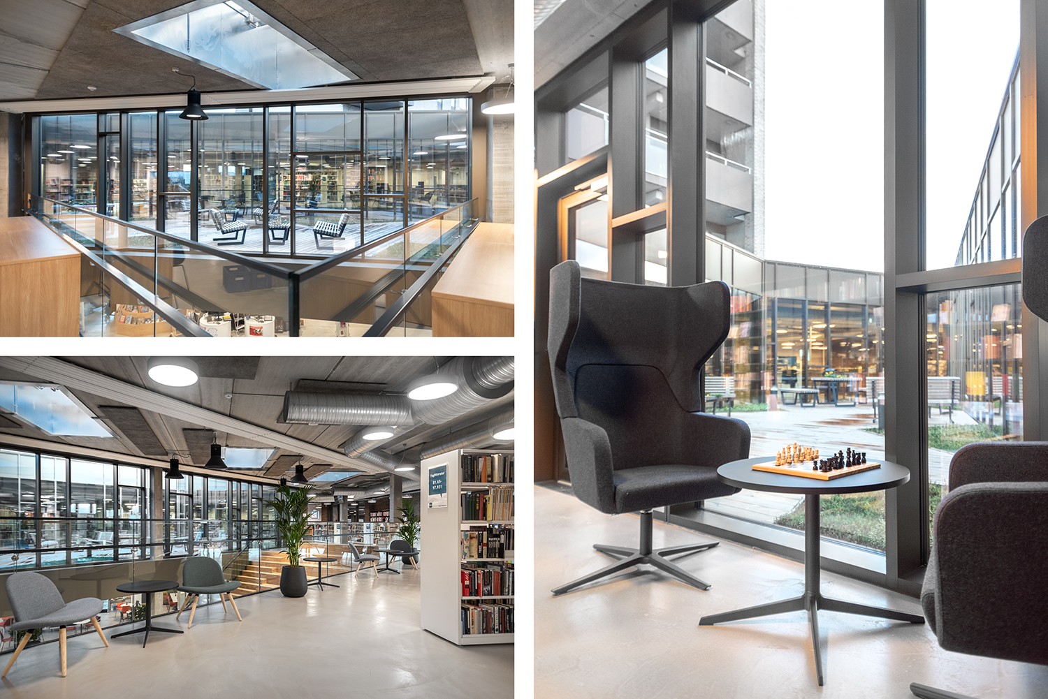 The library is spread over two floors, which in addition to books also have facilities for changing exhibitions and cultural events as well as a café. Panoramic windows flood the library with daylight to create vibrant contrasts with the dark brick walls. At the entrance, a large wooden staircase connects the two floors, while adding warmth to the other elements in the library interior.