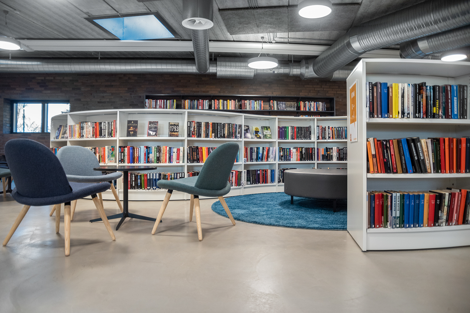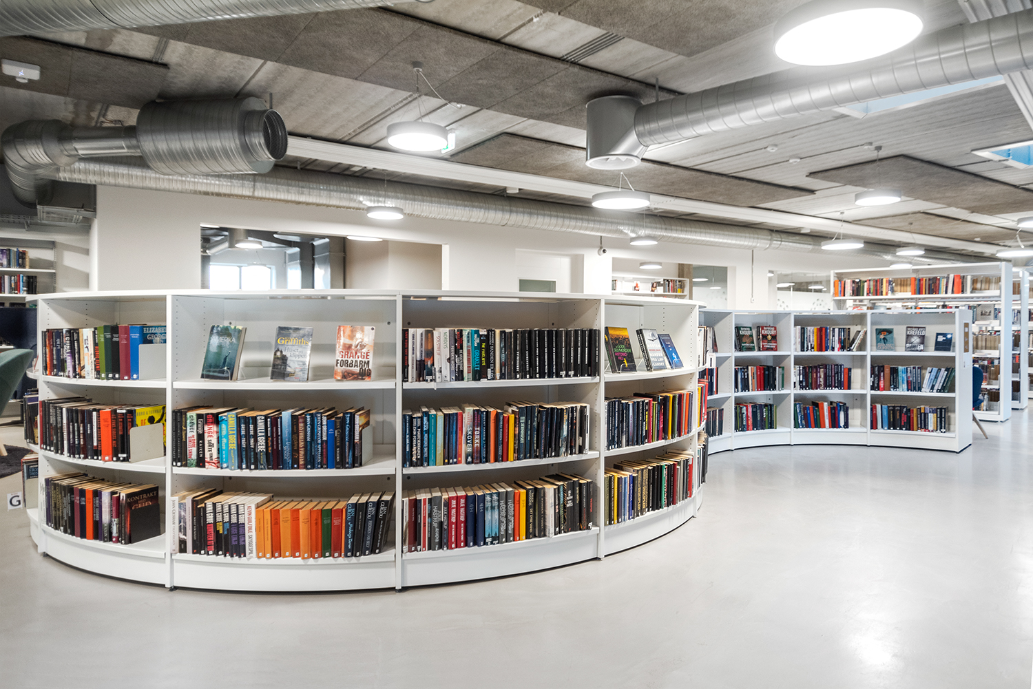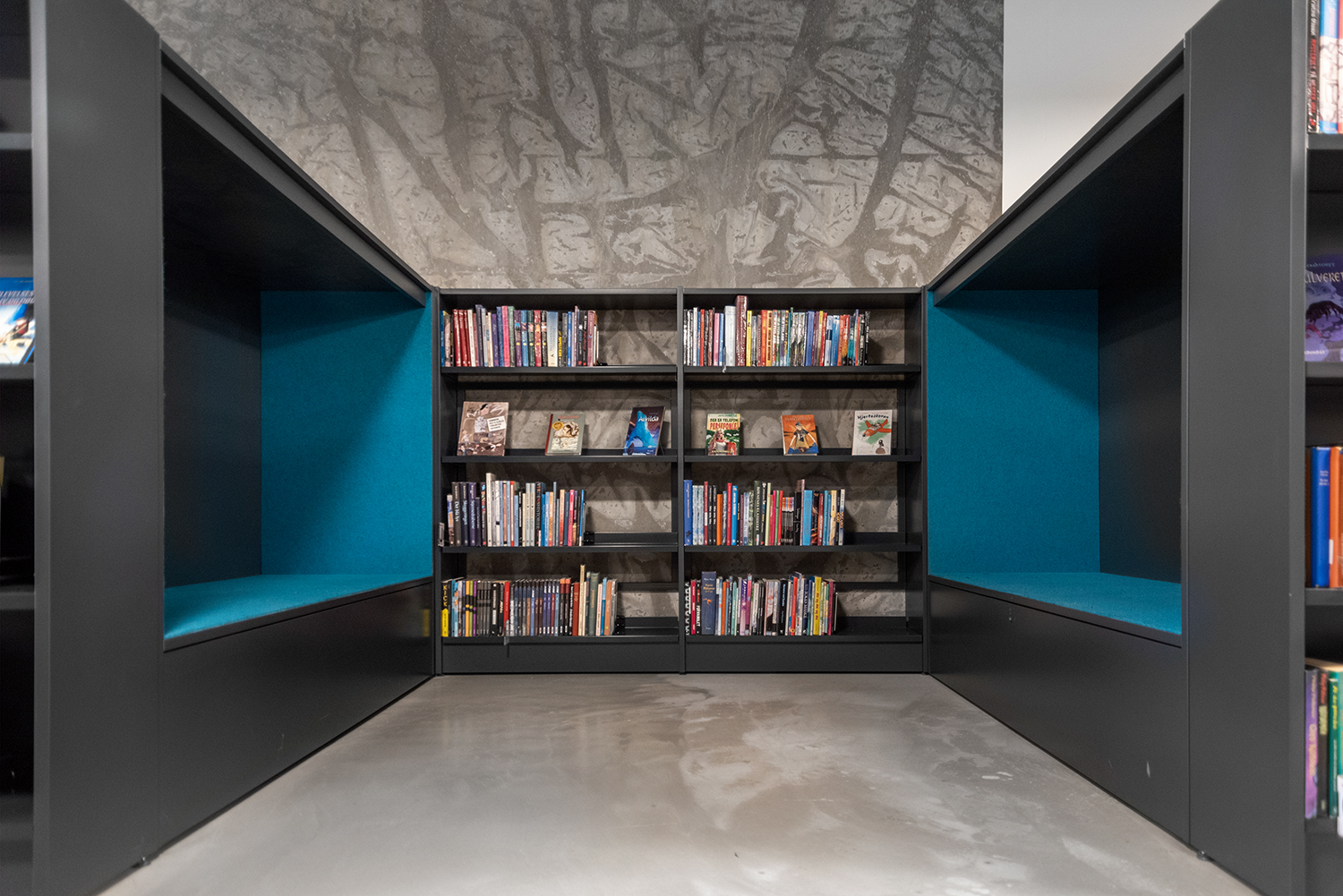The library is mainly installed with white 60/30 steel shelving, including some shelving units on castors for greater flexibility. The low Frontline round wooden shelving softens the look of the otherwise stringent interior design, and creates several seating areas. The area for older children and young people incorporates seating enclosures in the grey Frontline wooden units, inviting quiet contemplation and concentration.