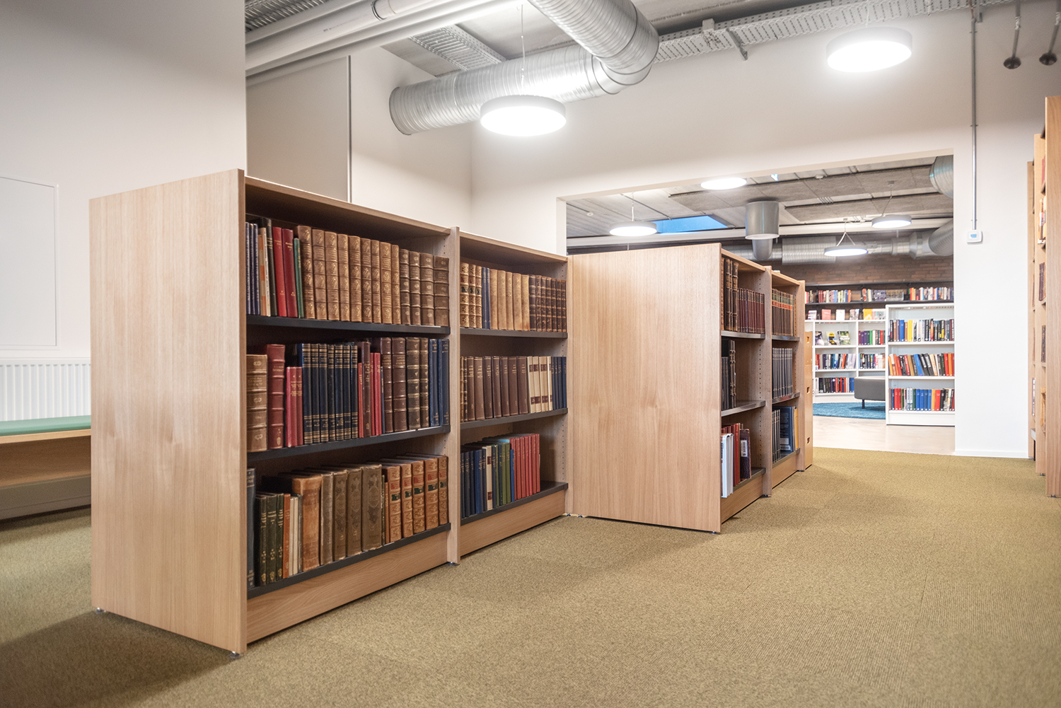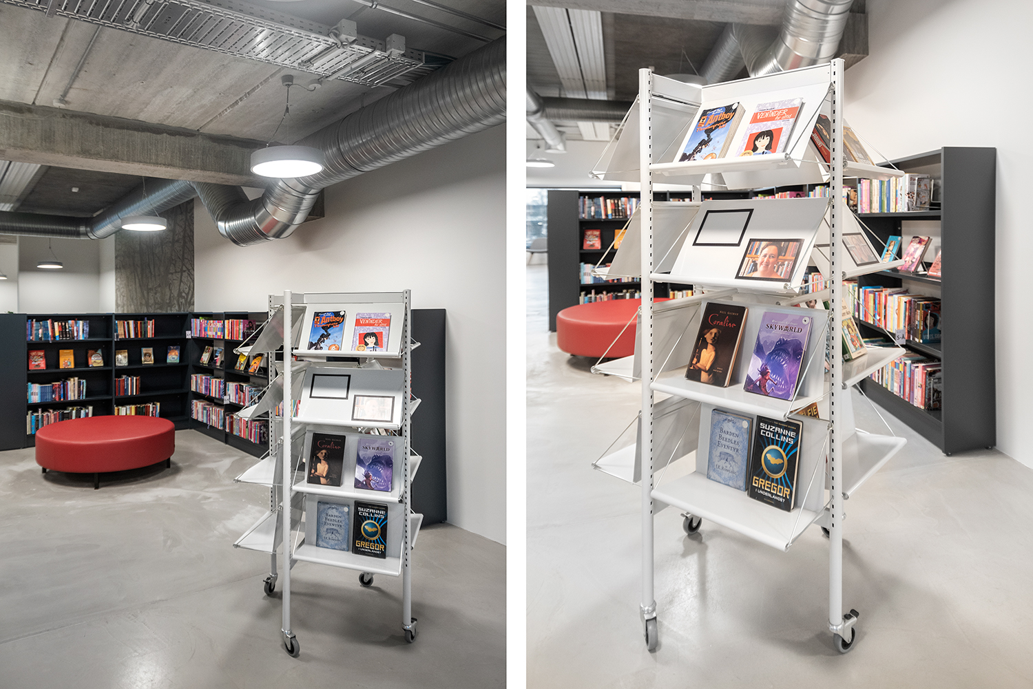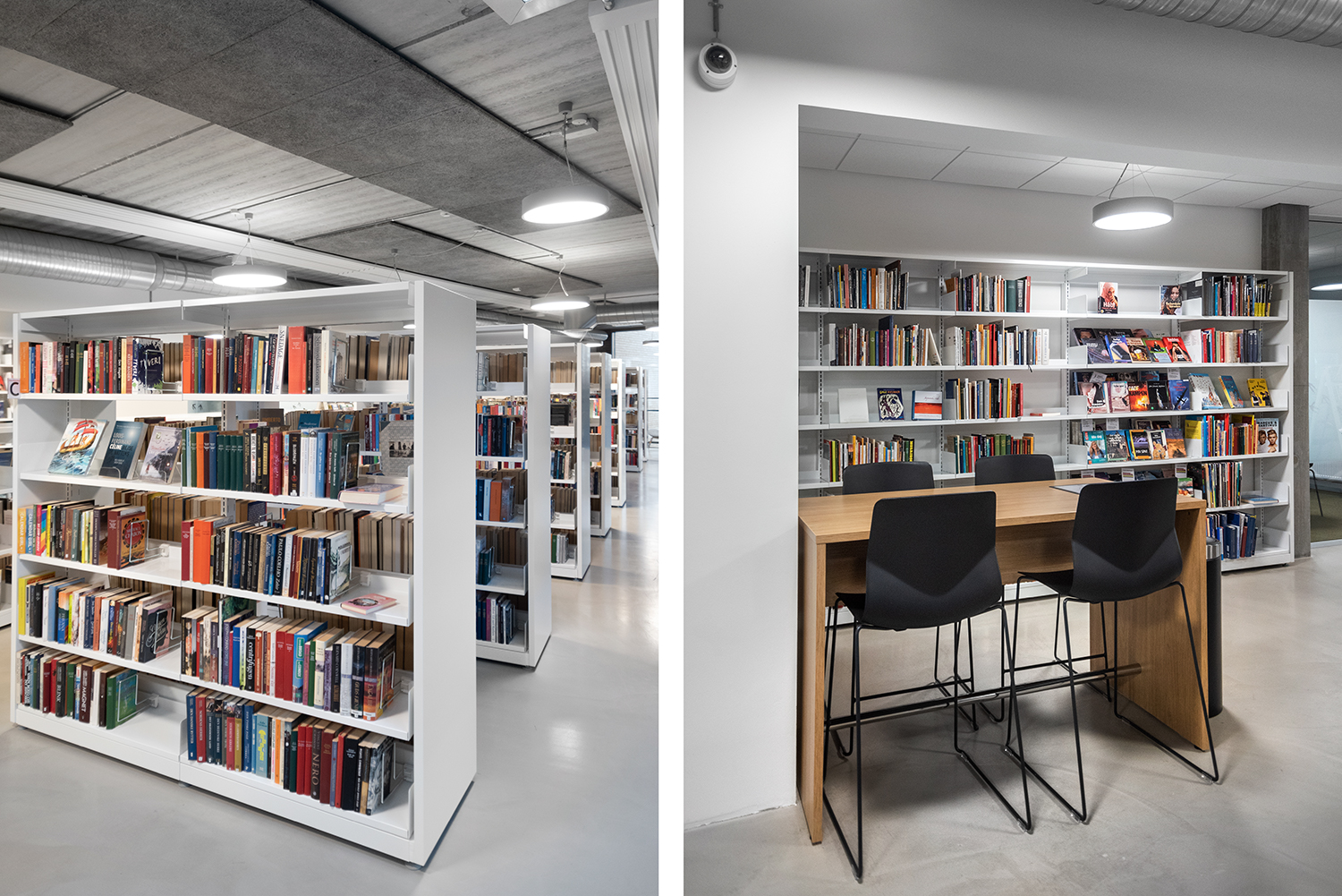 The library is mainly installed with white 60/30 steel shelving, including some shelving units on castors for greater flexibility. The low Frontline round wooden shelving softens the look of the otherwise stringent interior design, and creates several seating areas. The area for older children and young people incorporates seating enclosures in the grey Frontline wooden units, inviting quiet contemplation and concentration.