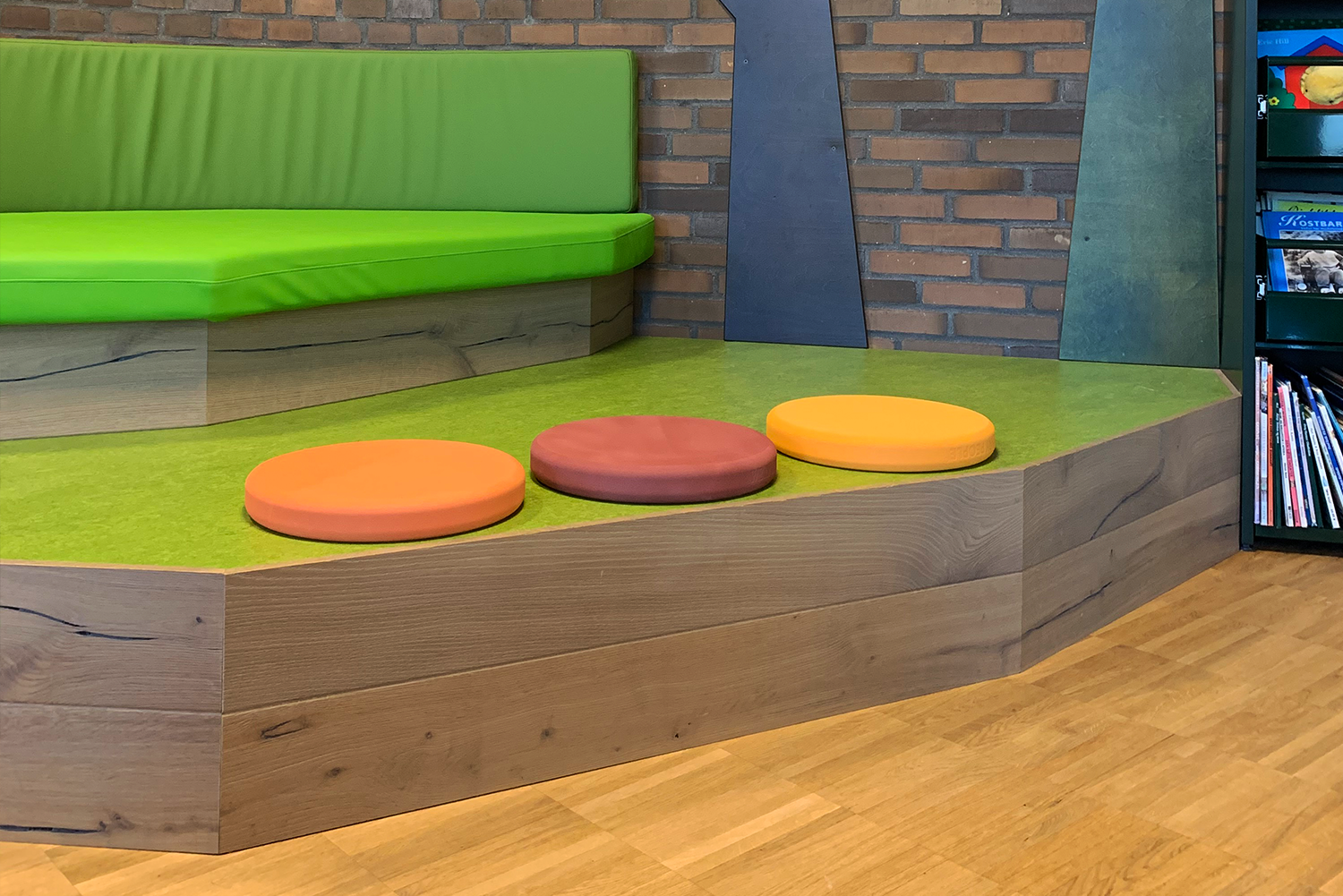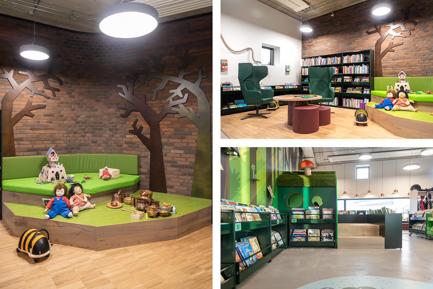 Designed as an enchanted forest, the mood of the children’s area is enhanced by the choice of furniture and colours, which together create a captivating atmosphere. The green book browsers encourage children to explore the world of books for reading and play in the heart of the forest among trees and mushrooms. Or they can embark on an adventurous boat trip down the Kongeåen river.