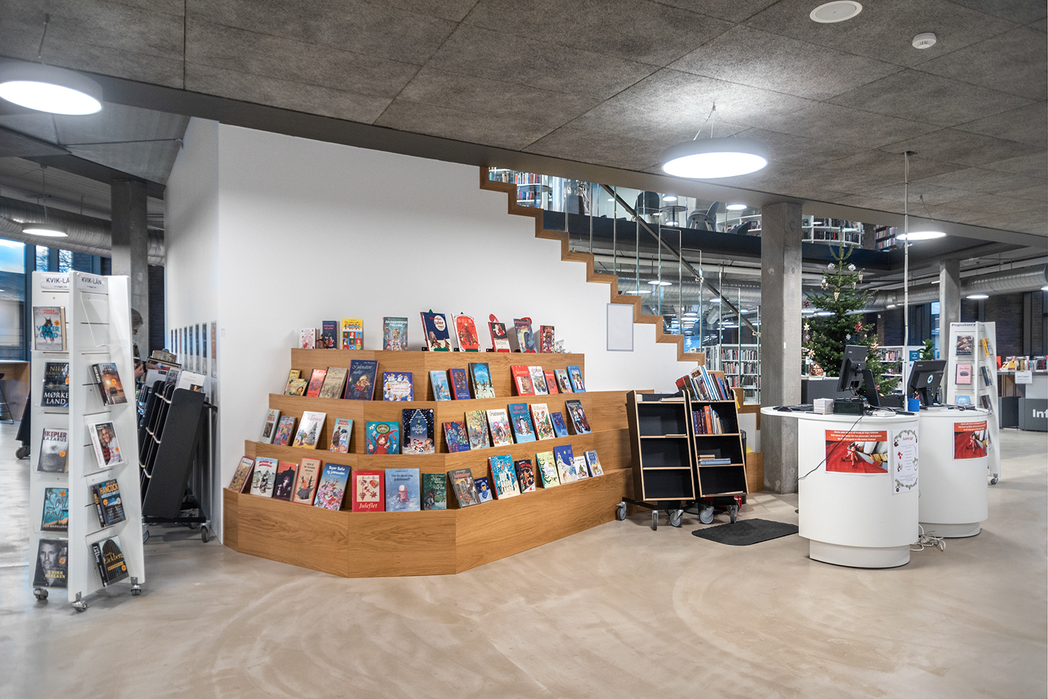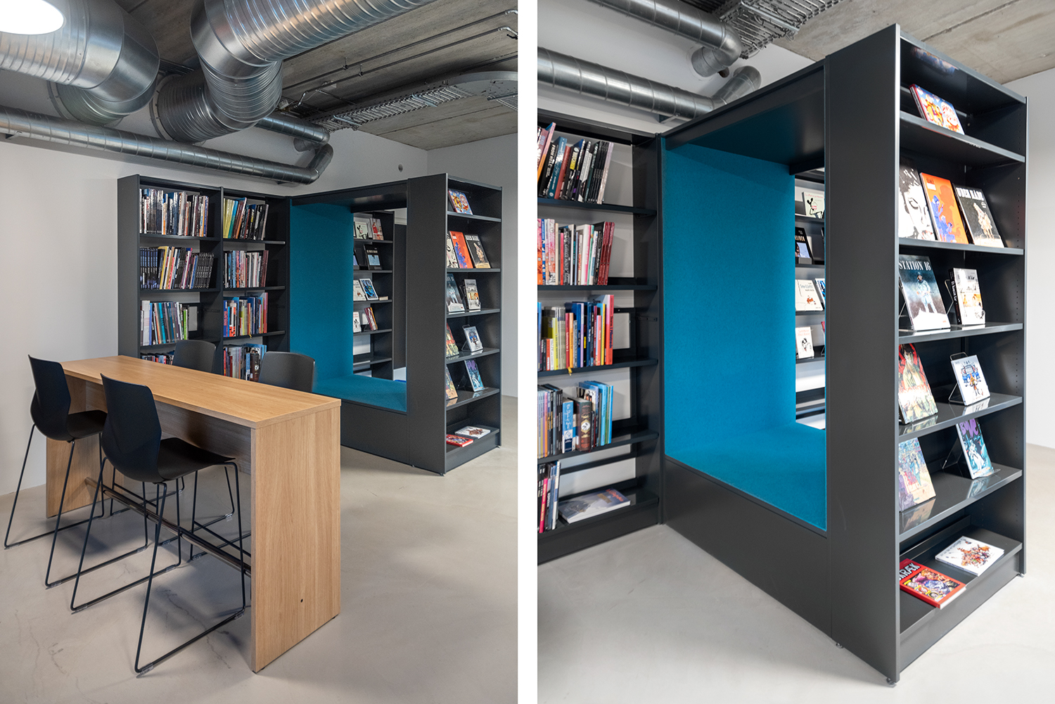 A number of small shelving units and display stands in oak have been dotted around the library, adding a delicate and warm contrast to the raw concrete floors and industrial ceilings.