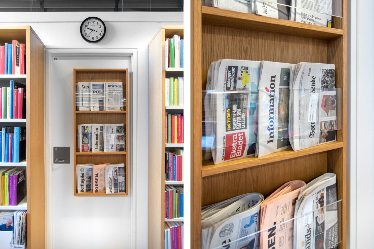 The entire library is wrapped in oak shelving systems with new top plates which constitutes a nice and comfortable place to stay. The warm wooden materials and colours originate from nature and creates a pleasant atmosphere for patients.