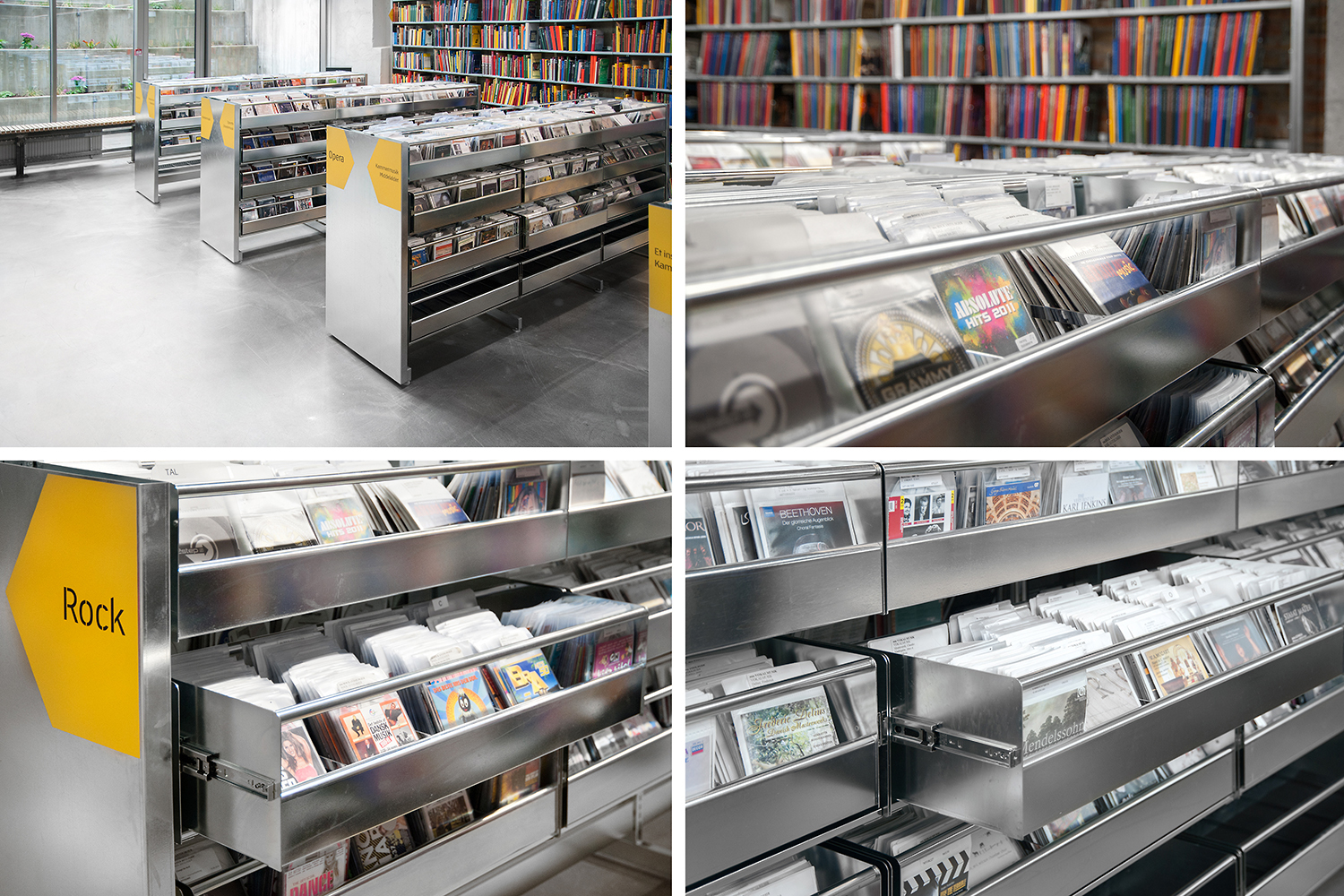The building has four floors, the ground floor is the framework for the librarys primary services such as lending, culture, homework, scene, children's library and café. Meeting facilities and administration are located on the top two floors. The lower floor is called "The Deep", and here 90% of the library books are placed.