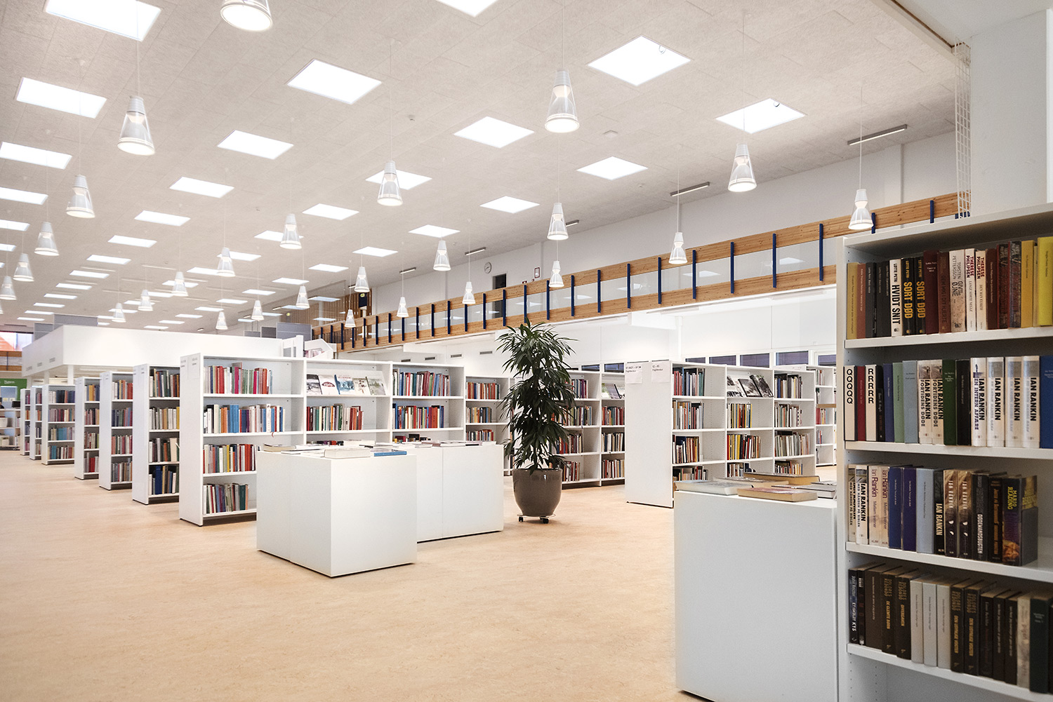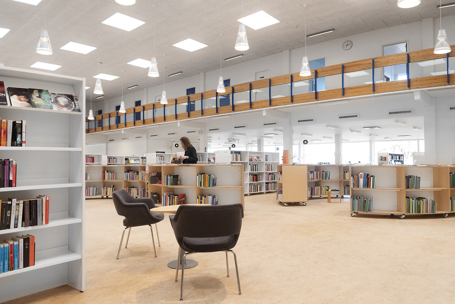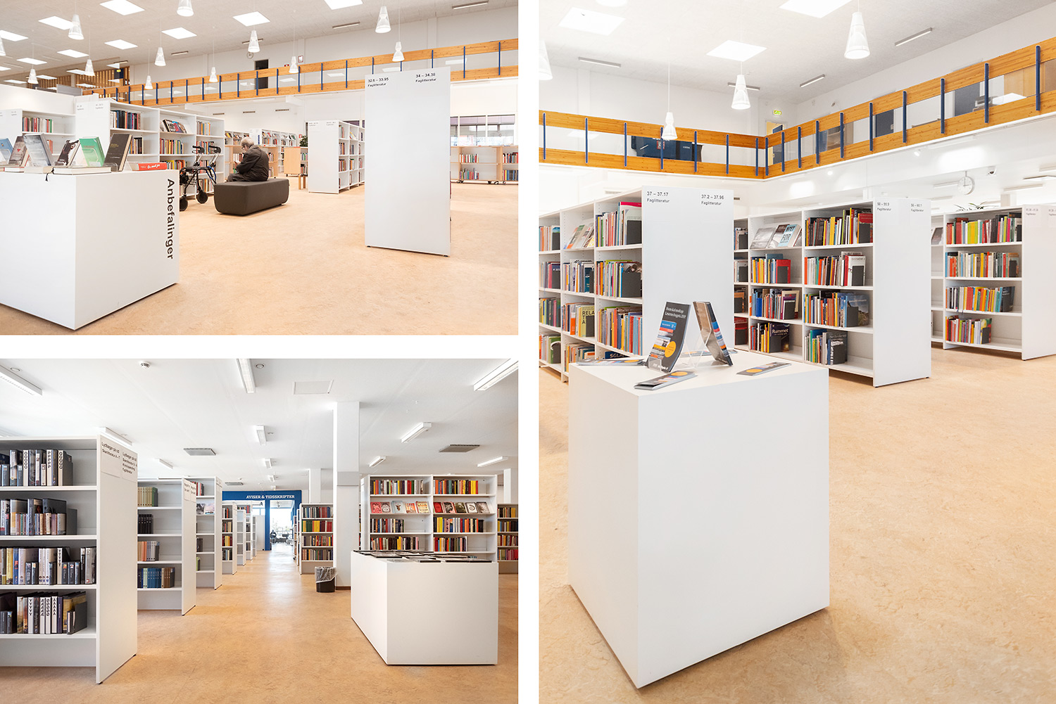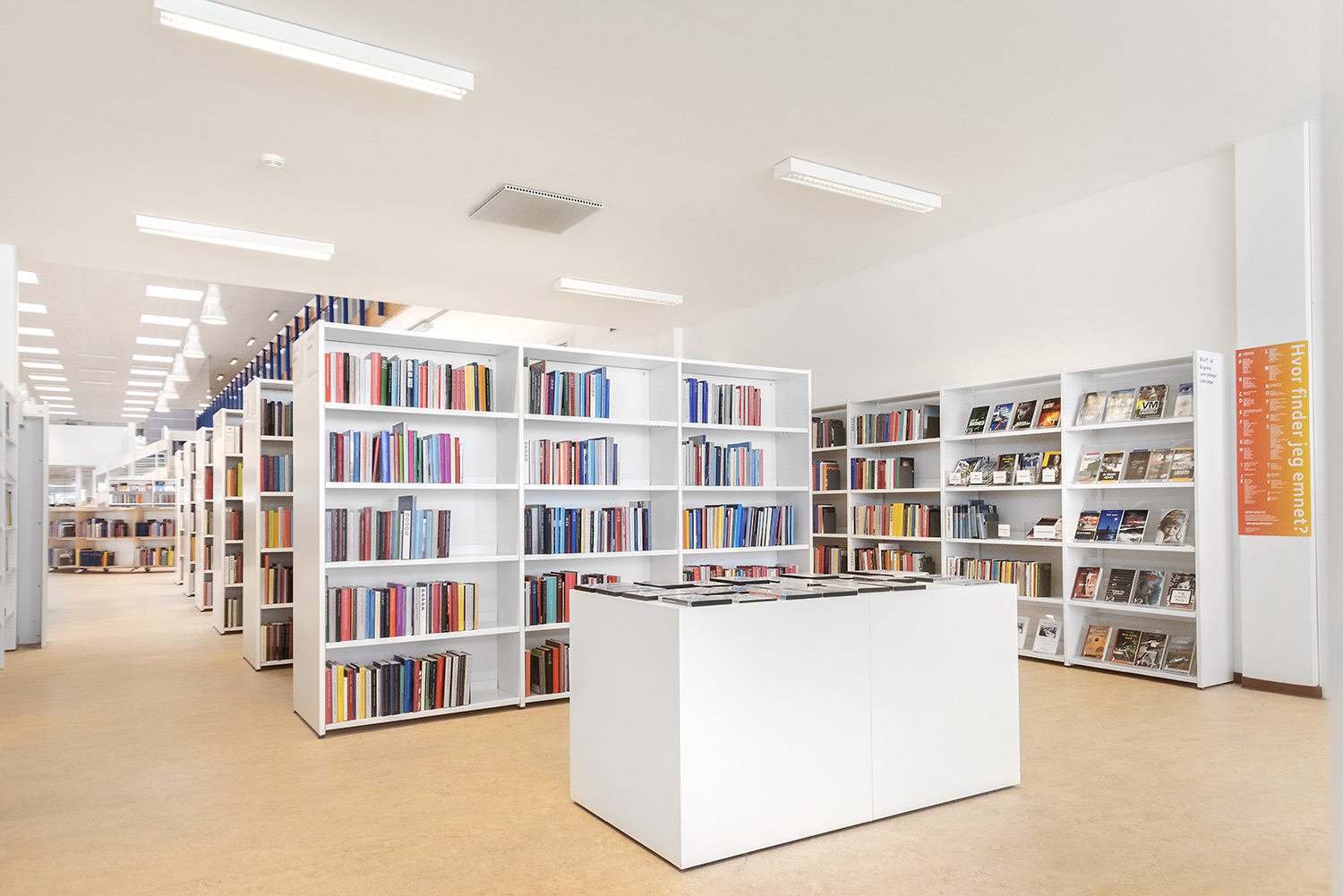 Hvidovre library now also has unmanned opening hours, which makes new demands on the interior design. Low, white shelving makes the room uncluttered and accommodating. Now you can easily see all the way to the large window surfaces where you find room for stay and study.