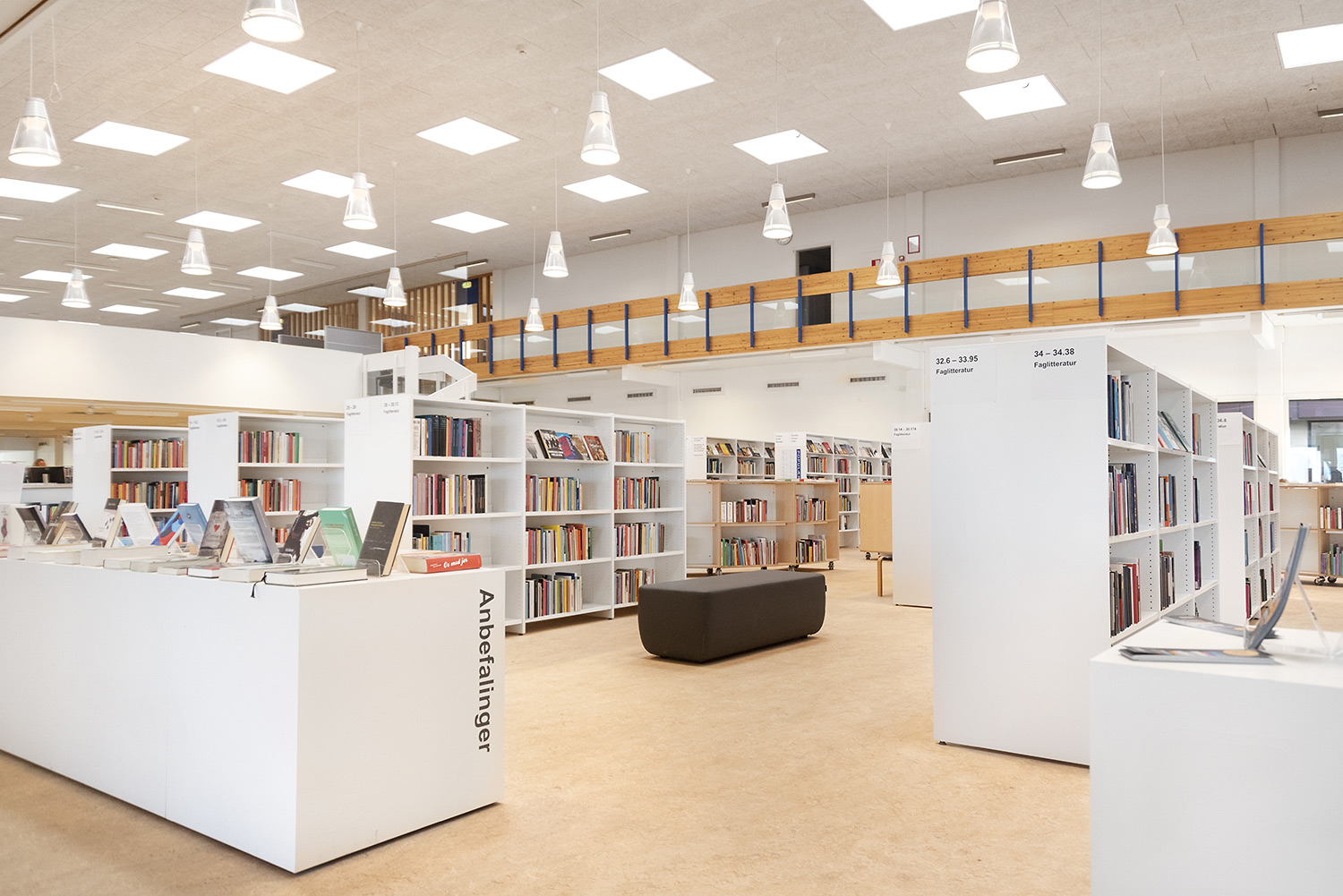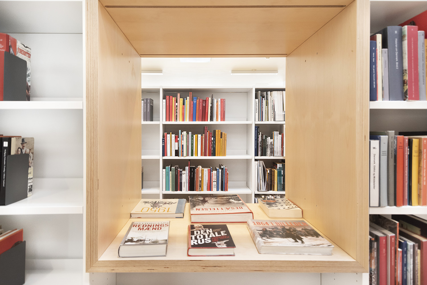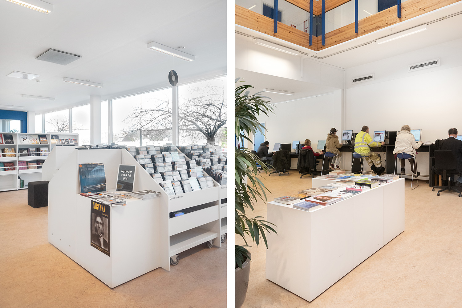 Hvidovre library now also has unmanned opening hours, which makes new demands on the interior design. Low, white shelving makes the room uncluttered and accommodating. Now you can easily see all the way to the large window surfaces where you find room for stay and study.