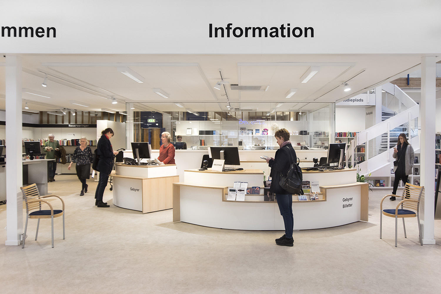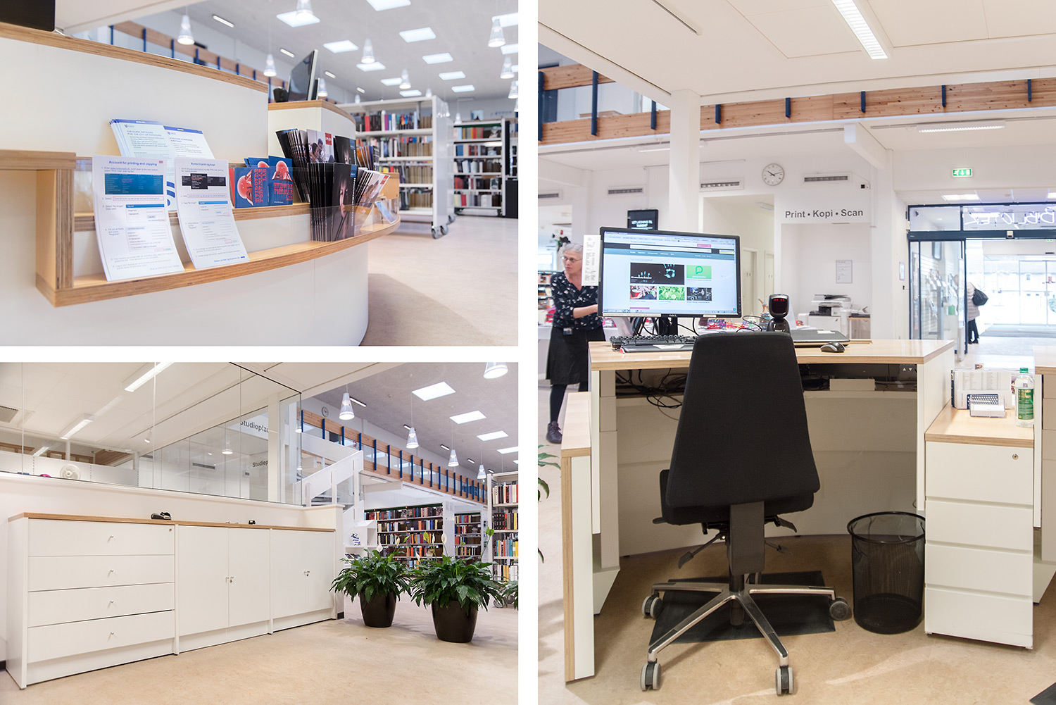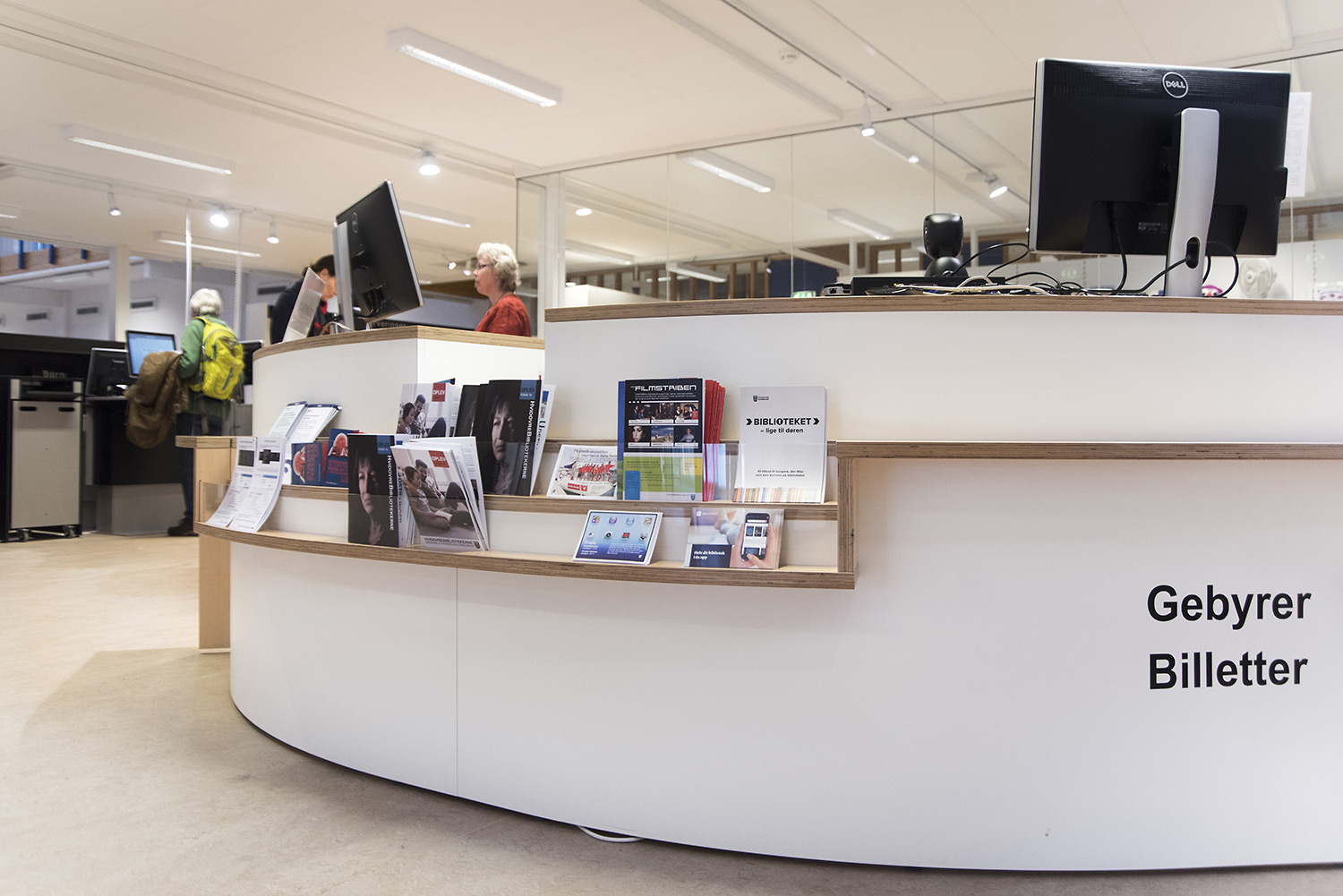 The counter also has a curved shape in the same light and natural material. It has moved into the room, thereby welcoming the users better. Behind the counter there is room for sorting books.