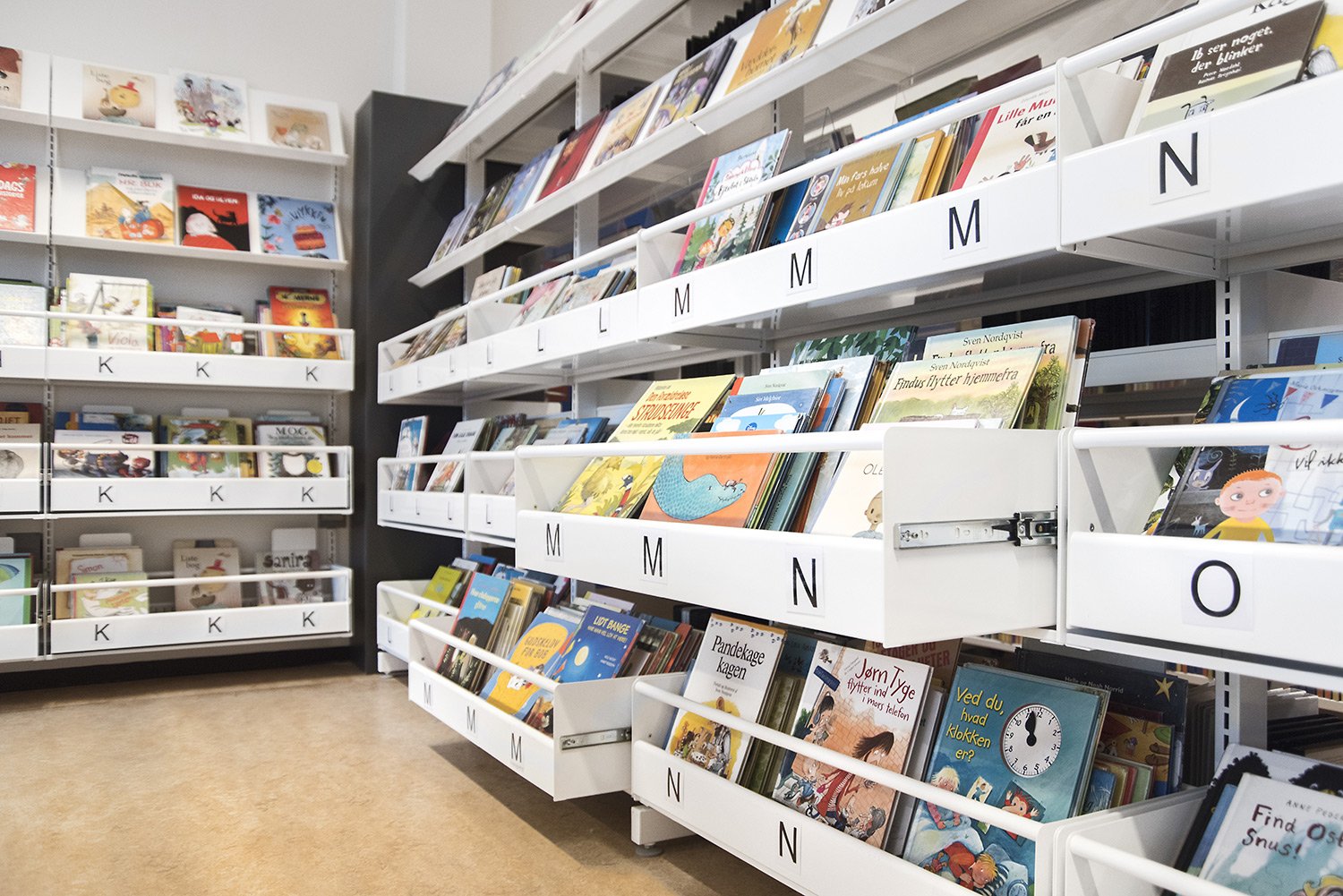 In the children’s area most shelfs have been replaced with browsers so that children are now greeted by front covers.