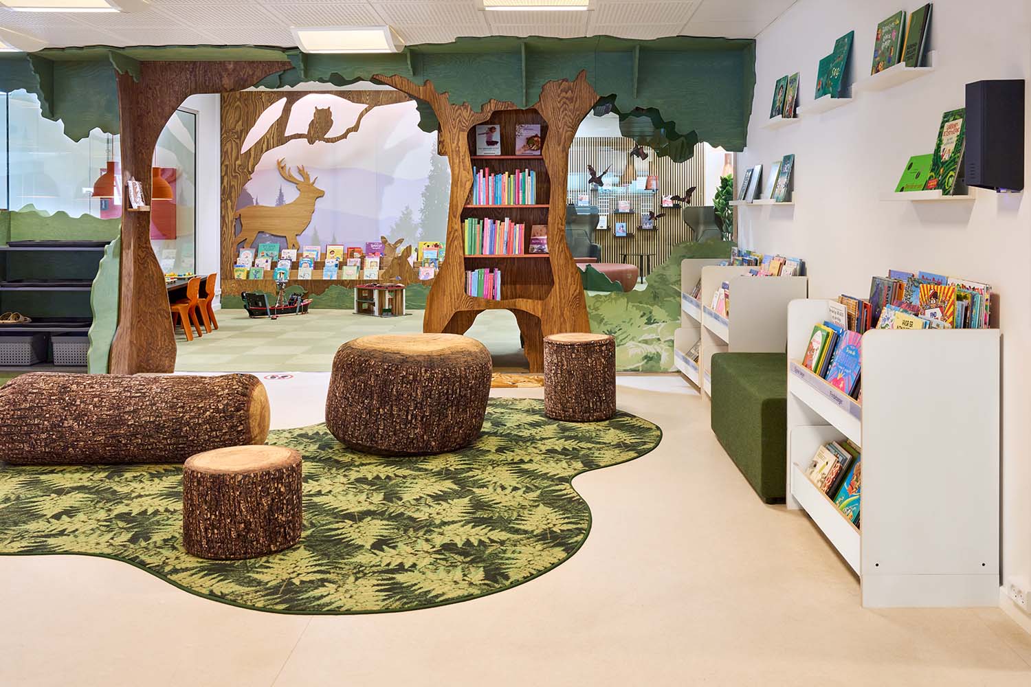 A highlight is the imaginative “reading forest” in the children’s area – complete with animal graphics, tree stump-shaped poufs, “hollow tree” shelvings and soft rugs, creating a welcoming space for storytelling, play, and discovery. The layout encourages shared reading, sensory play and curiosity and bespoke furniture from Lammhults Biblioteksdesign ensures a cohesive blend of function and aesthetics.