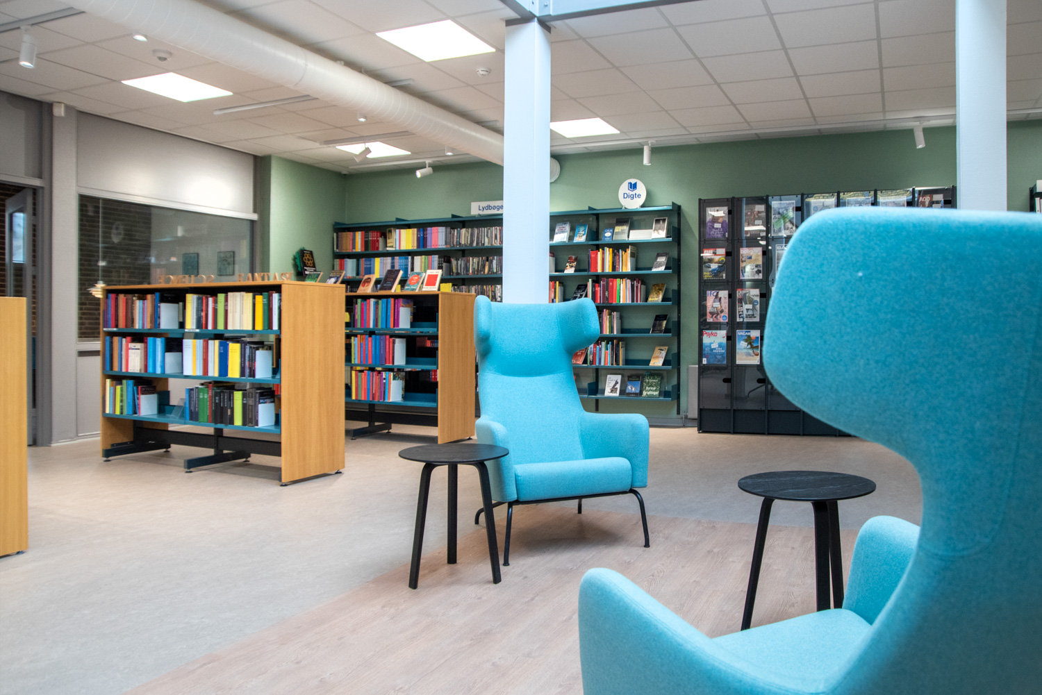 The library is built on the values of recycling and sustainability which is why the building has been renovated and the old shelving systems have been recycled. An architect has been in charge of the renovation while Lammhults Biblioteksdesign has been responsible for picking out wall colours and the overall interior. By modernizing the shelving systems with new panels and placing the blue and read shelving systems strategically on the new red floors, the library appears inviting with its unique colour scheme.