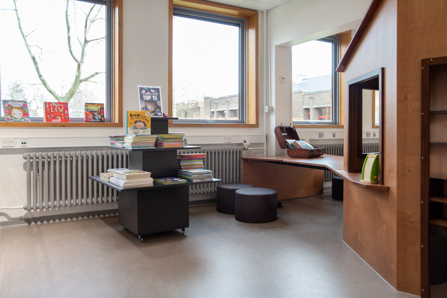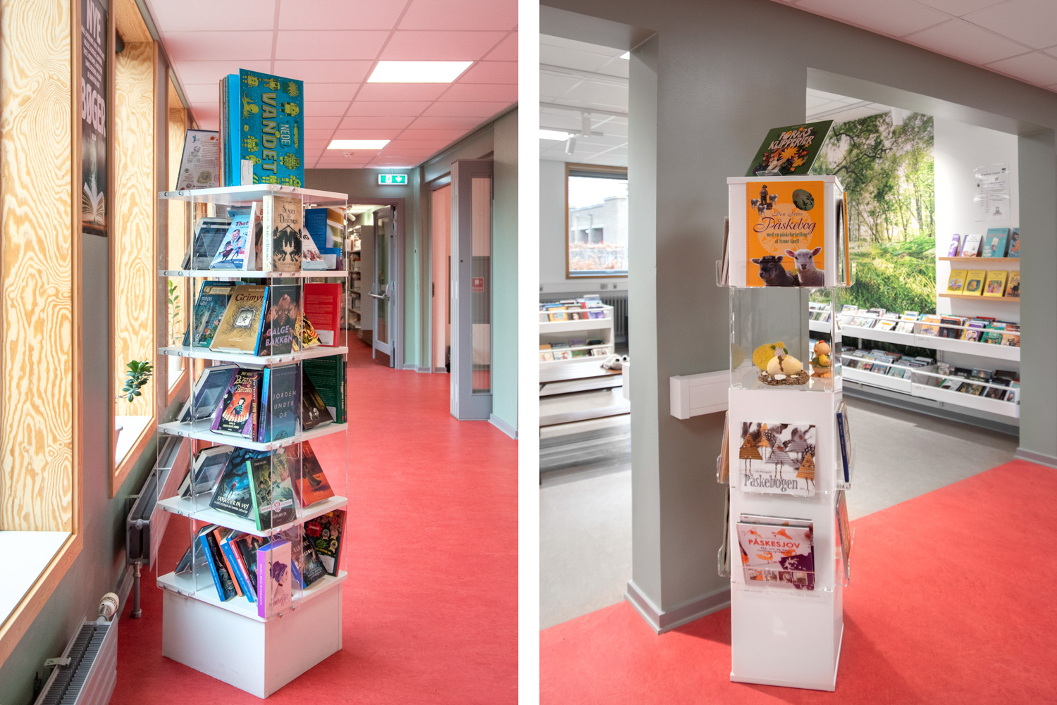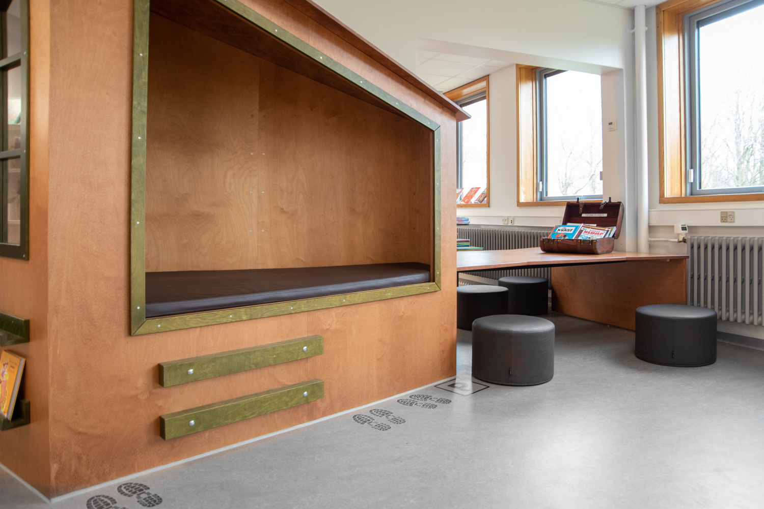The entrance is transformed into a lively lounge area with wall foil that clearly points you in the direction of the gym or the library. In the children’s department, the wall foil makes it seem like you are stepping into the forest. The small tree trunks provide seating and the cottage a small space, where the children can sit undisturbed and immerse themselves in the world of books.