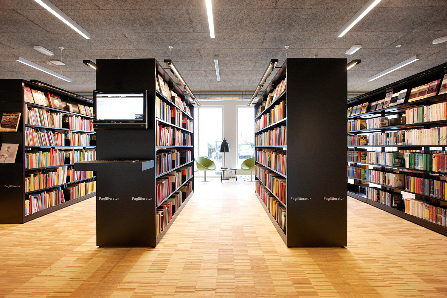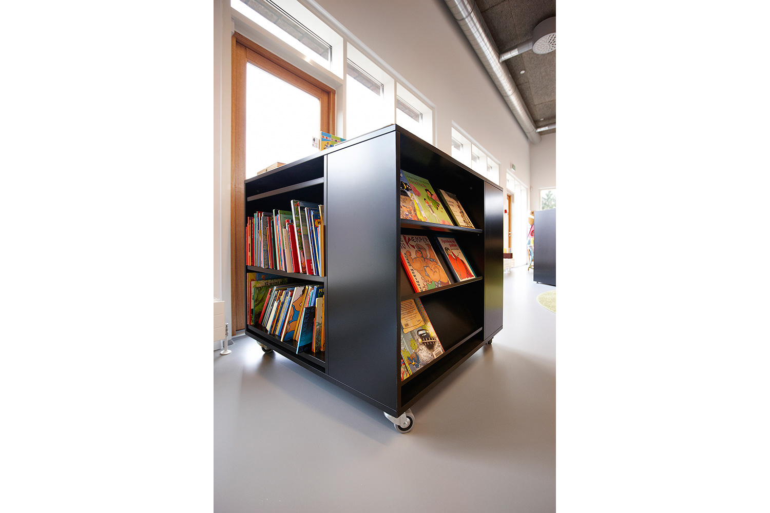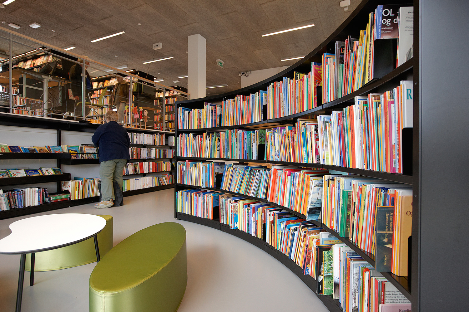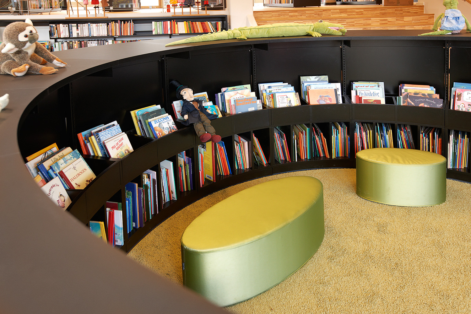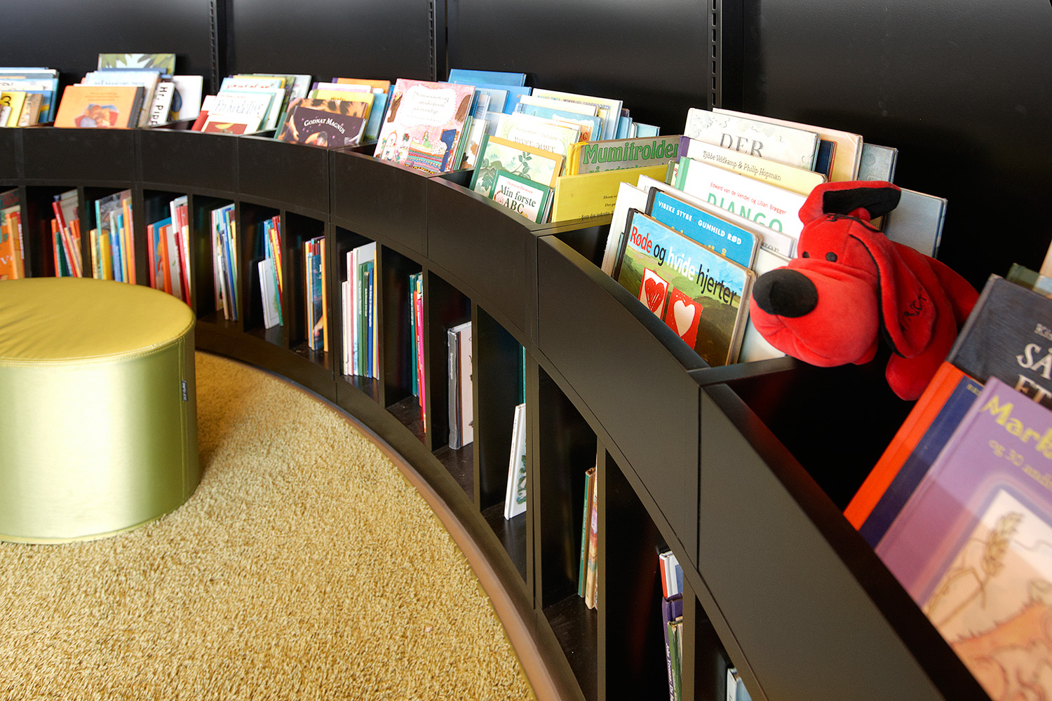 The library is furnished with the Classic Steel Shelving System, London end panel and canopy, and built-in Book Big Lighting. There are also special-made solutions like the integrated tables at the ends of the shelving and the round picture book browsers in the children’s area.