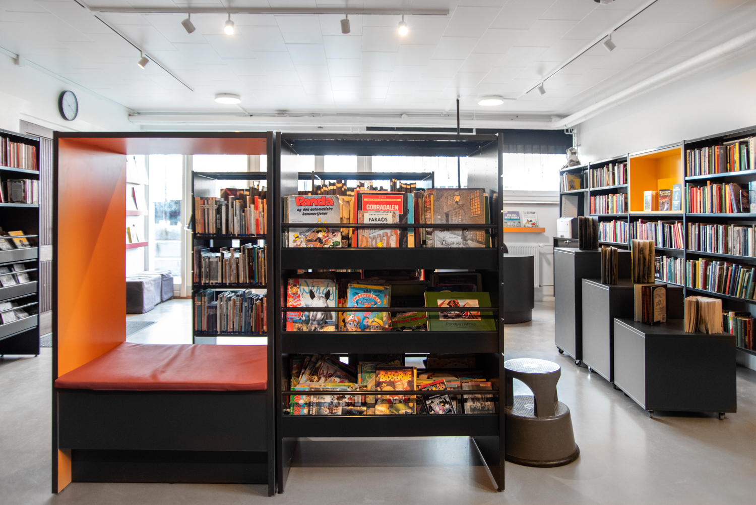 This 60 m2 small school library is located in the basement at Sankt Knud Lavard School in Lyngby. Almost 200 pupils attend the school, and the library plays a central part in creating a social gathering place, that can be used for several activities.