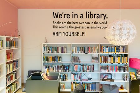 The library stands out with its decorative elements that creates a playful and biophilic expression. At the same time, the library blends in perfectly with the rest of the building as the colours have been chosen to support the warm colour palette of red and blue green colours that is prominent for the entire culture house.
