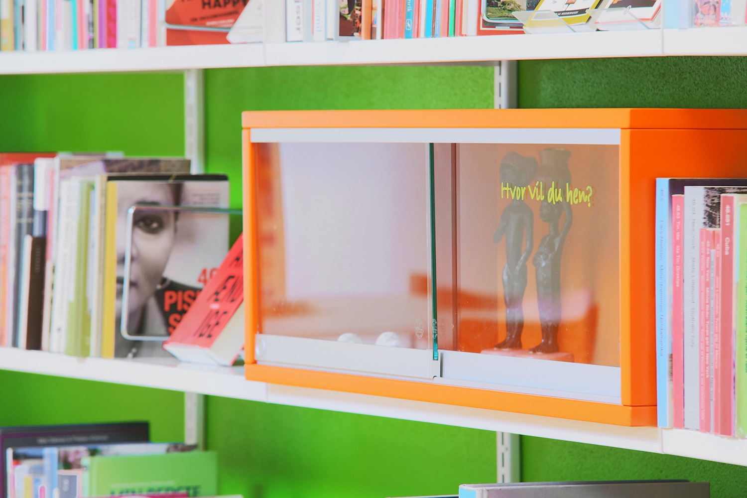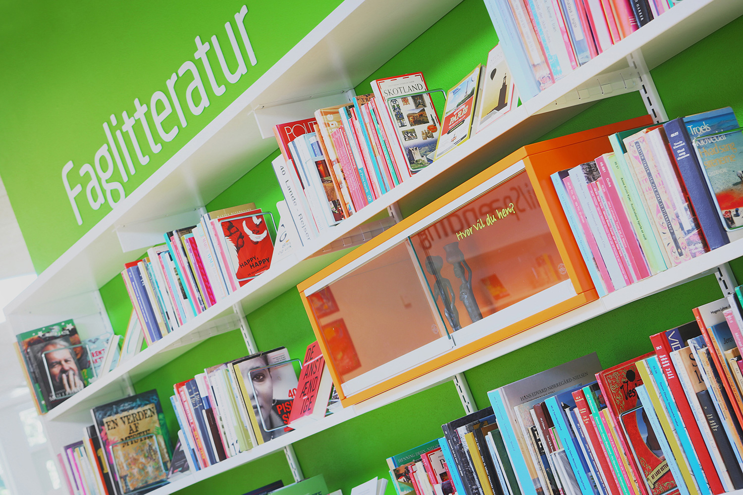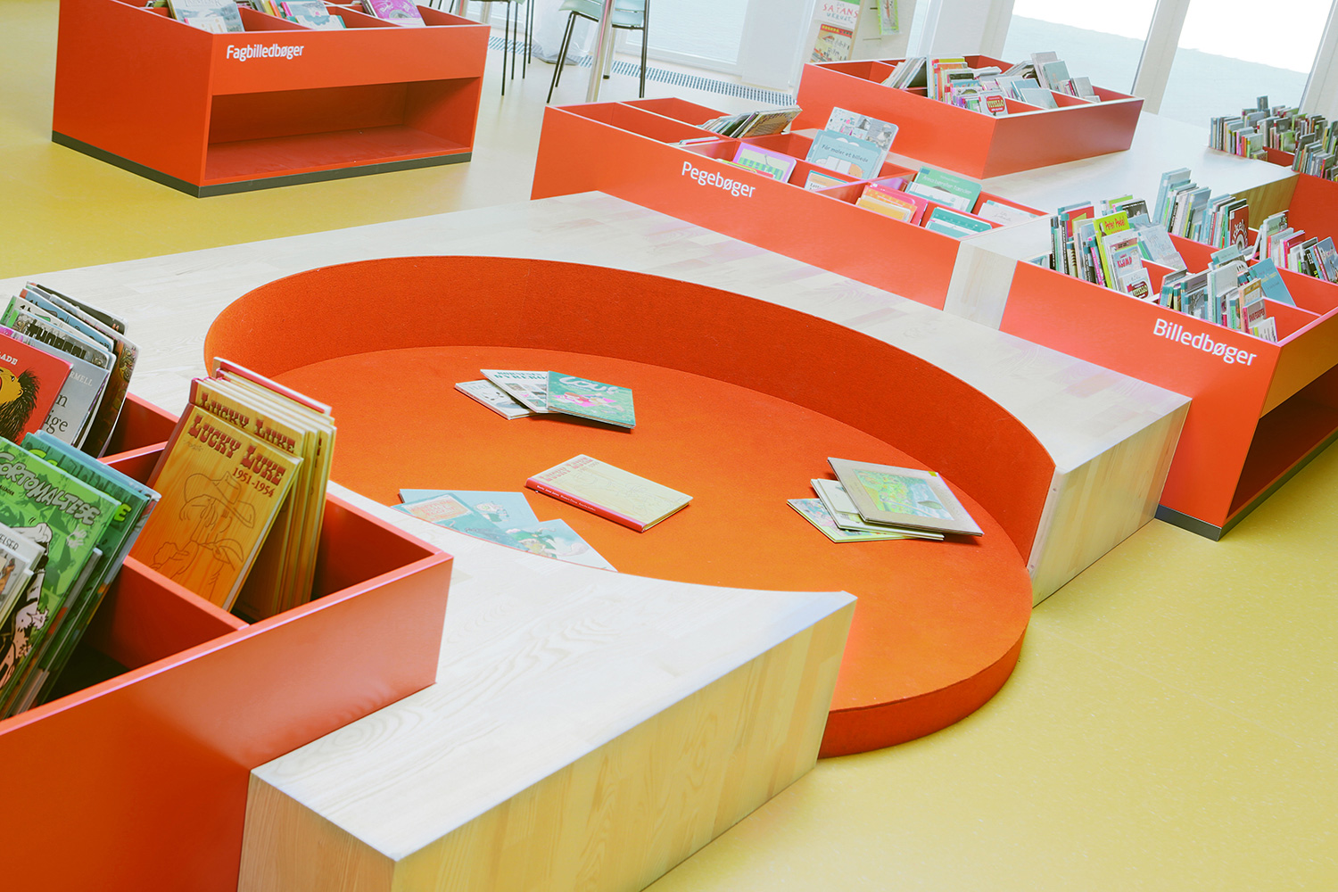 A large special designed play-sit furniture with incorporated cribs for display of children’s books can be found in the children’s zone. Wall mounted shelves in staggered heights give dynamic to the room. Mobile orange display modules are placed in the shelves to generate attention to selected topics or to create smaller special exhibitions.