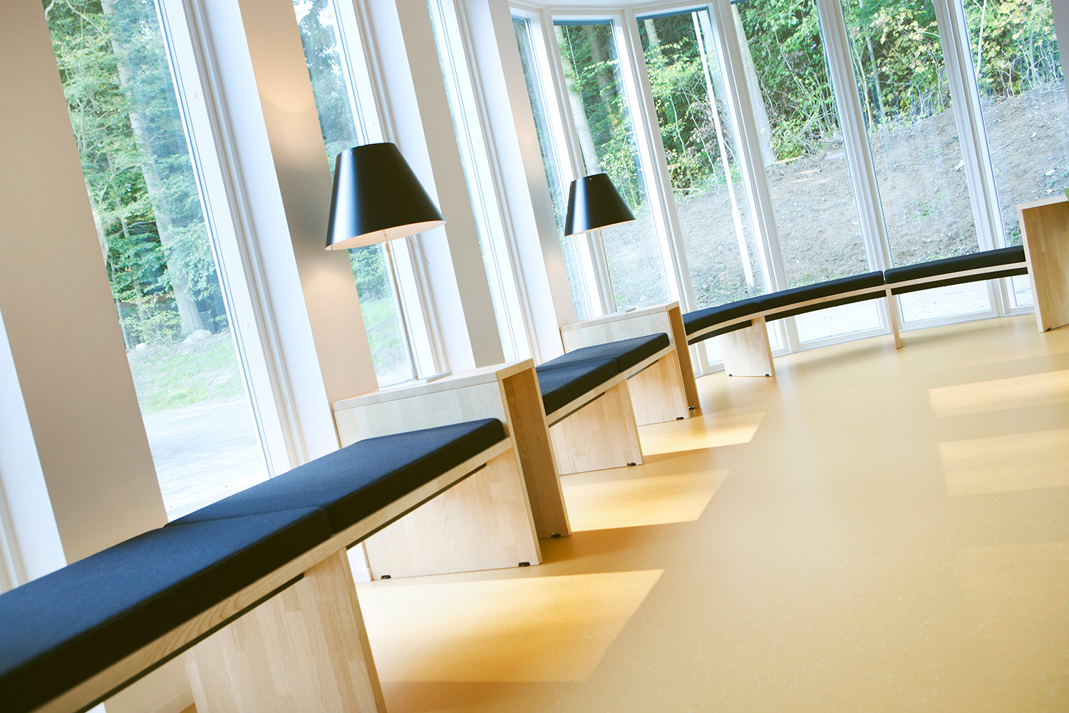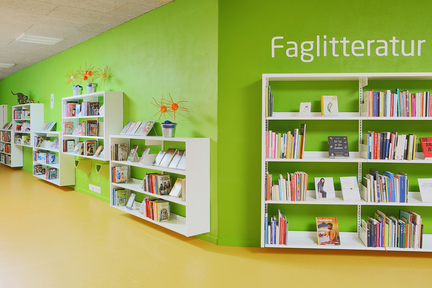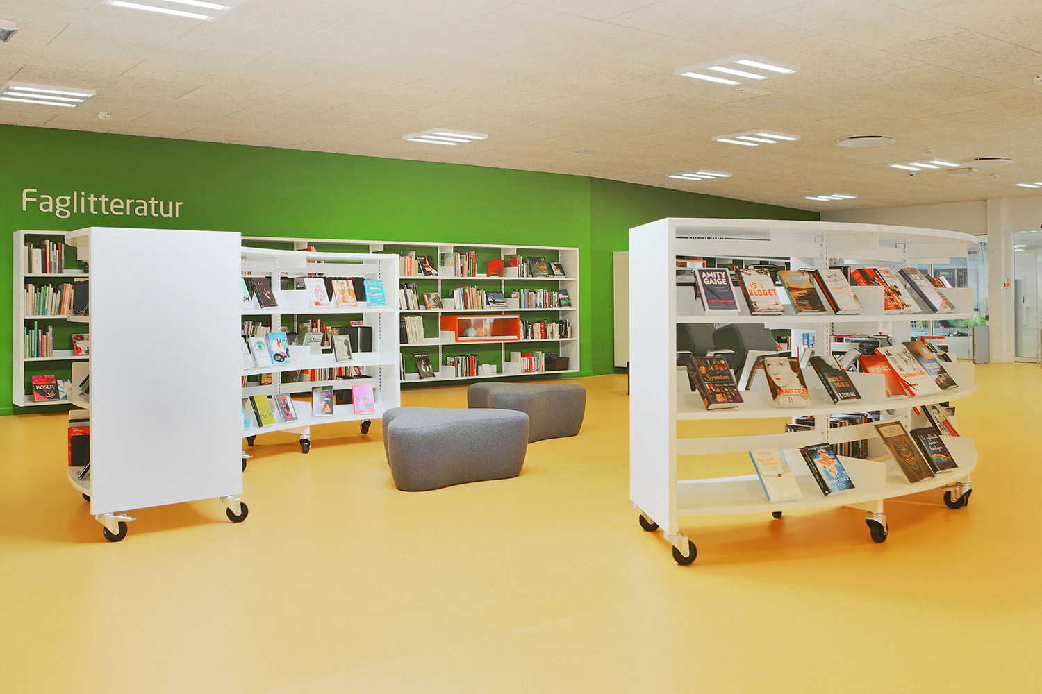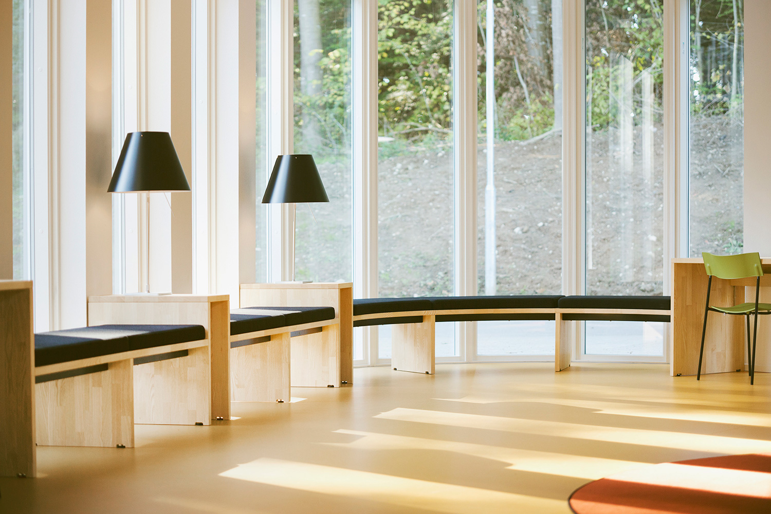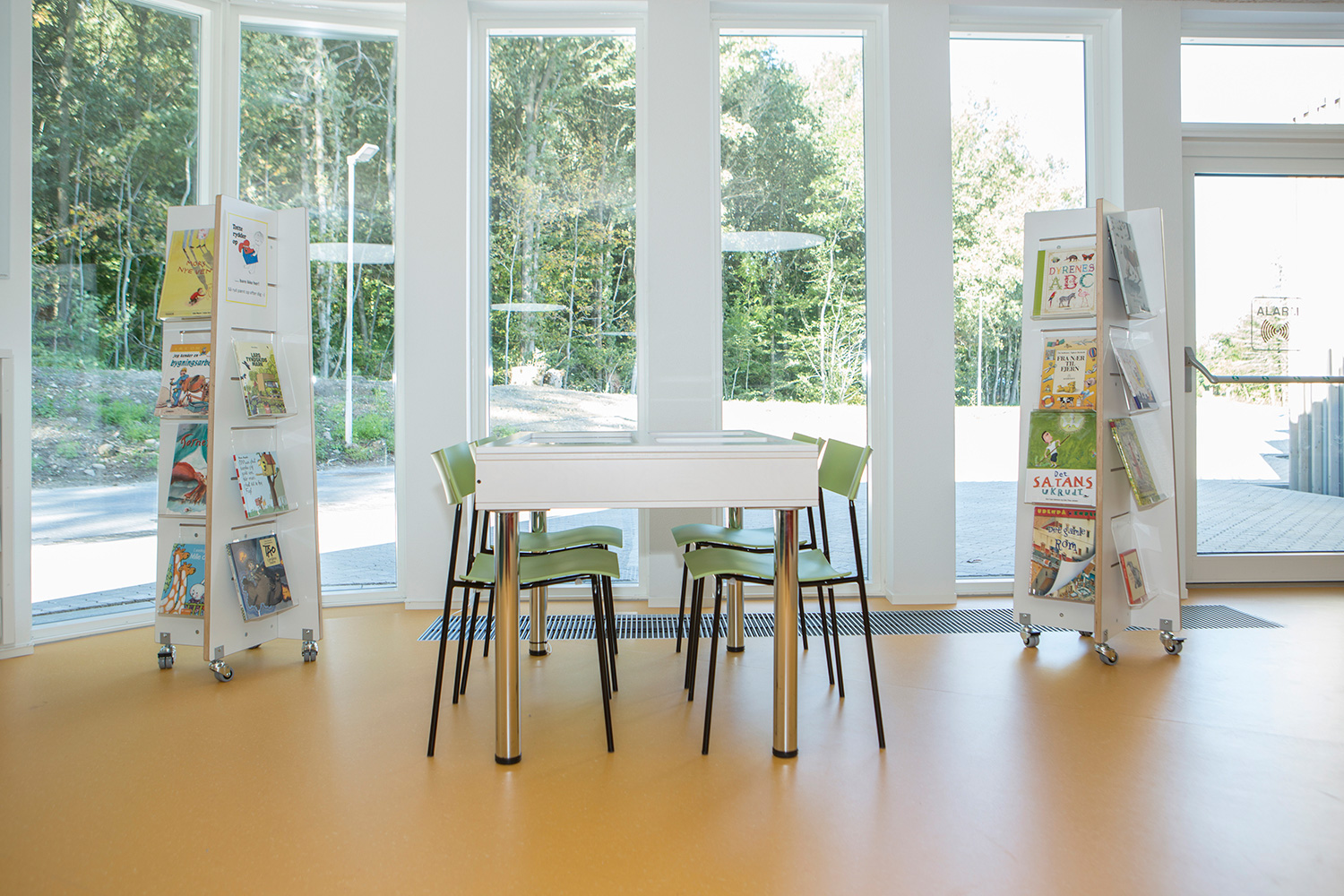 The interior designer, Lykke Jørgin, has used the nature as focal point of the interior decoration of the library. For example, specially designed furniture in ash are placed along the window sections with full utilization of the daylight. A custom-made viewing platform covered with felt gives the possibility of looking at the nature at close range. The green colours of the nature has been dragged into the library and interact good together with the additional yellow and orange colours.