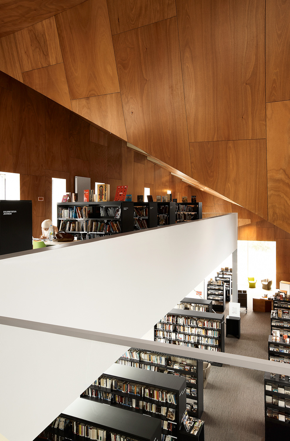On the inside, the shelving system 60/30 with London end panels and top shelves, adds functionality and contributes to making the médiathèque a powerful environment for reading and experiencing new cultural media.