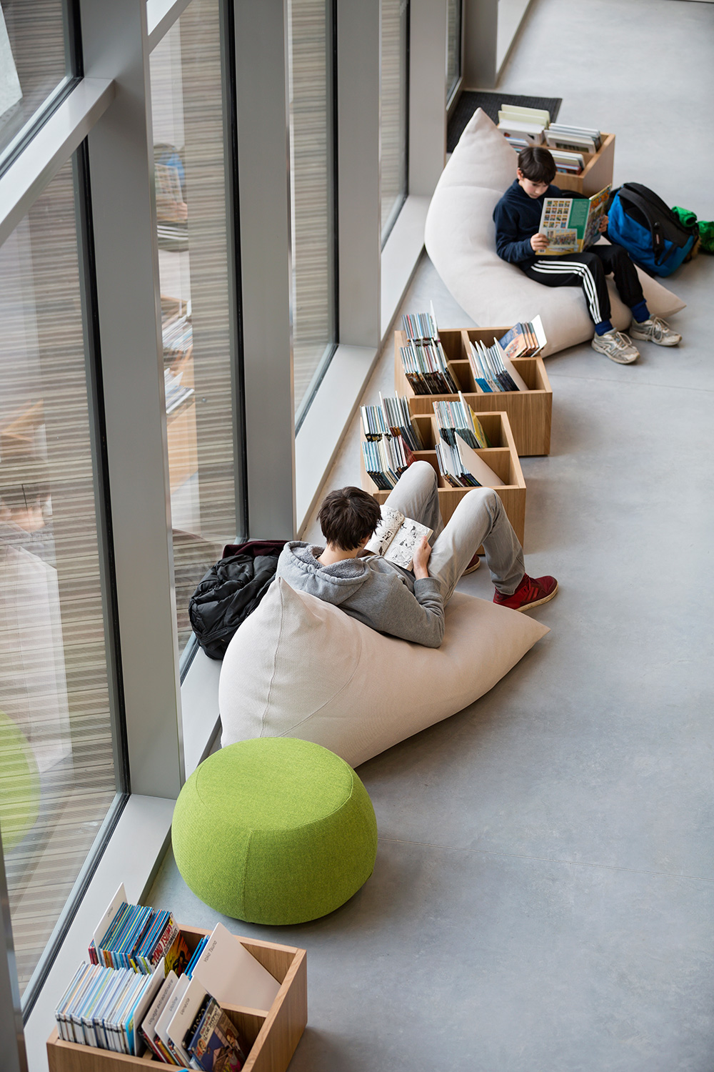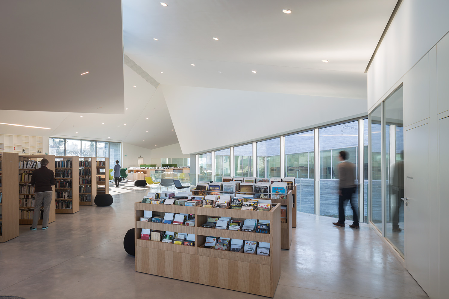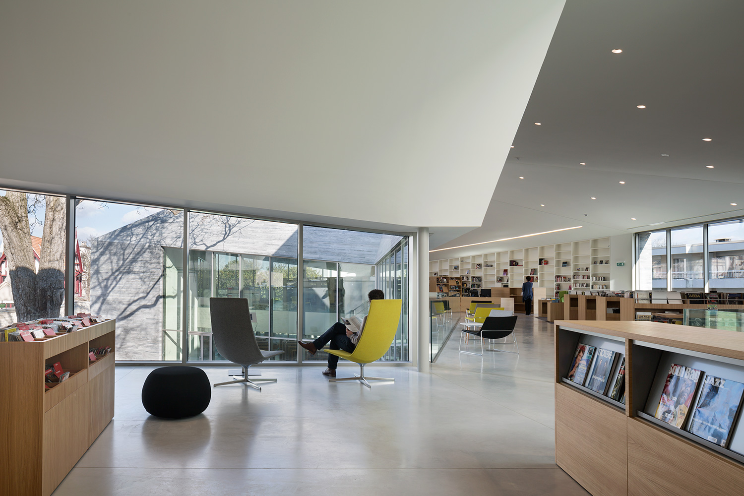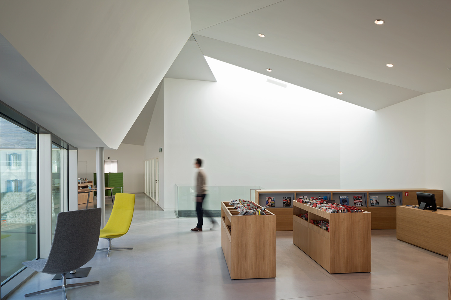 The furniture that is specifically made for this library, in oak or white lacquered for the large wall shelvings, is designed with flexibility and adaptability to future changes and developments, which also characterize the standard product range.