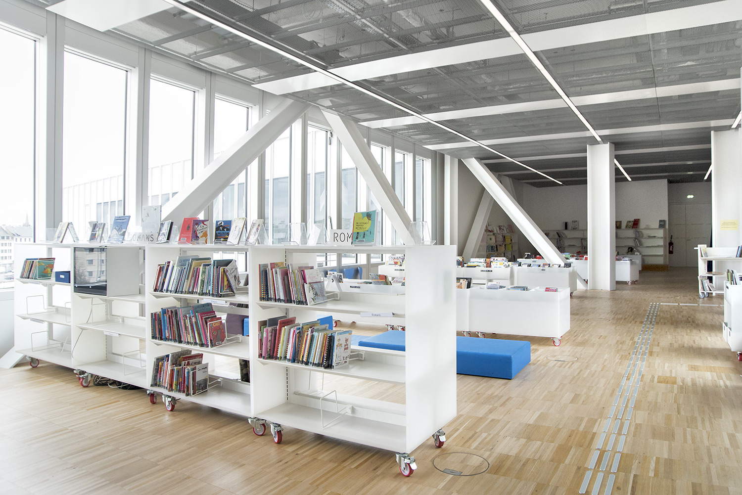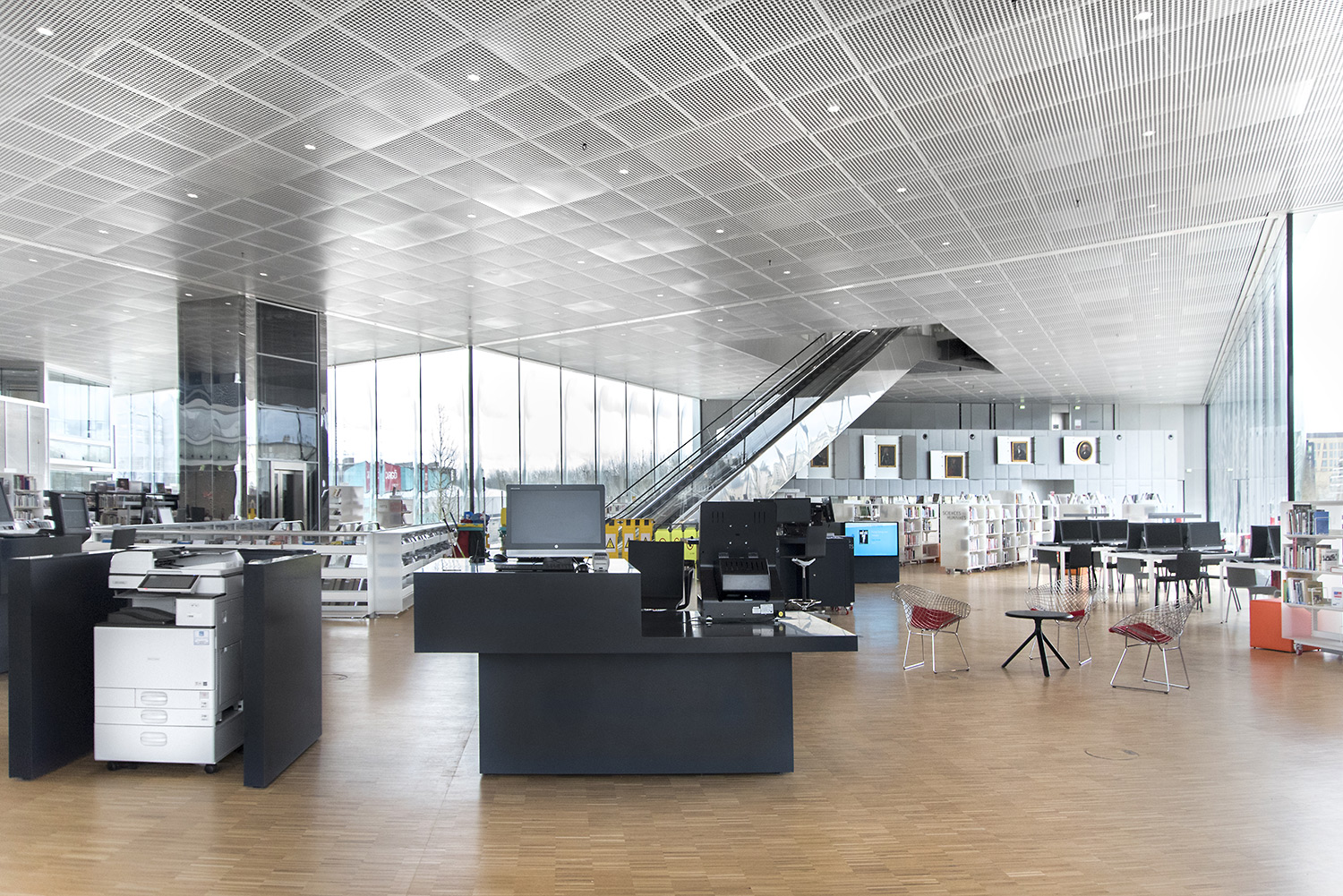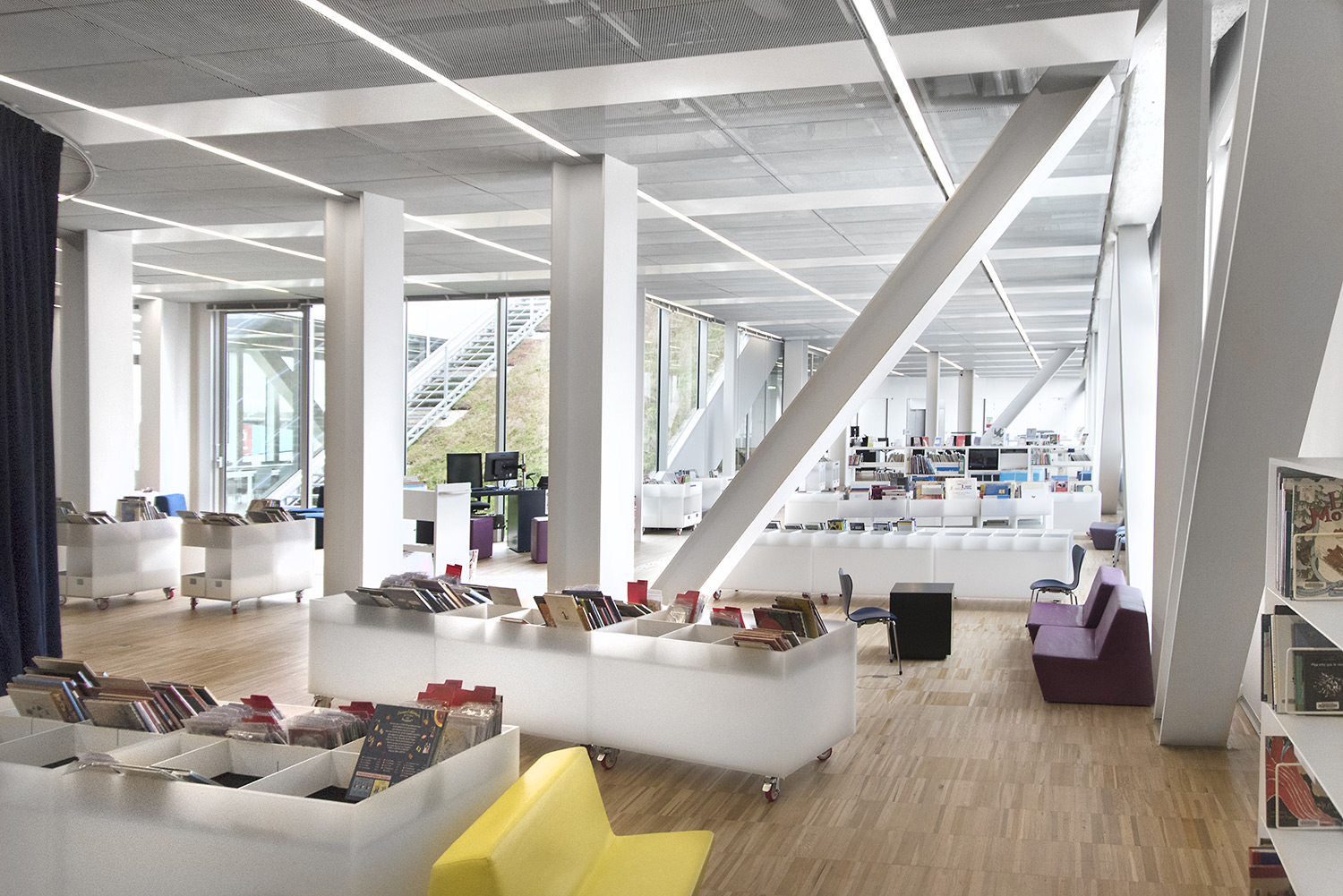 In the shape of a cross, the library houses 4 sections: arts in the east wing, social sciences in the south, literature in the west and sciences and technical sciences in the north. It will also offer new services, in particular an auditorium, exhibition areas, a cafe/restaurant and much more.