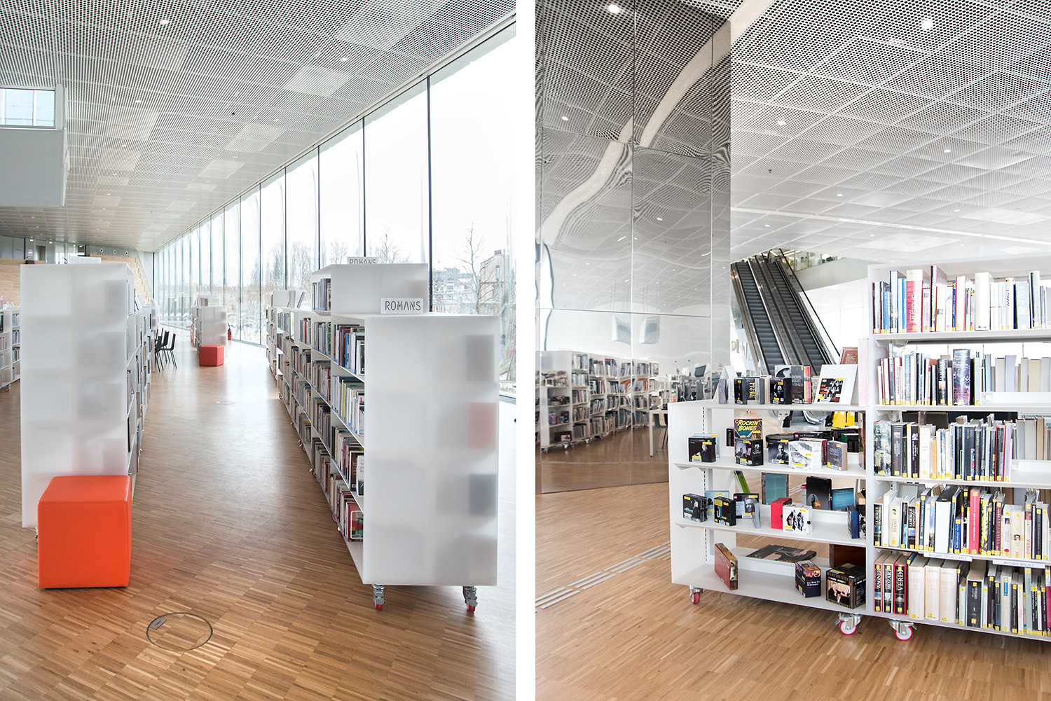 The glass façade links the park on one side with the pedestrian area on the other side and the two large entrances on both sides create a connection and an interaction with the surrounding area. The library’s key position, being placed in between the historical part and the new district of the town, has met the citizen’s request for a new, central meeting point.