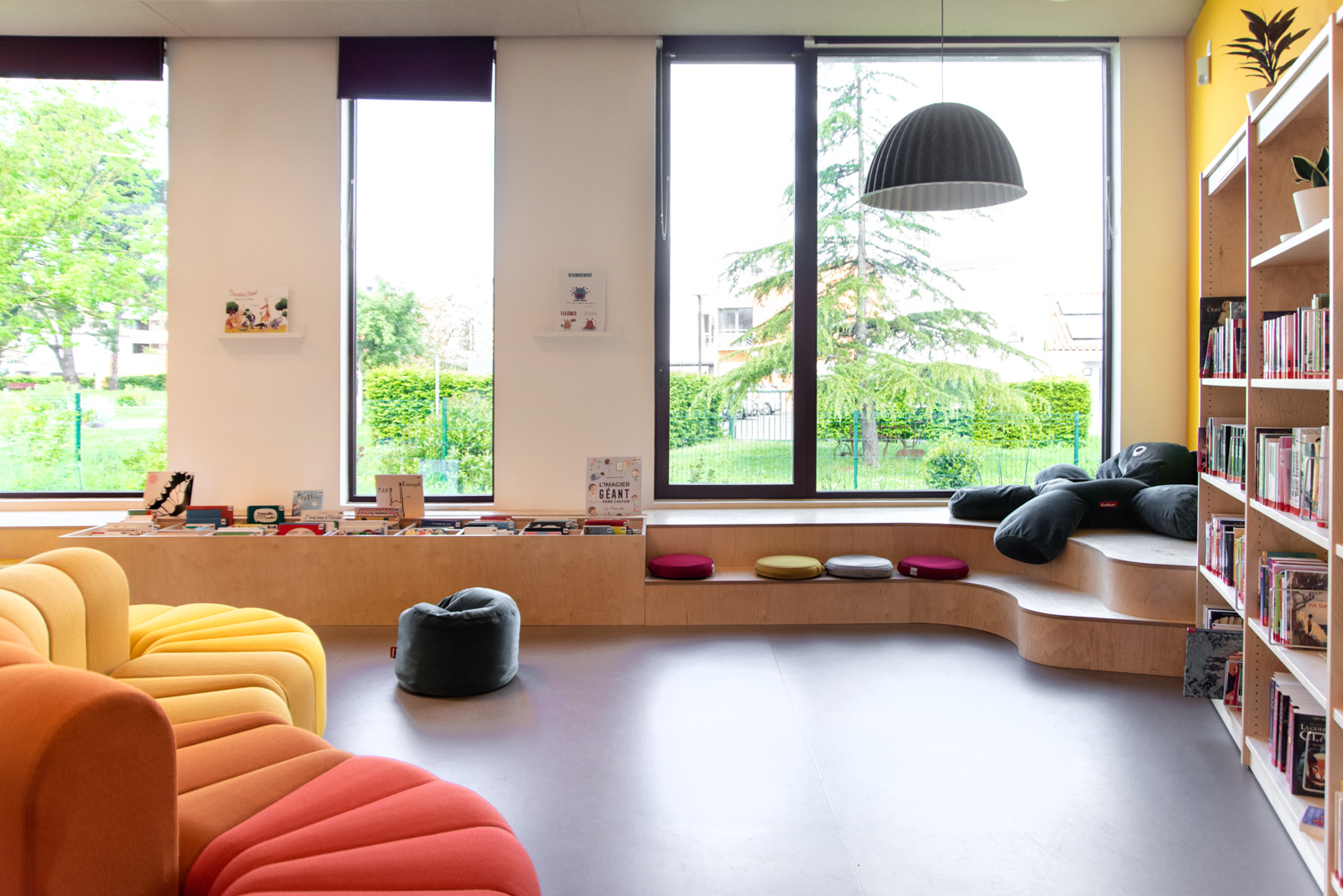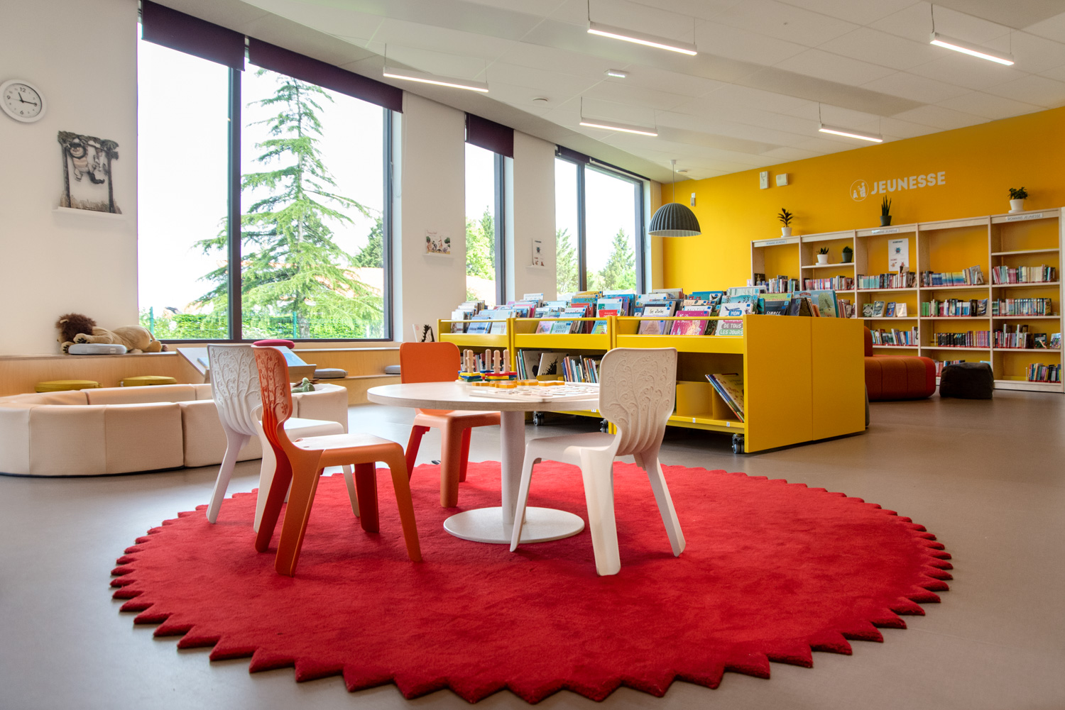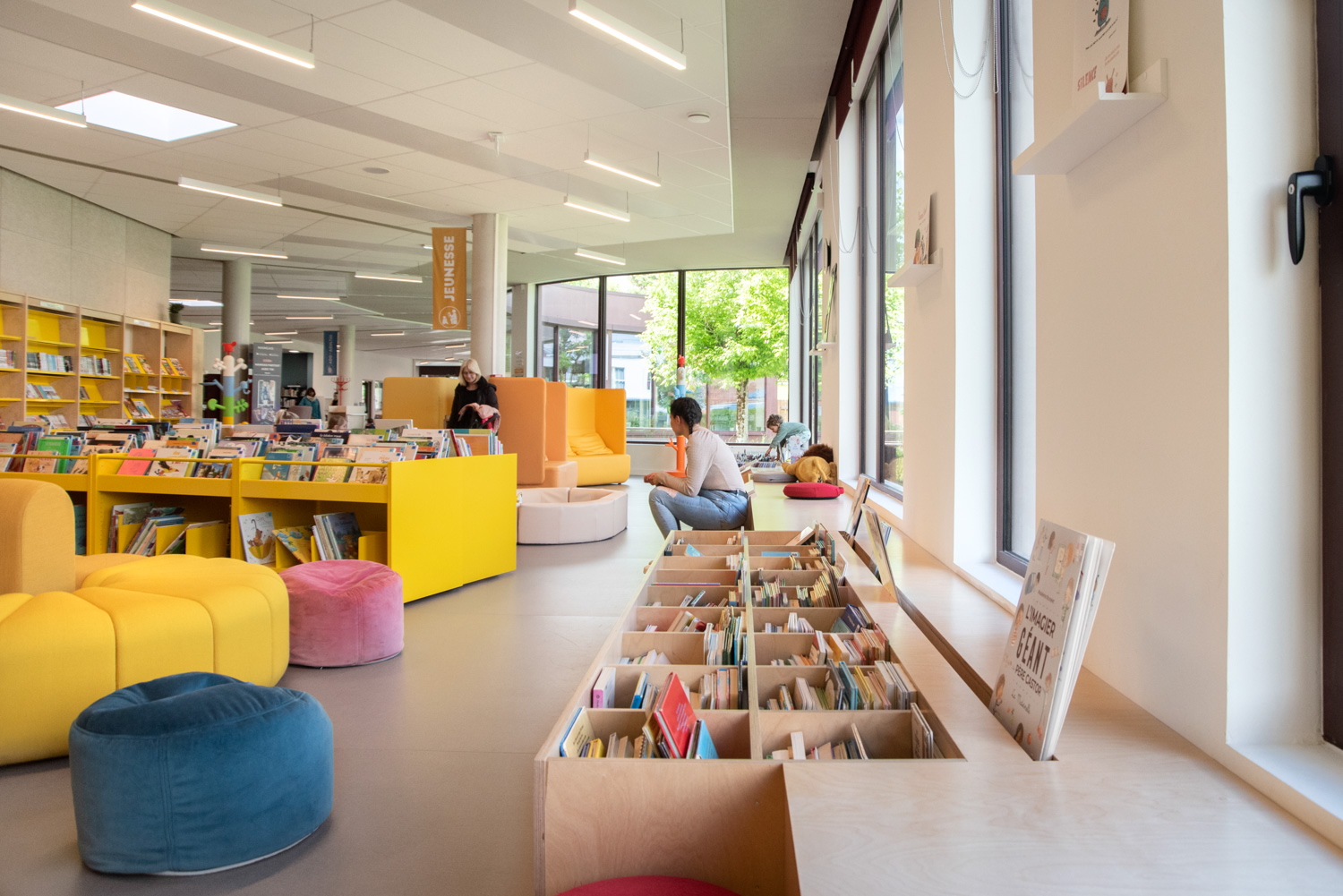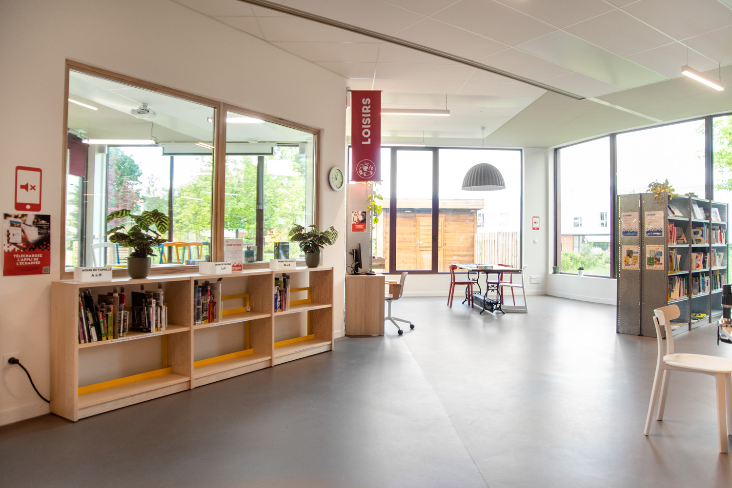 The library has a strong environmental dimension with an "eco-responsible" interior. Designed by architects Tetrarc, this new public facility is a breathing space for families of all ages. The building is built around a green heart, with existing trees in the garden and new elements planted. A garden forms a direct extension of the media library, with a shared vegetable garden and a 1,000 m² space.