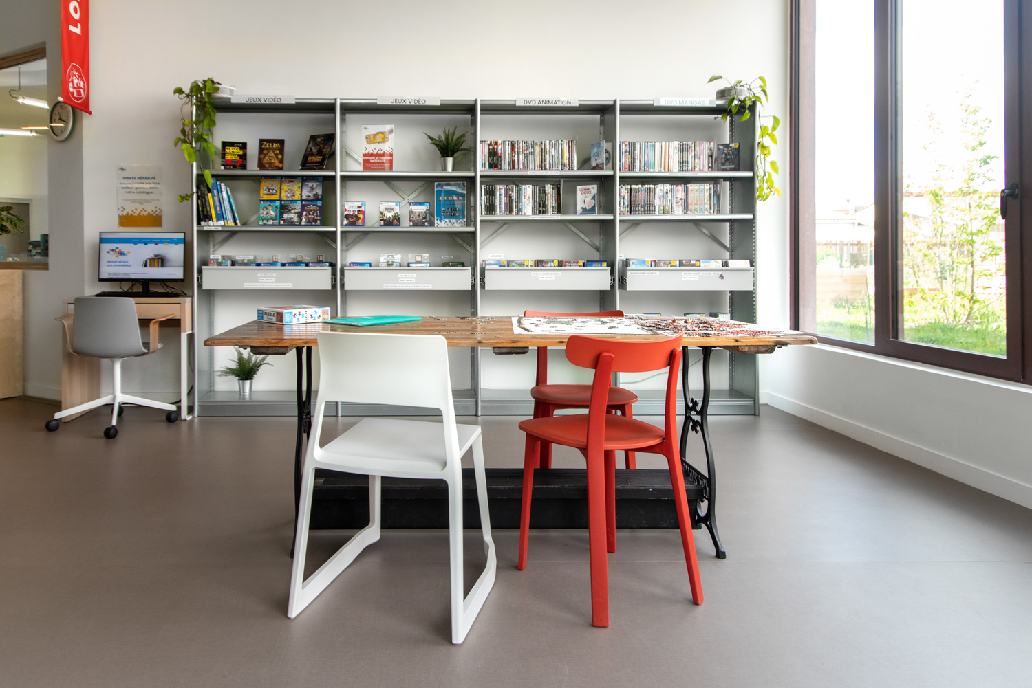The media library and the interior design are characterized by a choice of raw, sober, and durable materials both industrial and recycled, to create different atmospheres.