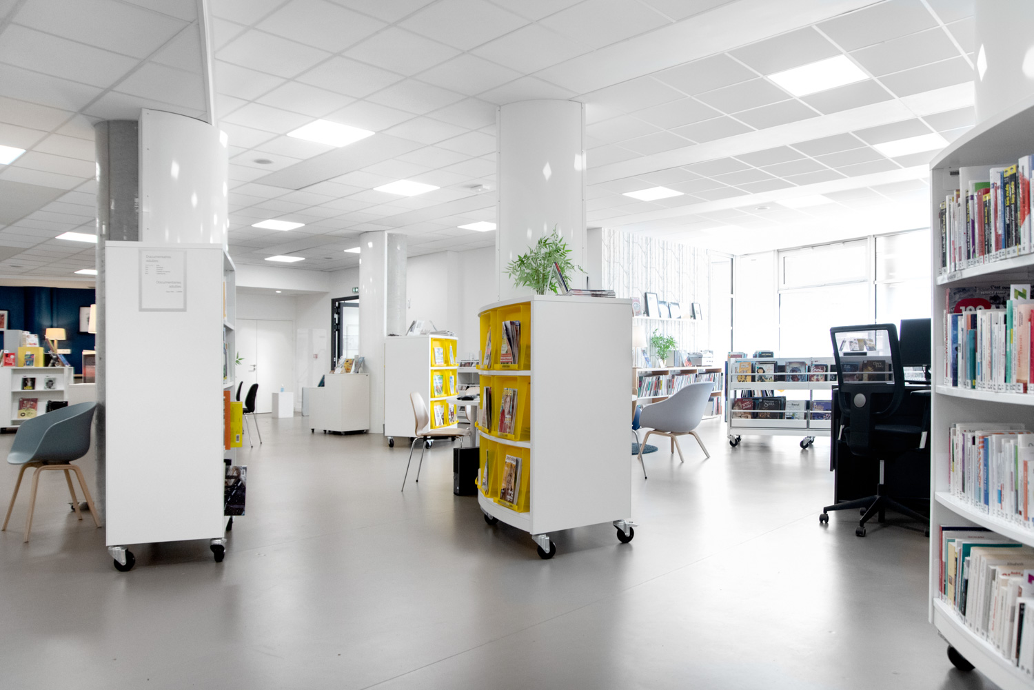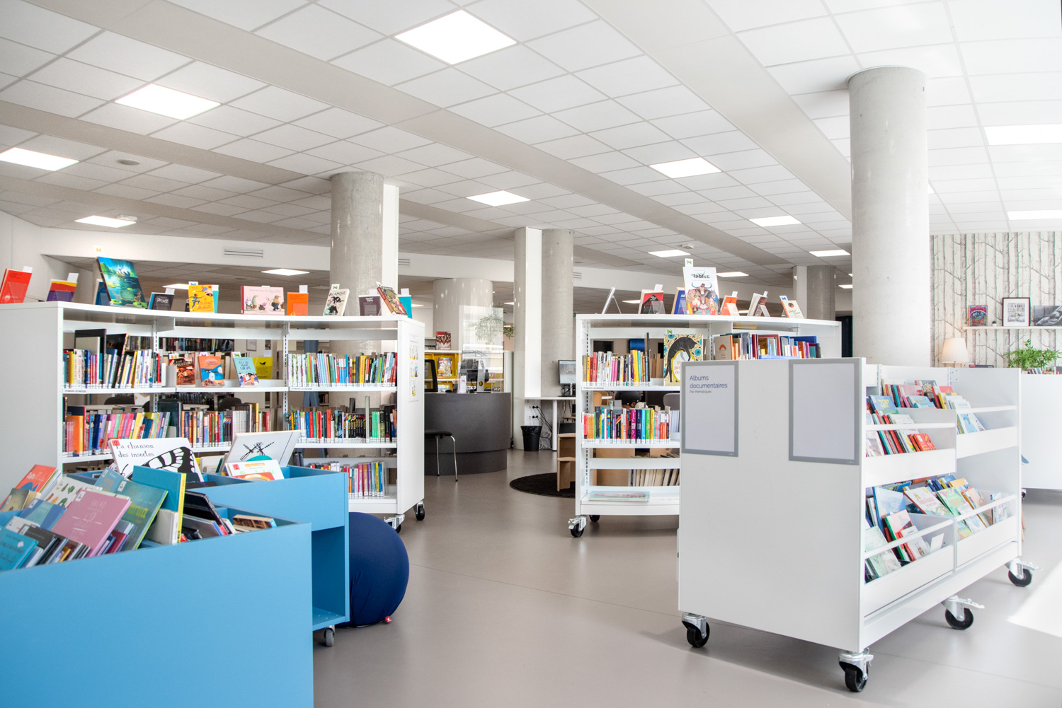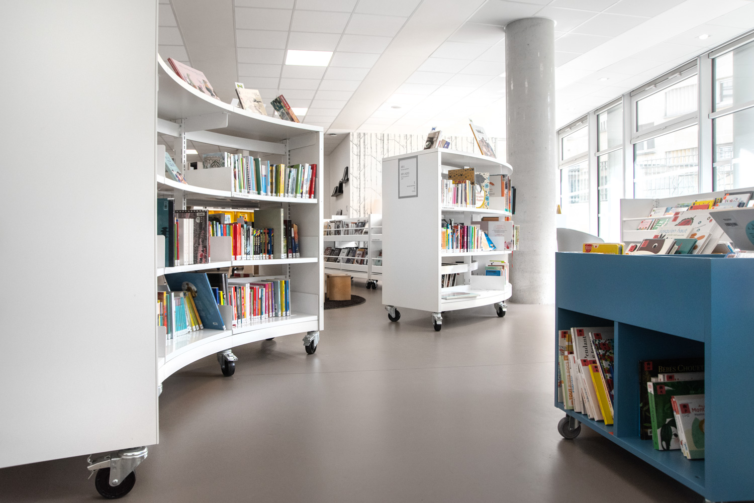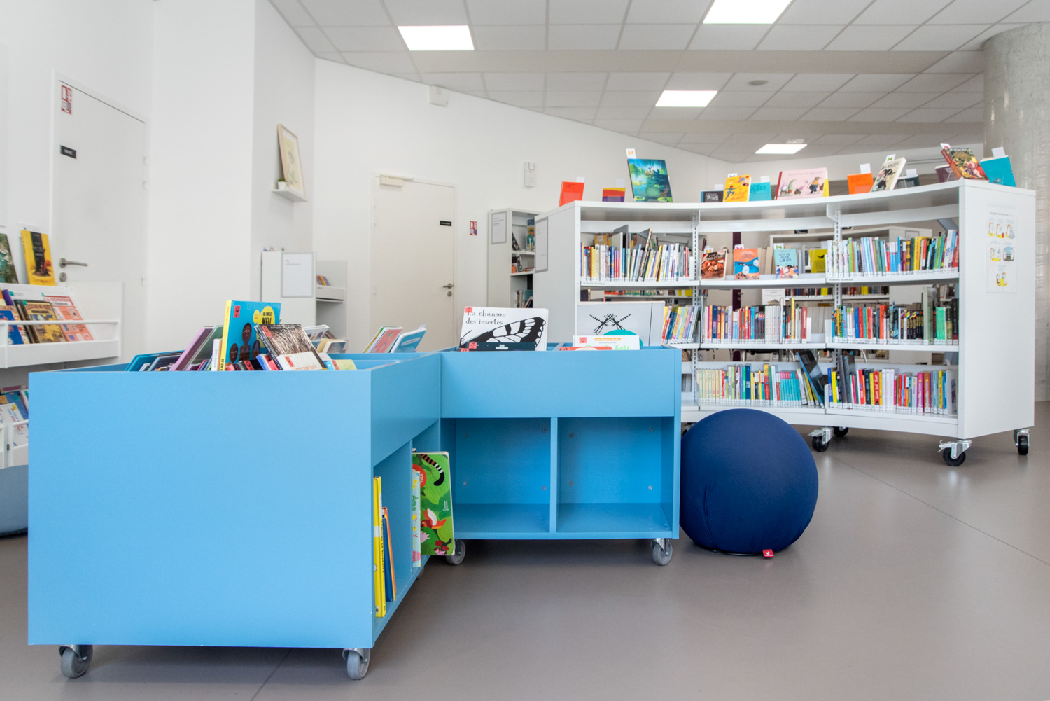 The work carried out in collaboration with BC Intérieur for the entire interior design has resulted in a cheerful and flexible library, with spaces that are visually coherent and clearly differentiated! This successful cooperation has created a cultural space, that invites the citizens to come in and spend time in the library either listening to a record in large armchairs, reading stories or comic books on comfortable poufs, or working in smaller groups.