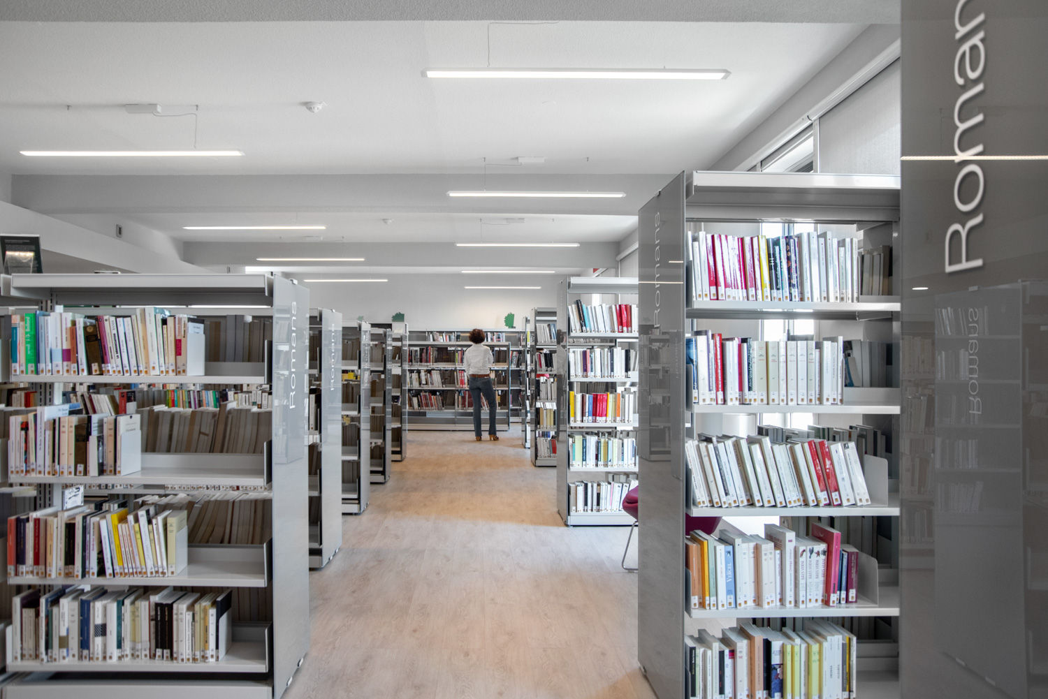 The old, renovated shops are now divided into four areas; on the ground floor there is a youth area and an entertainment area, on the first floor there is the adult section and a board games area. Each area is characterized by a specific color used for signage. In all departments, it is possible to get access and help in the Catalan language, and there are resources for remote audiences (e.g. collections with large print, braille and audio books) as well as various media types (CDs, vinyls, DVDs, etc.).
