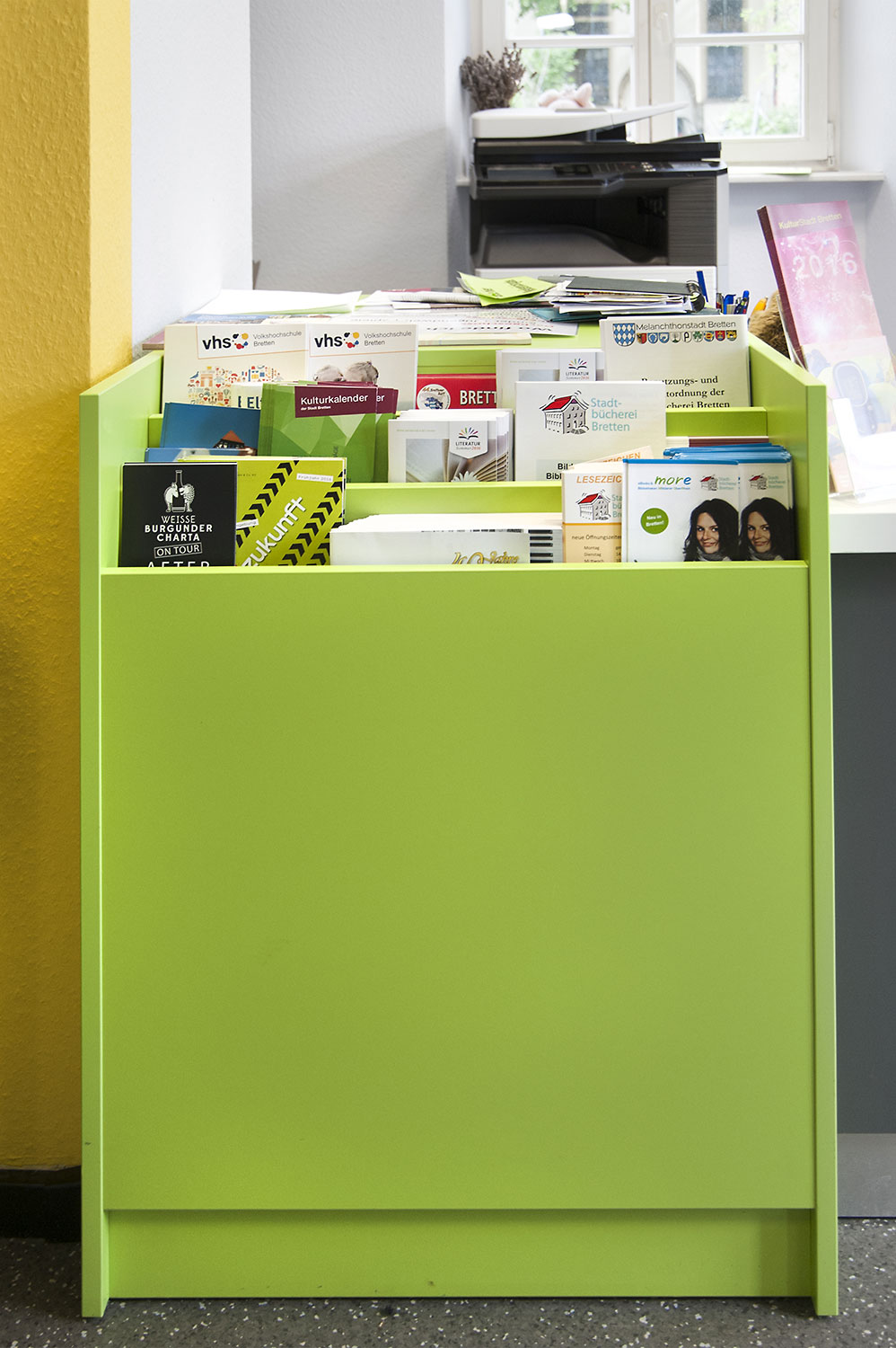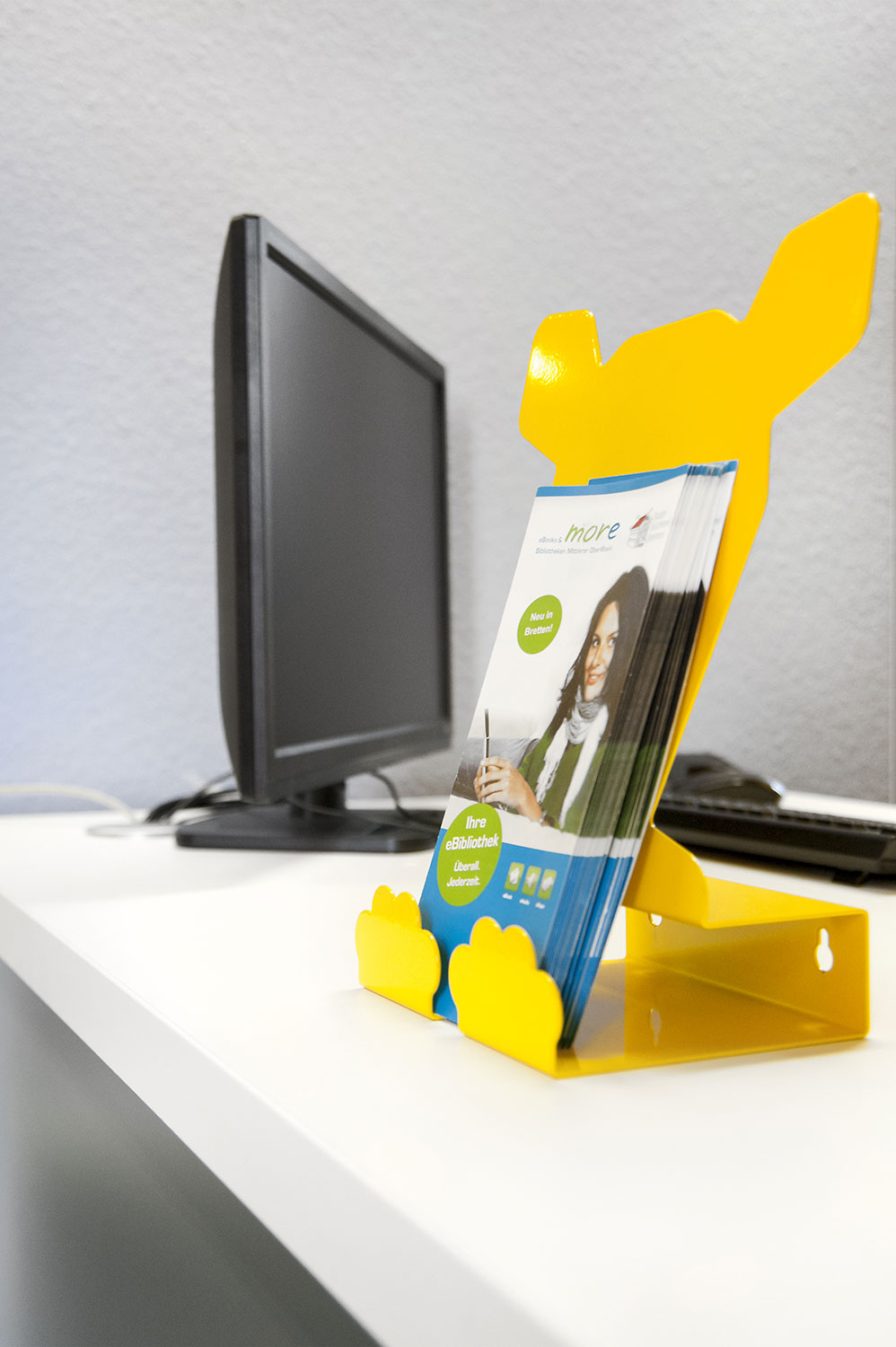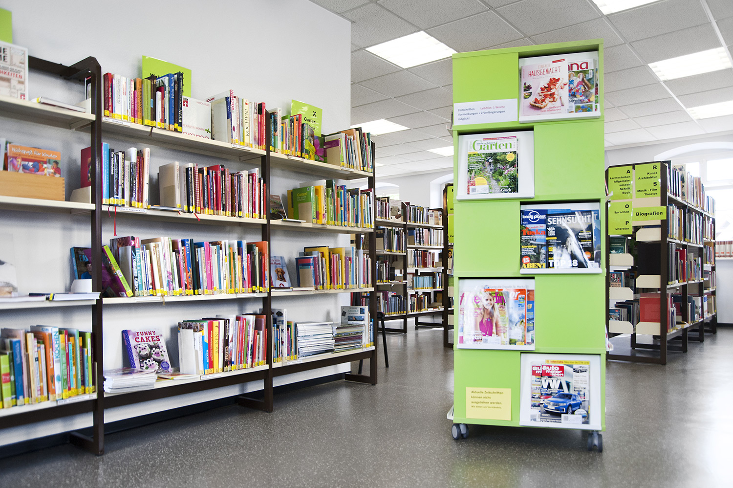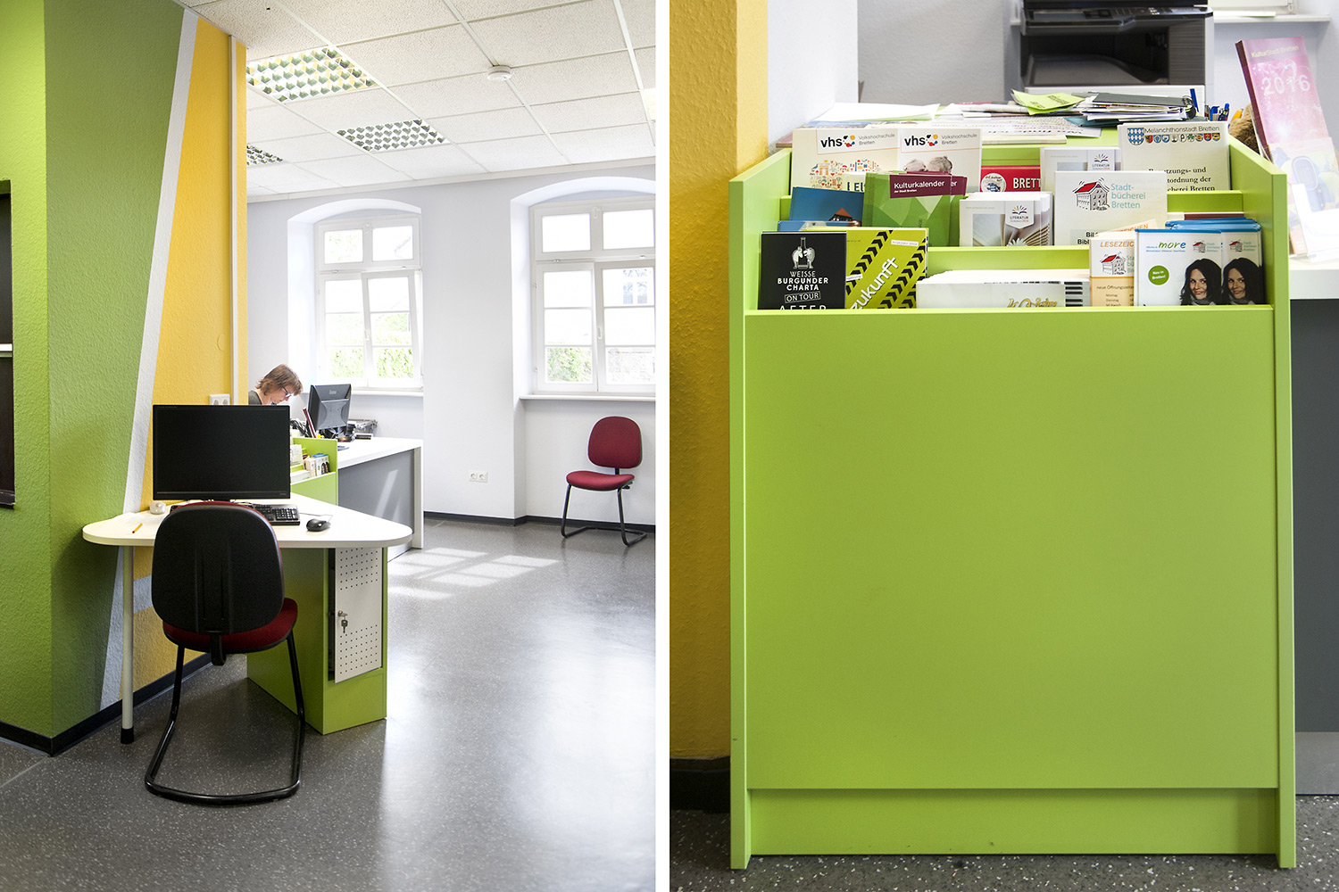 Bretten Public Library is housed in a century-old building, that has now been refreshed with new library interior. Inform counter, Labyrinth display tower and "wild" animal display stands add a new fresh look.