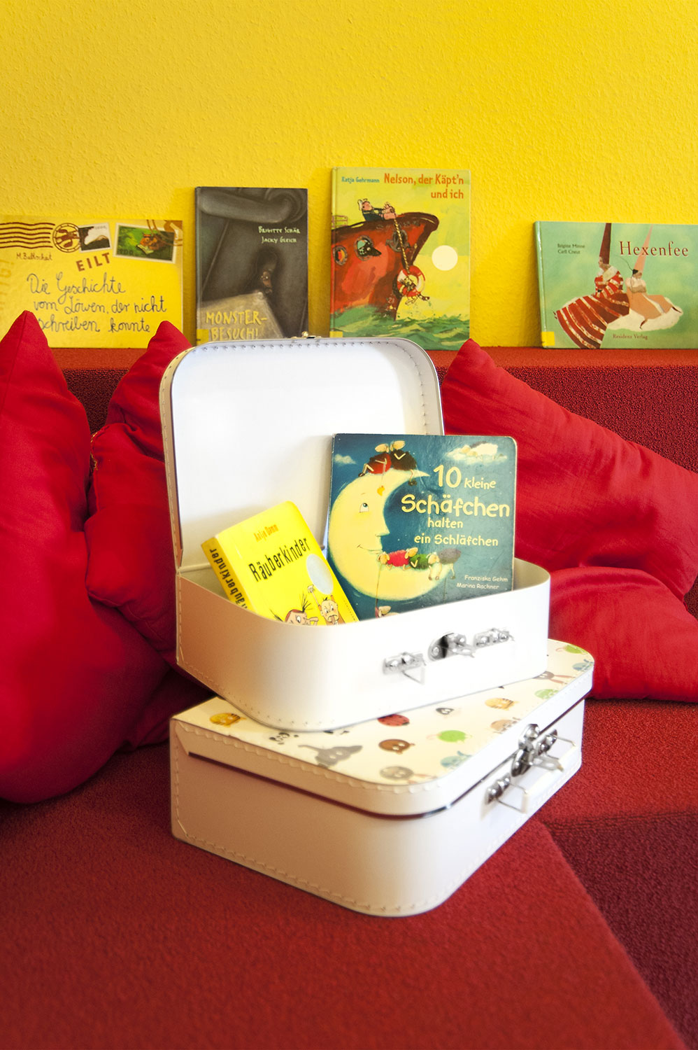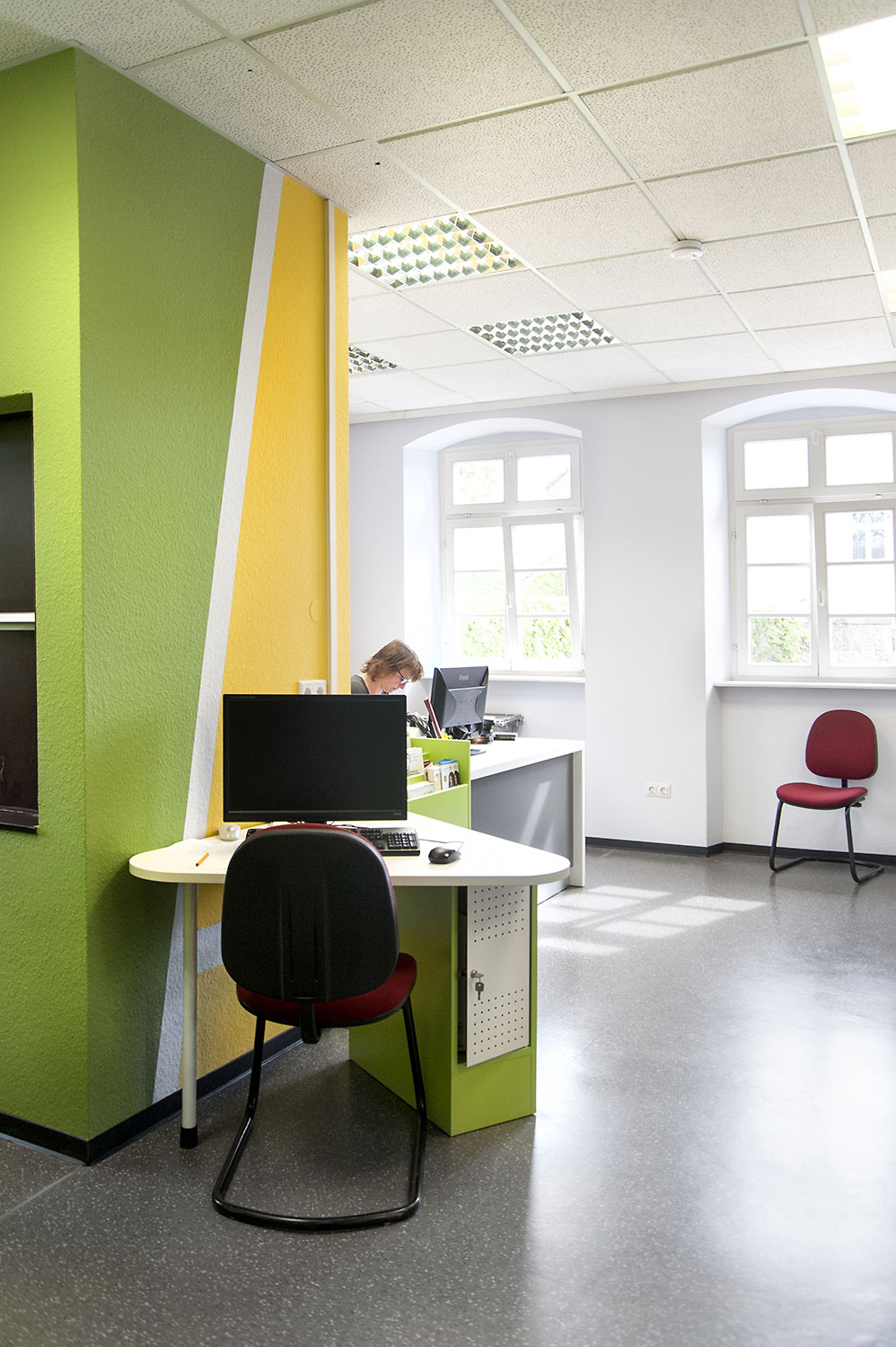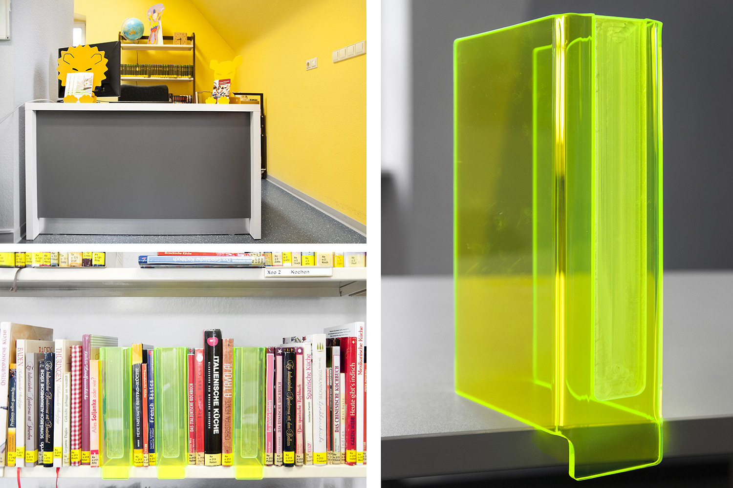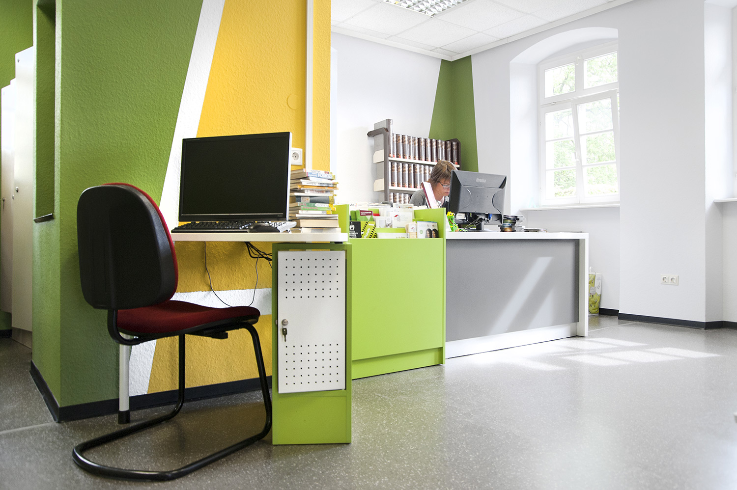 Bretten Public Library is housed in a century-old building, that has now been refreshed with new library interior. Inform counter, Labyrinth display tower and "wild" animal display stands add a new fresh look.