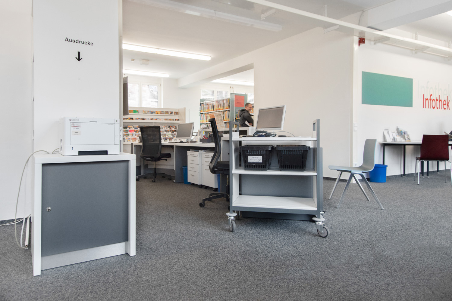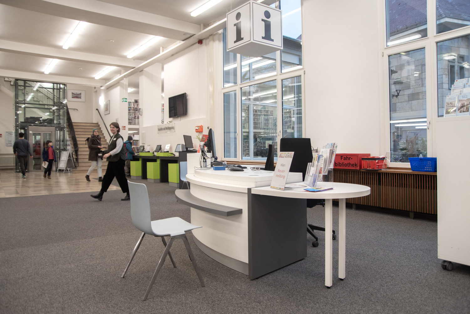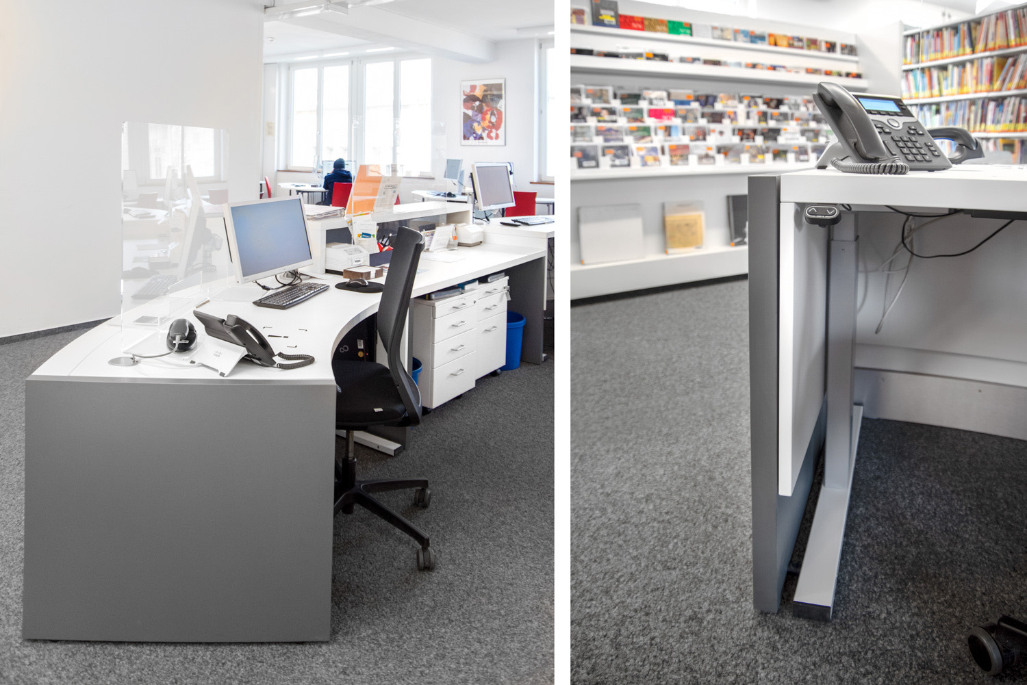 On the first floor of Freiburg Library, we have completed the first installation of a round and height-adjustable counter from Inform.