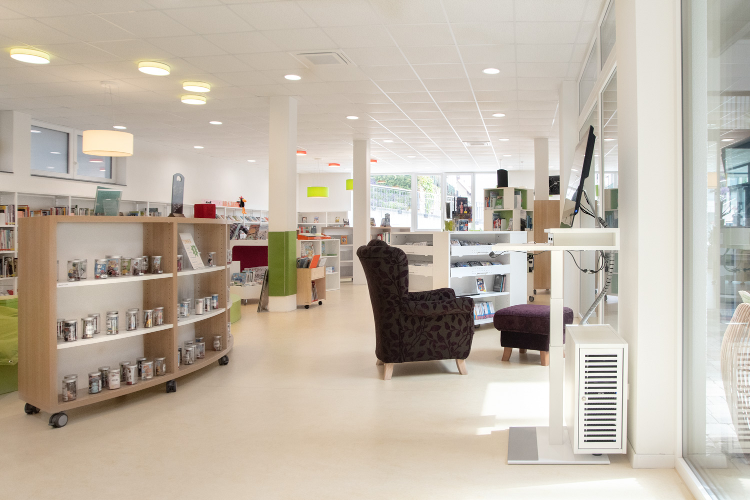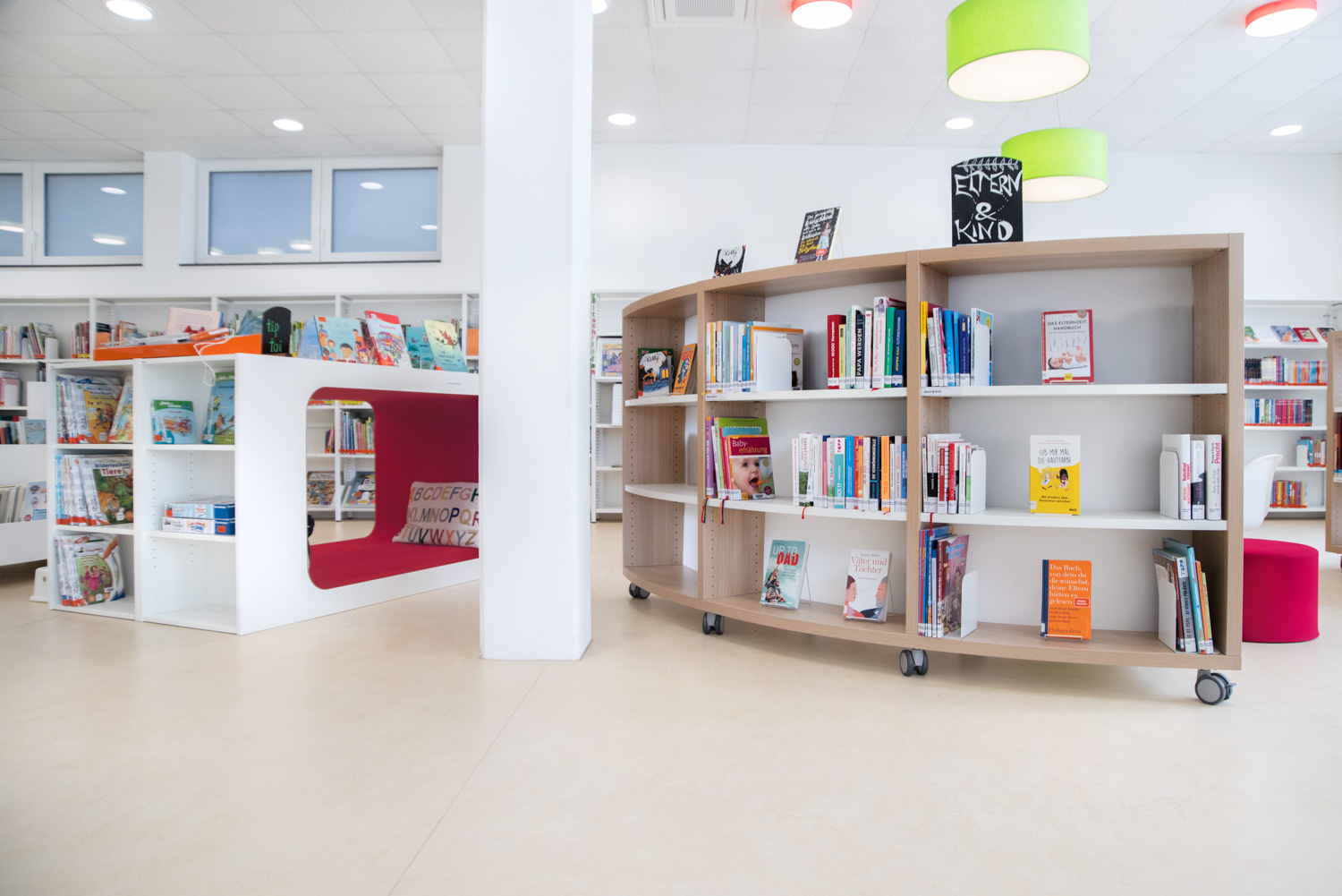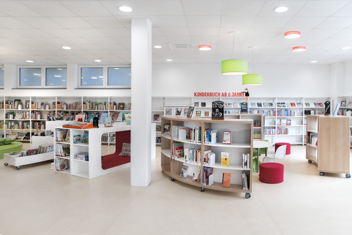 Our architect team, in cooperation with Ilsfeld Library, came up with some creative suggestions for the colours and shapes of the furniture, that have resulted in this very nice, welcoming library of high quality.