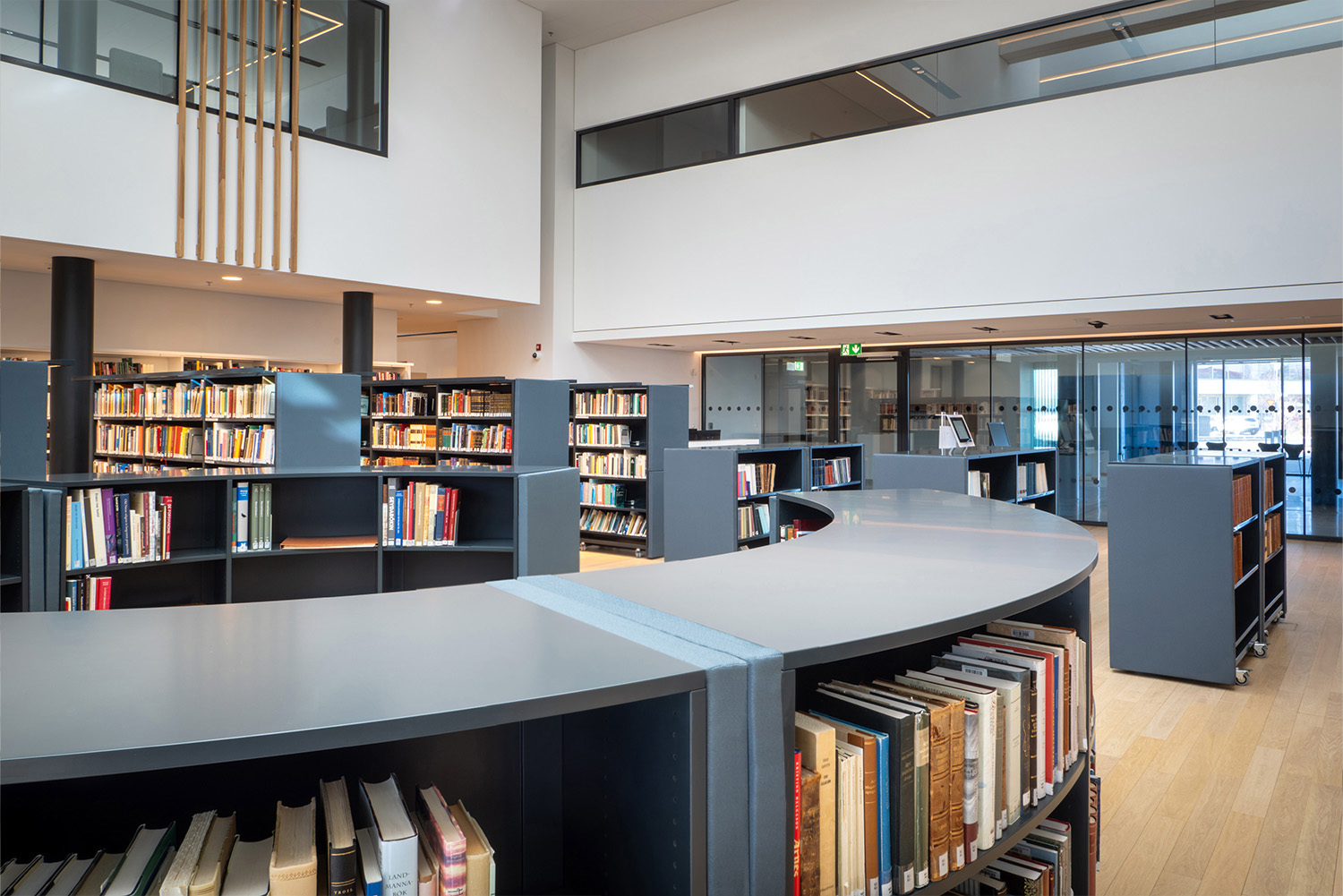 We worked with our partners Þjónustumiðstöð bókasafna in Reykjavik to supply the best solution for the customer and building, resulting in using a combination of static and mobile, straight, and curved Lingo shelving with lighting and acoustic treatments.