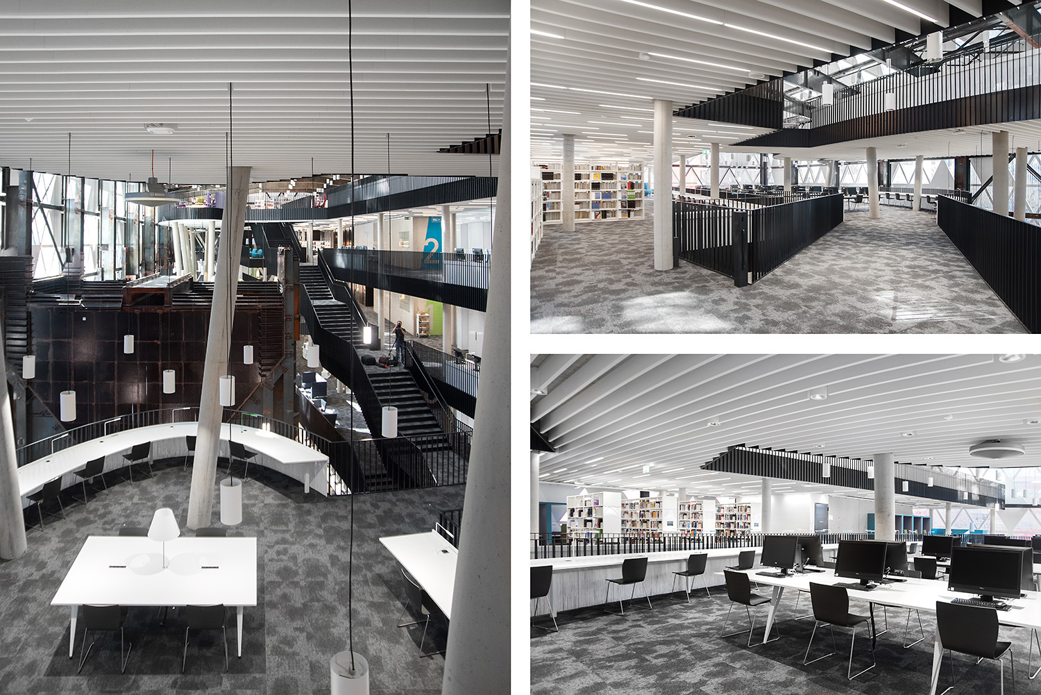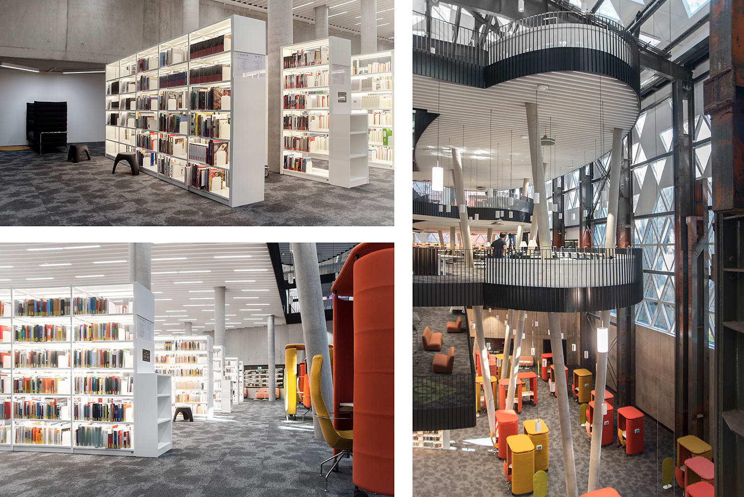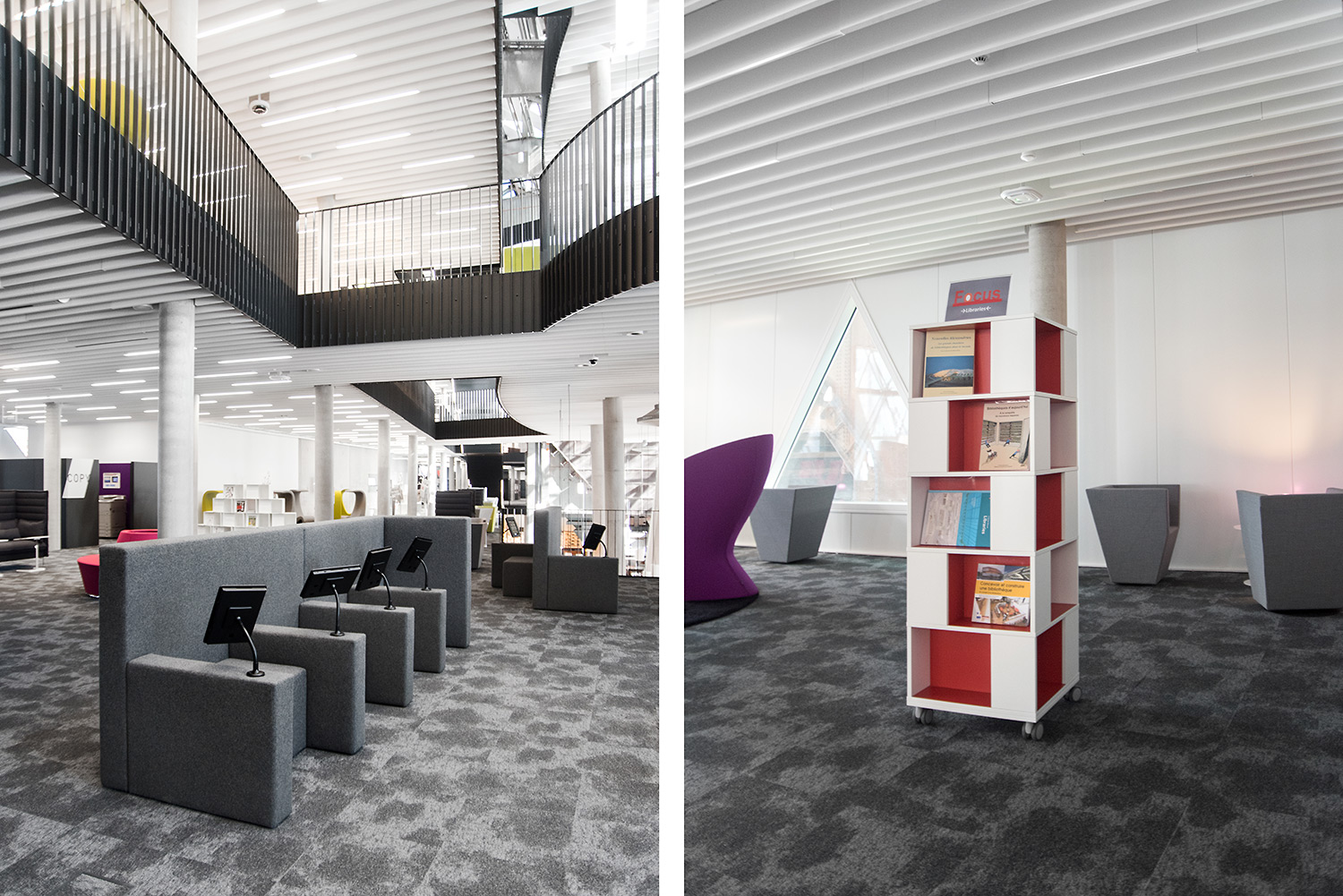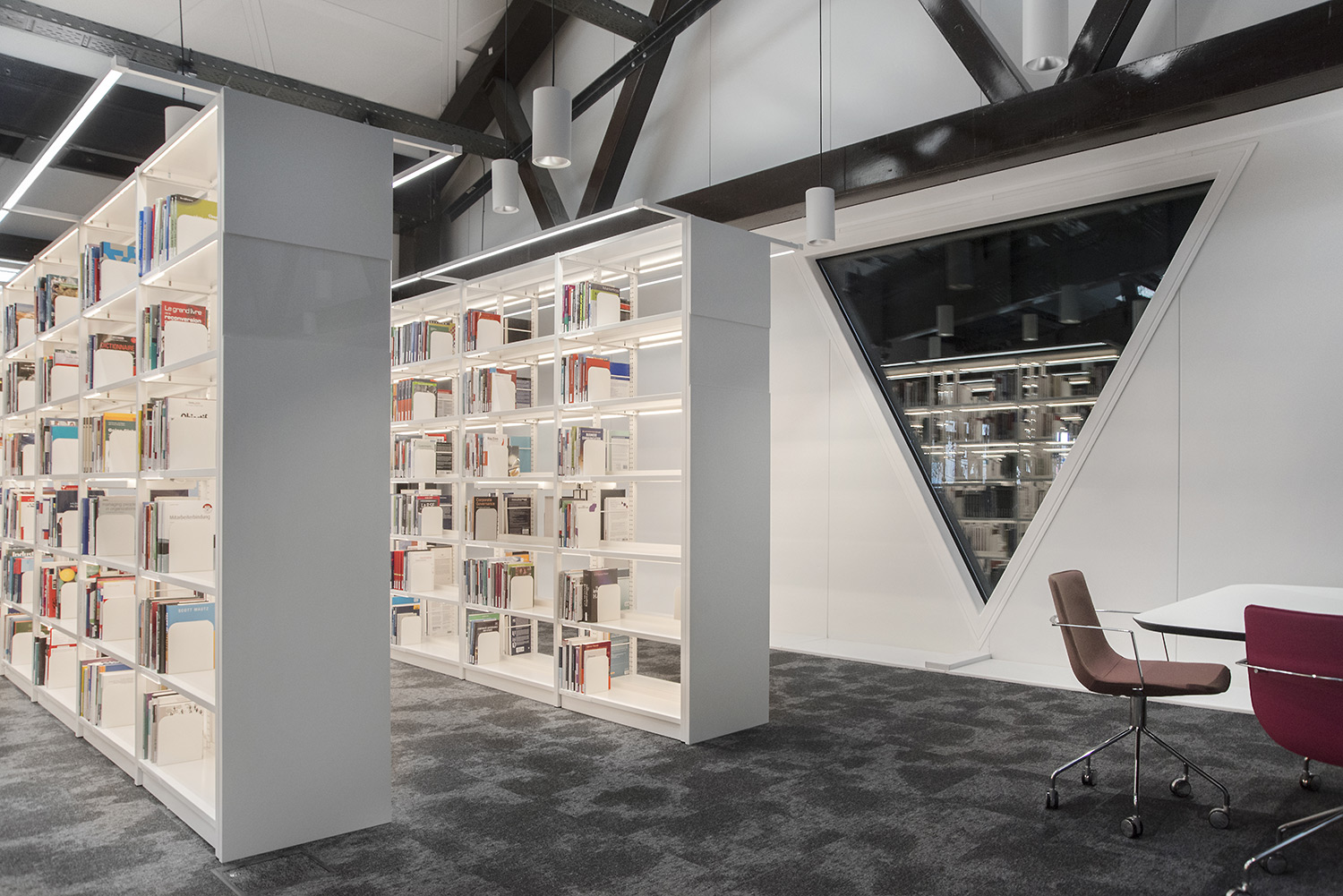 With its clear design and practical all day usability our Uniflex Shelving System with integrated LED lighting provides 10.7 km of shelf capacity spread over 5 floors.