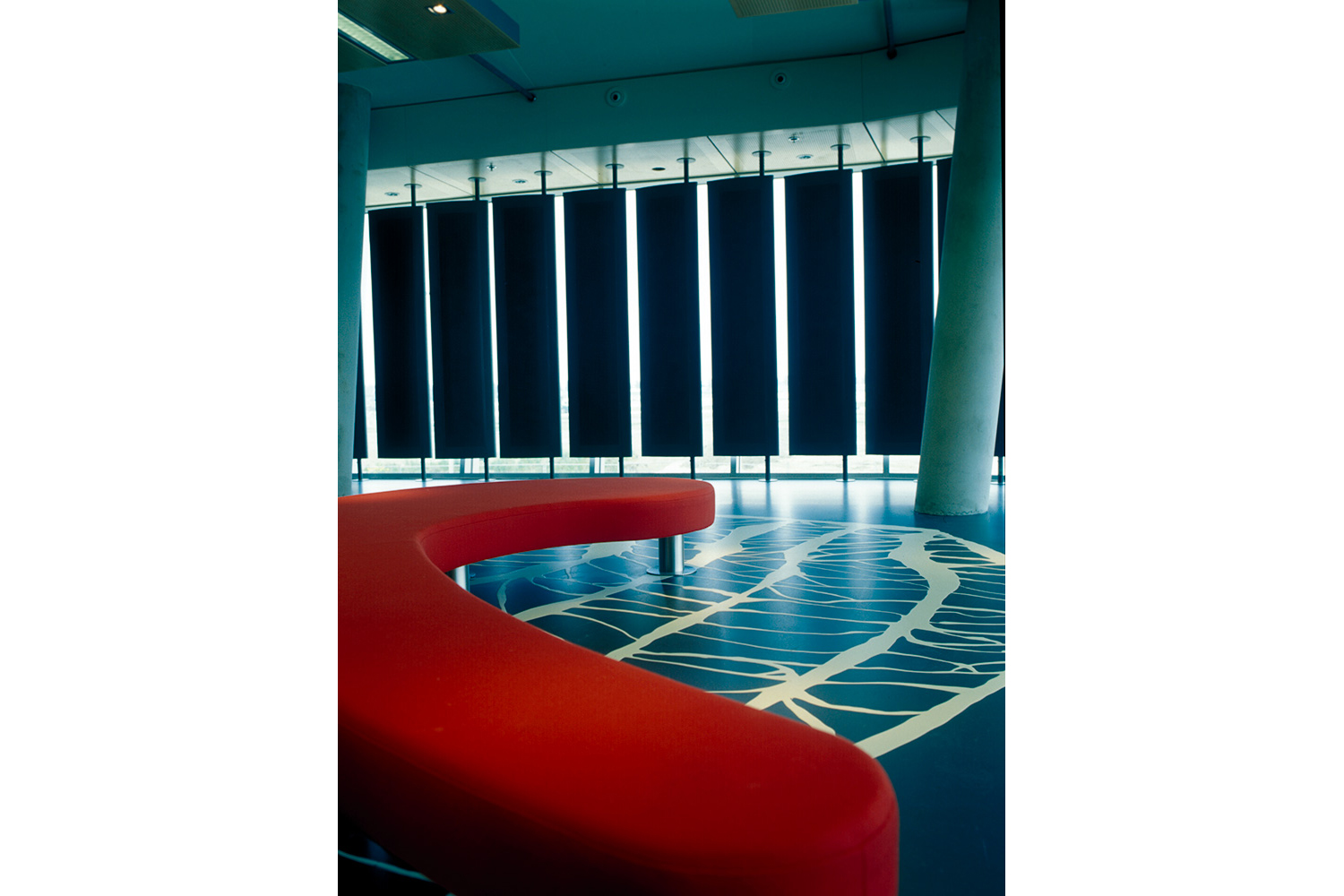 The building exterior serves as a landmark in a new neighborhood, and its boldness brashly continues inside the building. Interior designer Aat Vos has used light flows and materials in an innovative way.