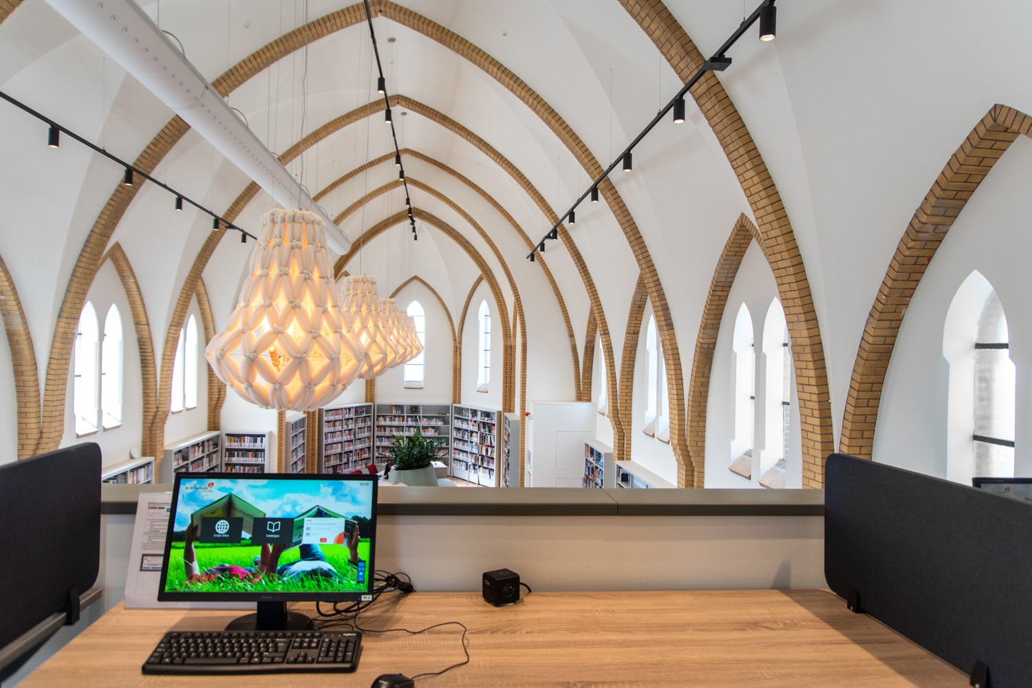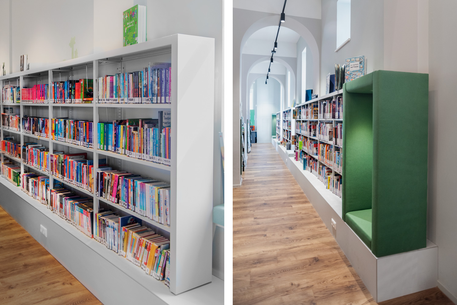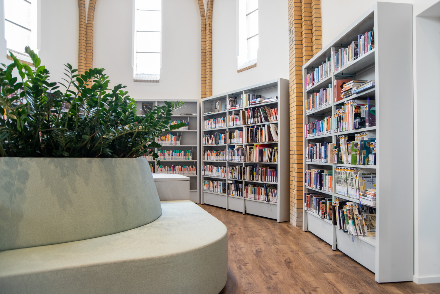 Today the former chapel of 't Gasthoes is put to a more modern use. It is now a multifunctional centre including a library. Contemporary library shelving systems have been placed between the historic building elements and are mounted on plinths for easy access.