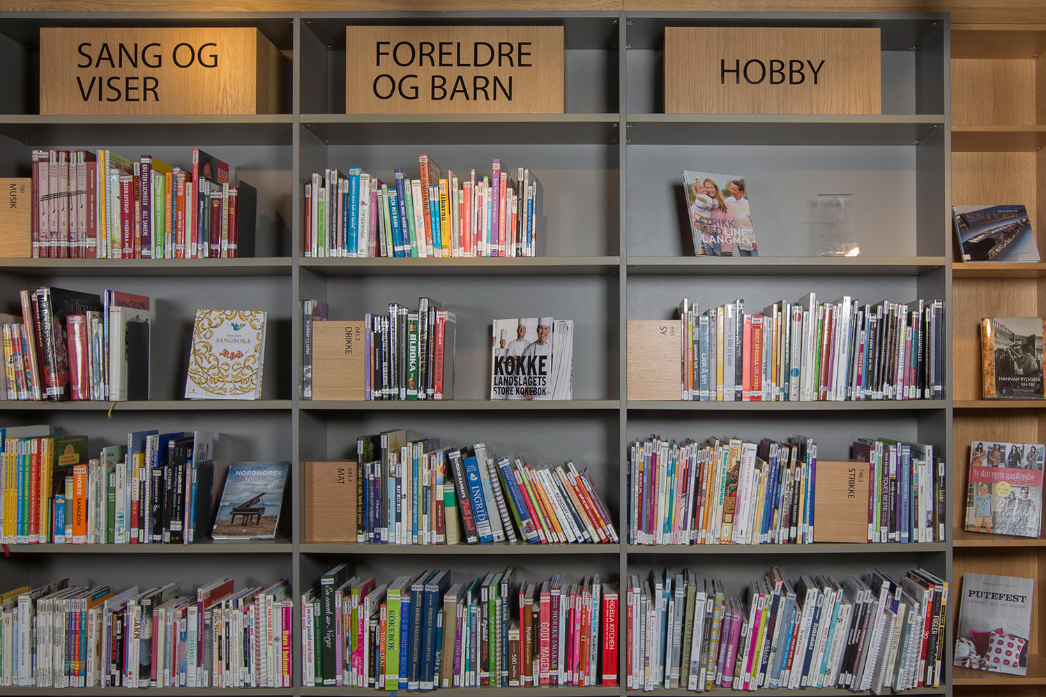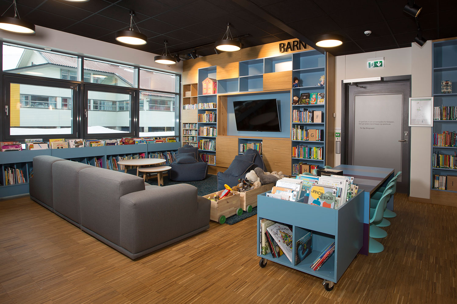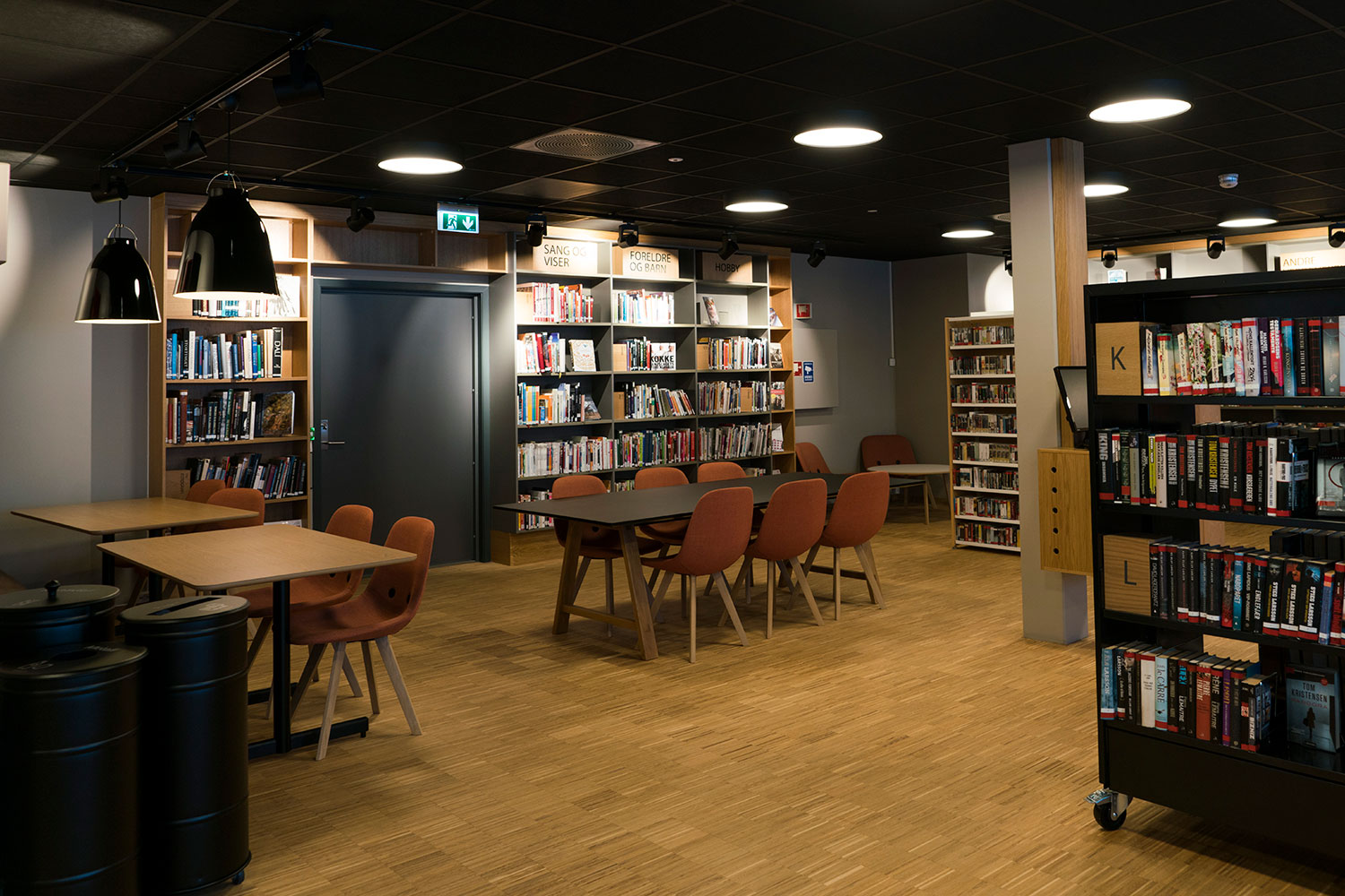 The library are now 500 m2 in settings that are both spacious, bright and inviting. At the library they enforce the tradition of taking off shoes before entering the library. It creates a warm and nice atmosphere; something that is also emphasized in the choice of materials and colors as well as the interior design in general.