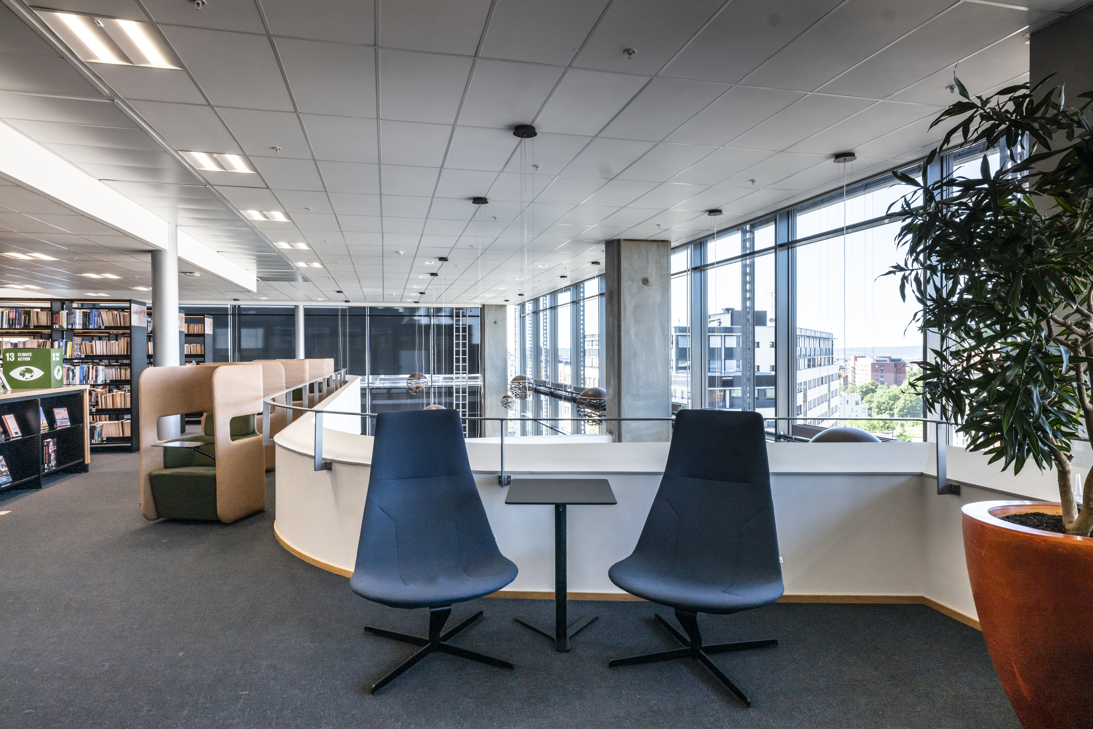 The result is a magnificent library spread across two floors on the 5th and 6th levels, adorned with warm and Nordic-inspired colours. The layout of the space, featuring high ceilings and ample natural light, provides the perfect foundation for meeting the library's goals and accommodating a variety of functions.