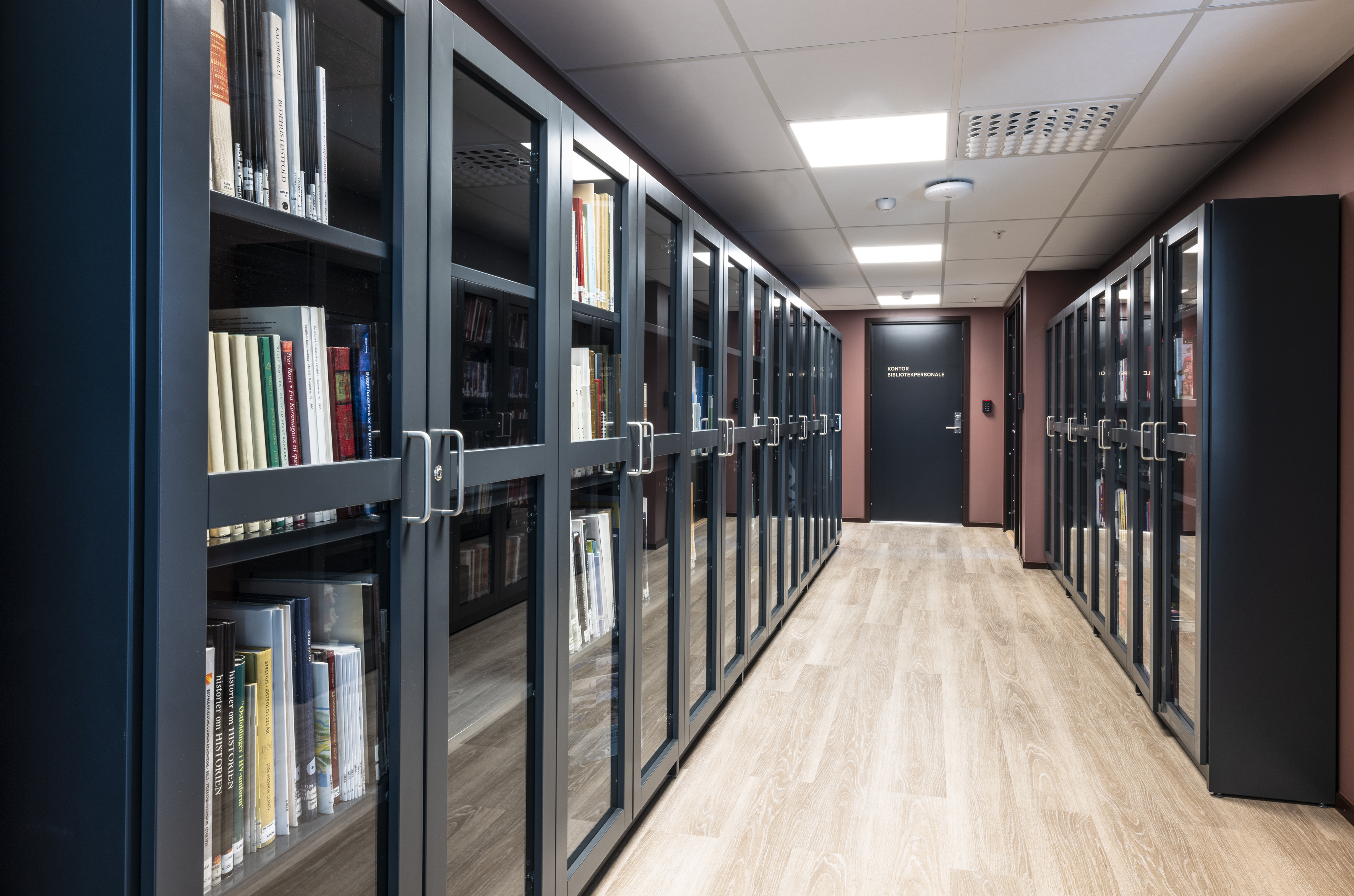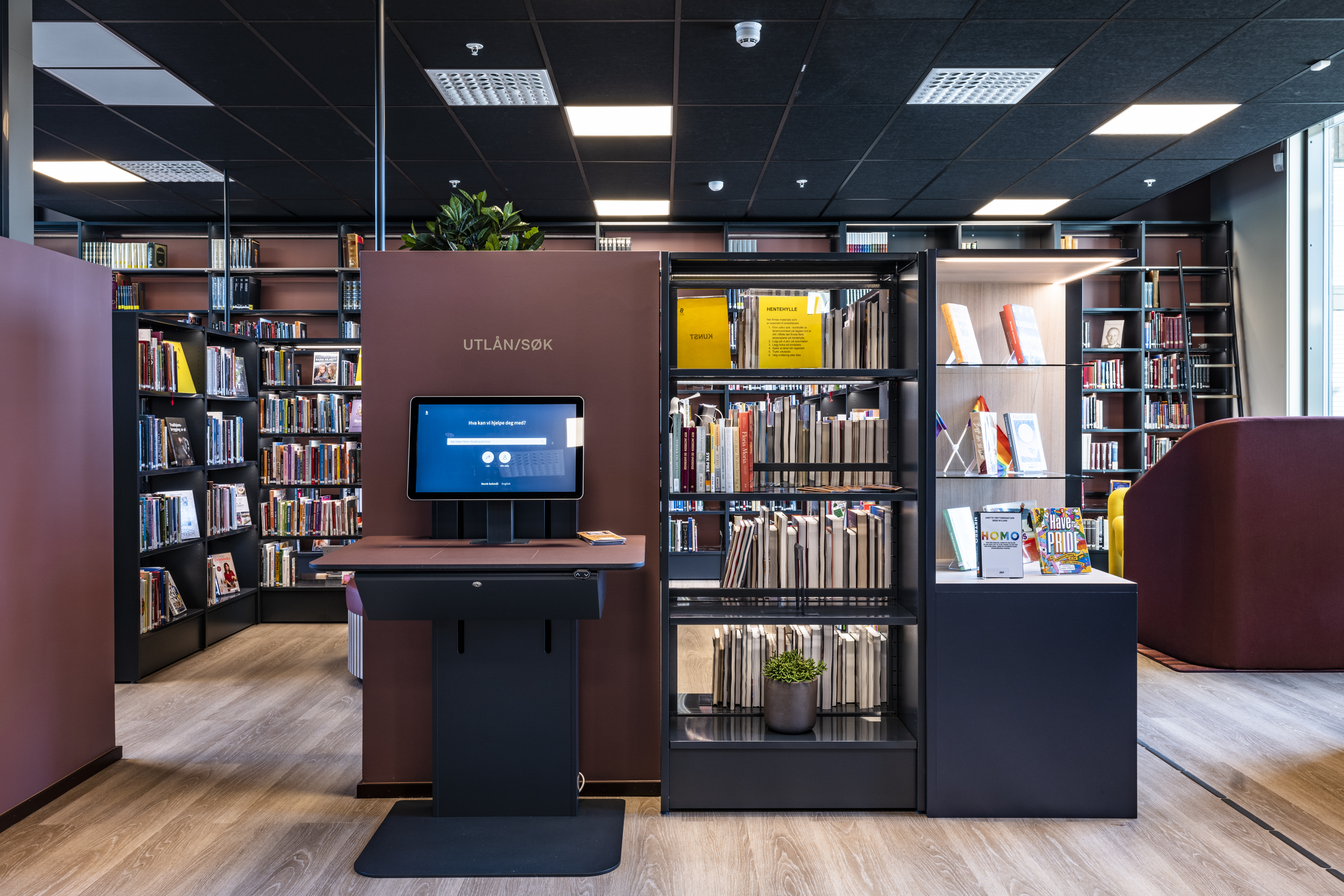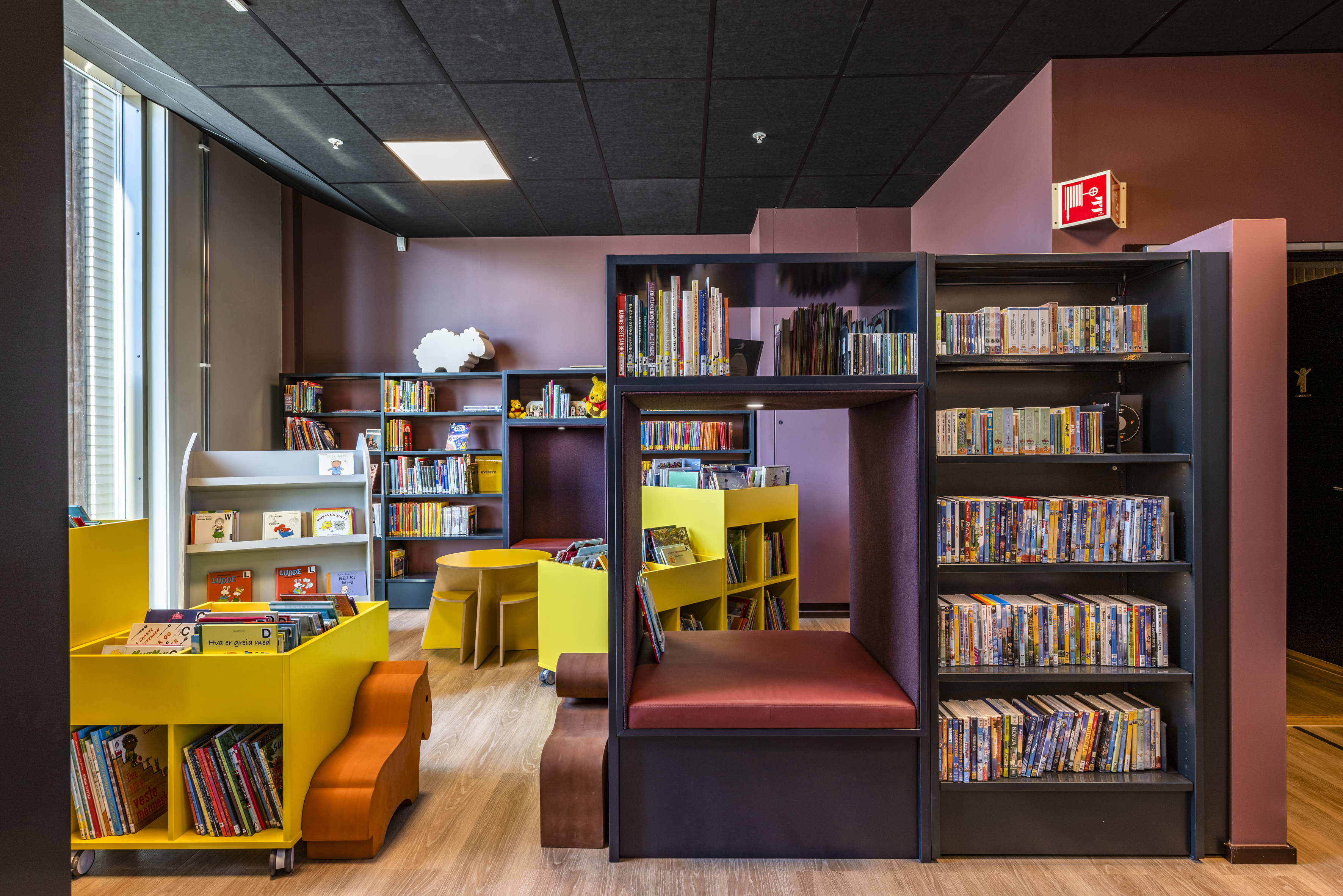 On the first floor, you’ll find the children’s section with colourful furniture and picture book browsers, alongside the adult section for factual material and a magazine zone. On the second floor, fiction for adults can be found with its own “room” for mysteries. The youth section has been given a slightly secluded location at the innermost part of this floor, where young people can retreat to cosy booths for study and teamwork. The local collection can also be found up here, well-preserved in tall shelves with lockable glass doors.