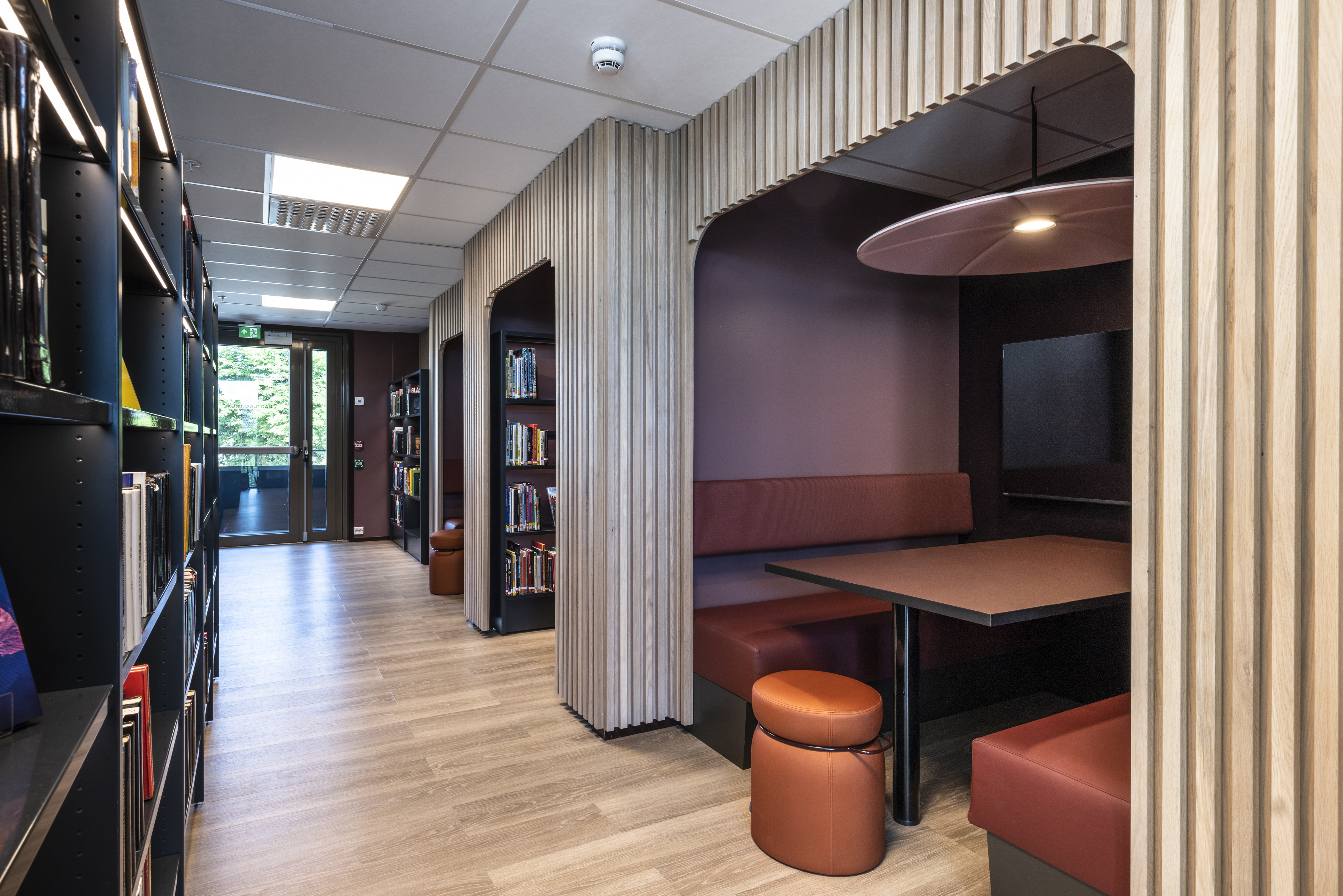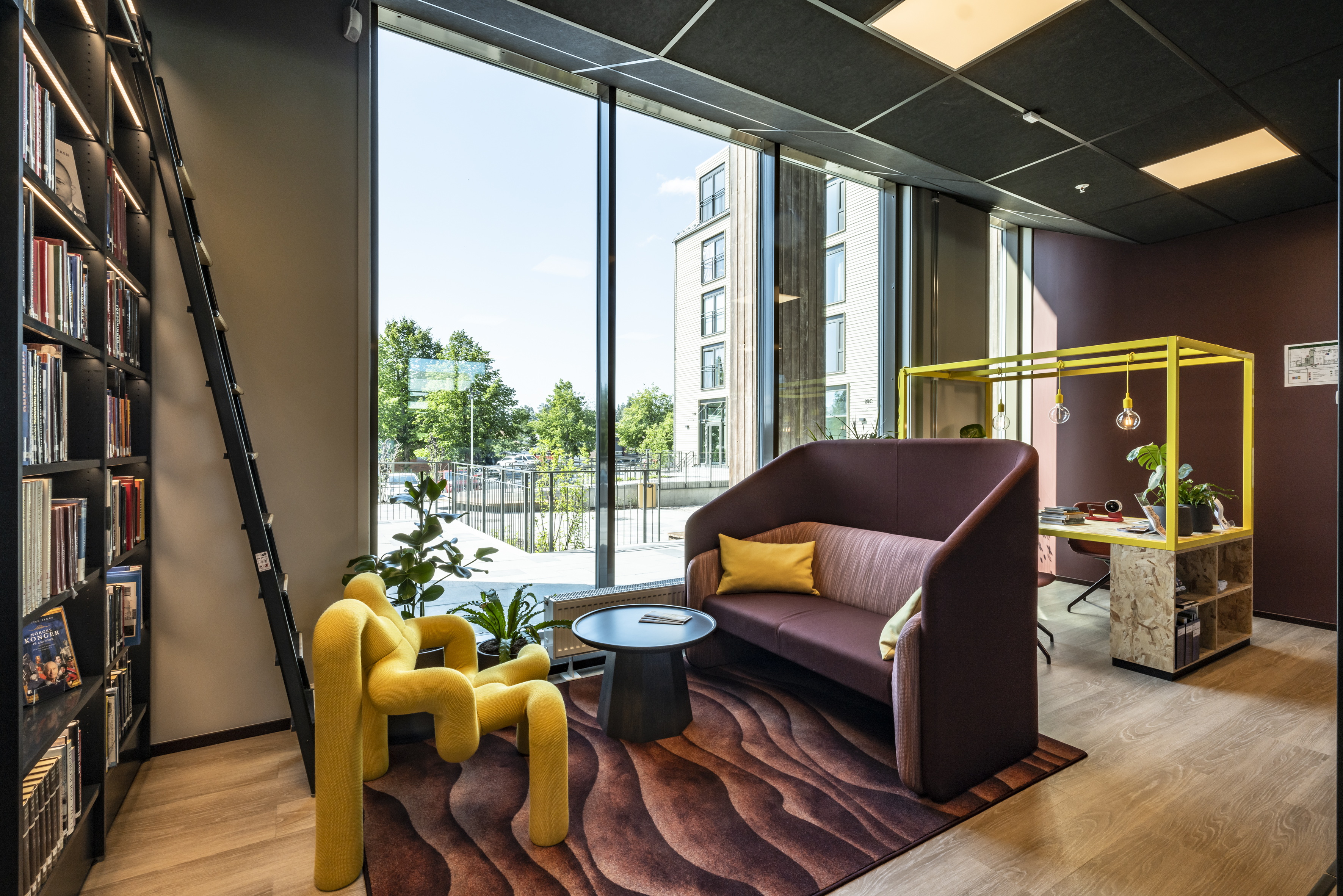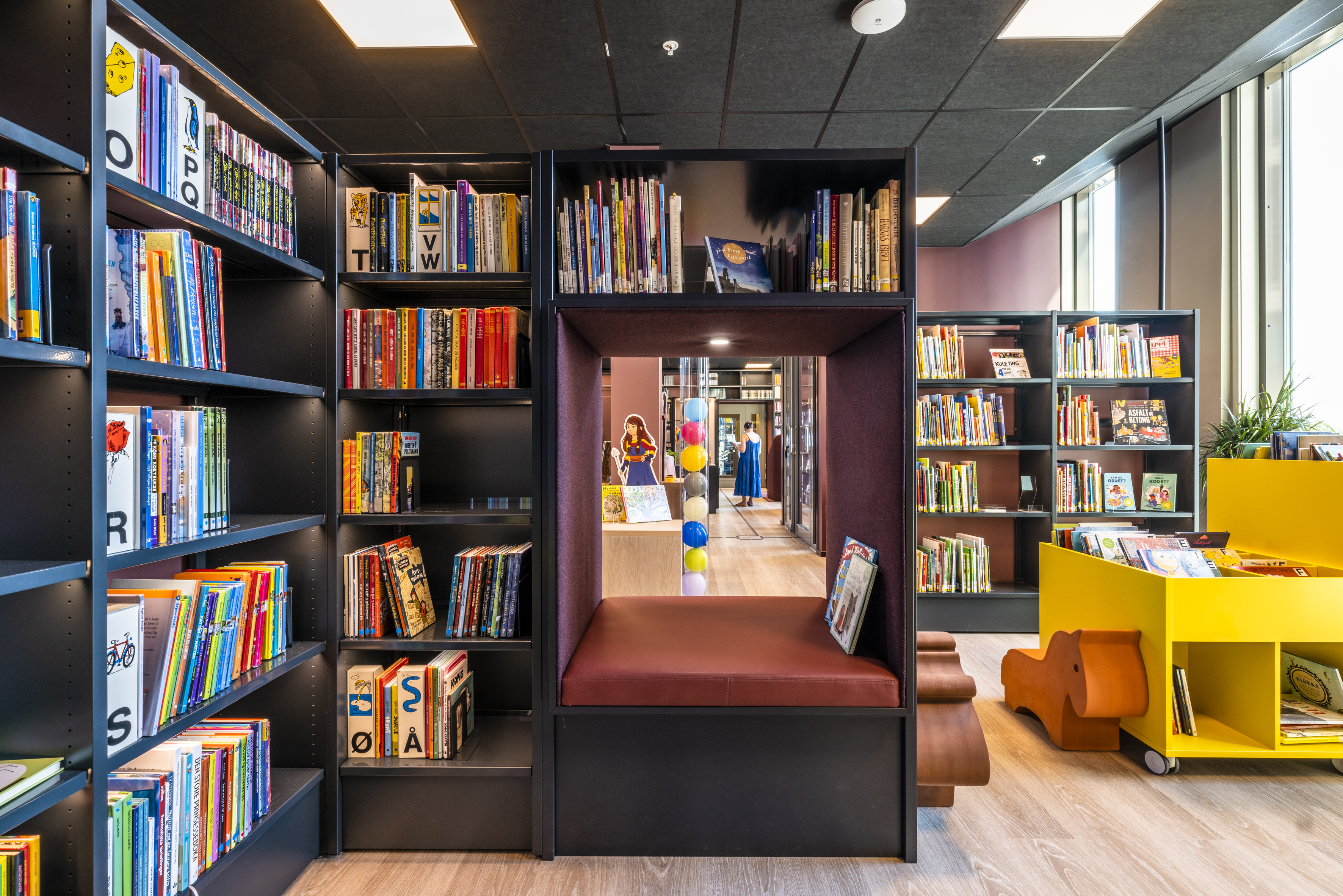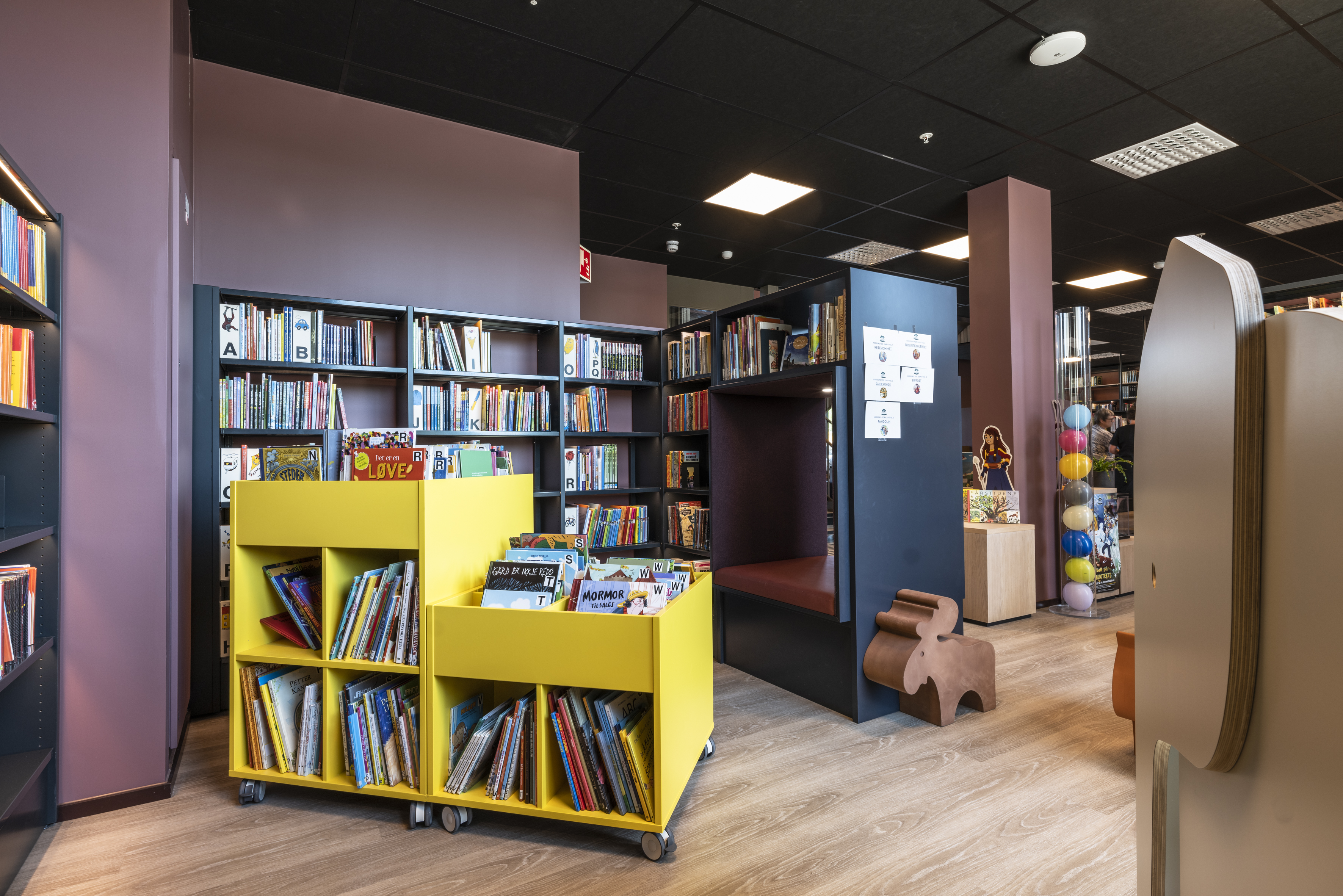 On the first floor, you’ll find the children’s section with colourful furniture and picture book browsers, alongside the adult section for factual material and a magazine zone. On the second floor, fiction for adults can be found with its own “room” for mysteries. The youth section has been given a slightly secluded location at the innermost part of this floor, where young people can retreat to cosy booths for study and teamwork. The local collection can also be found up here, well-preserved in tall shelves with lockable glass doors.