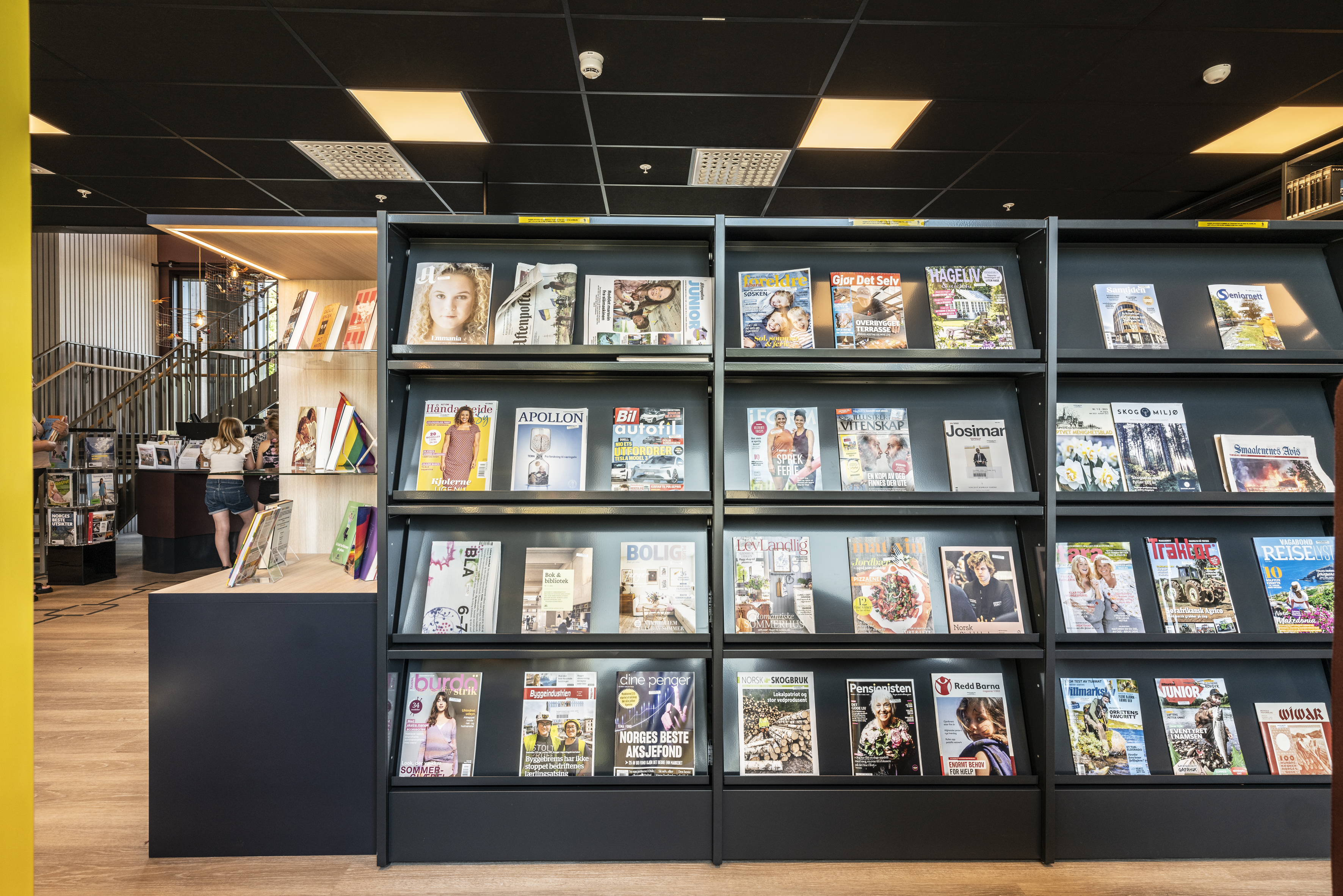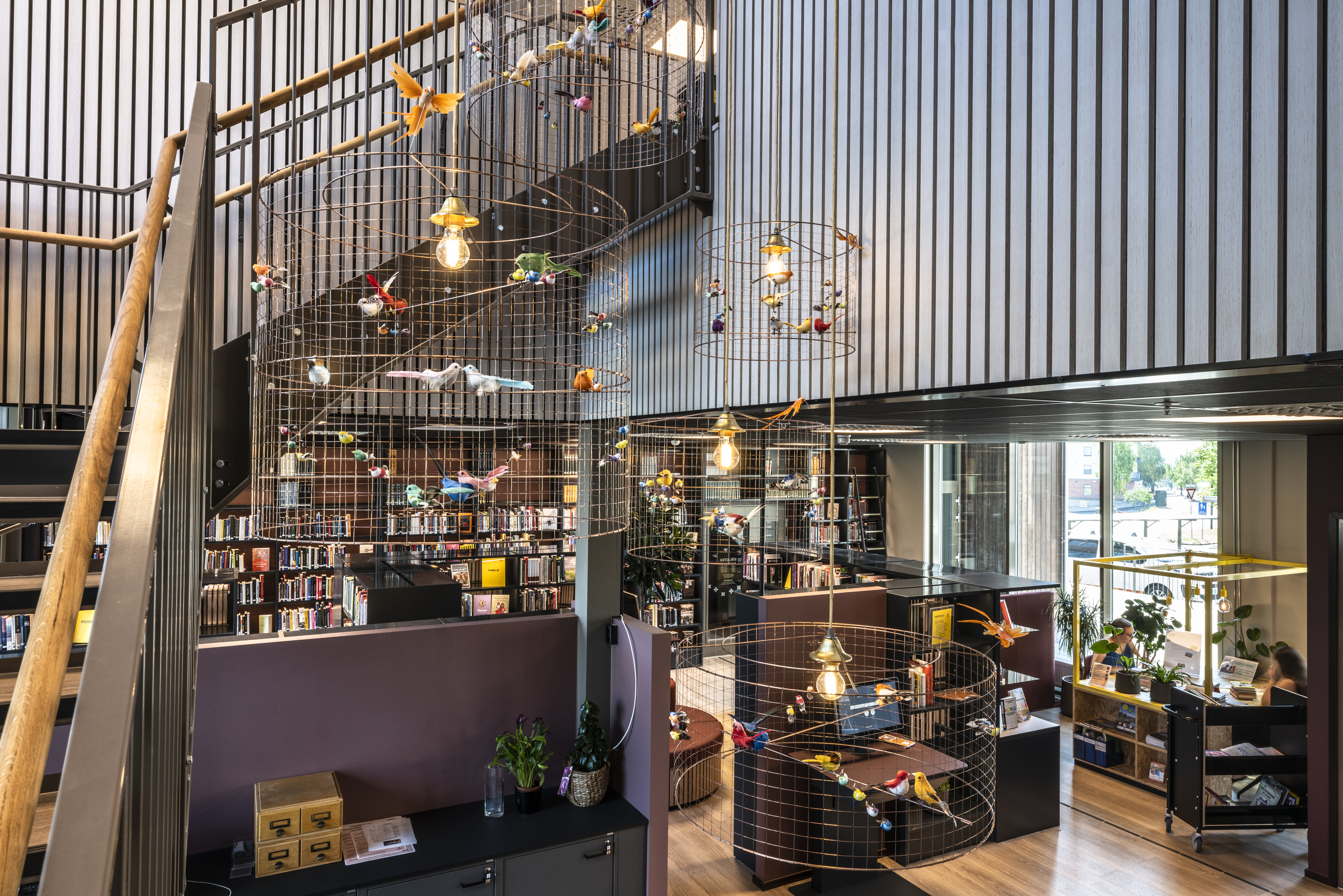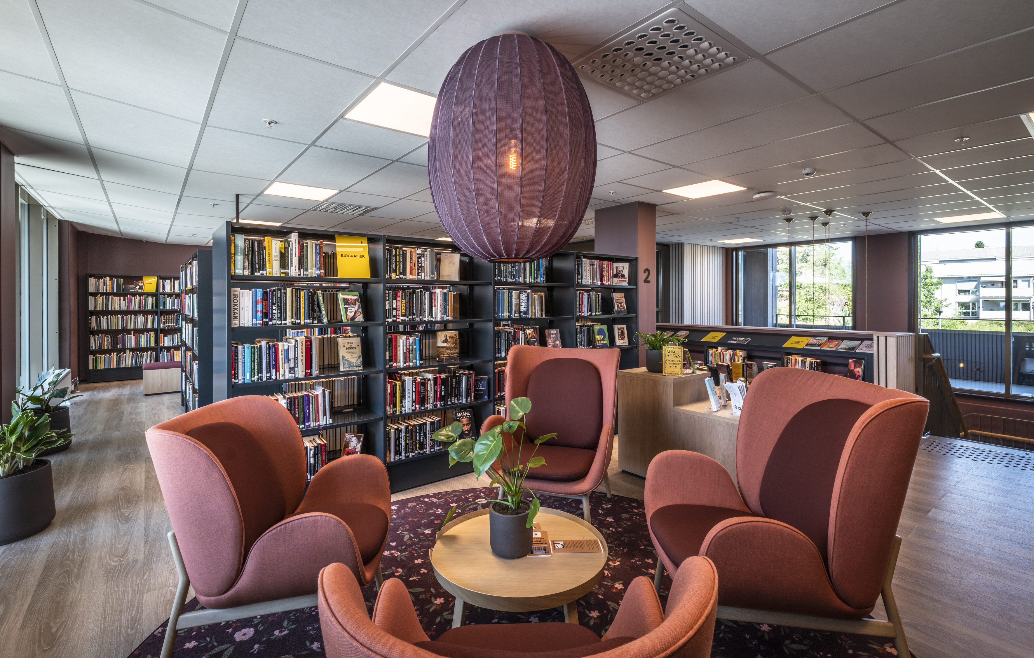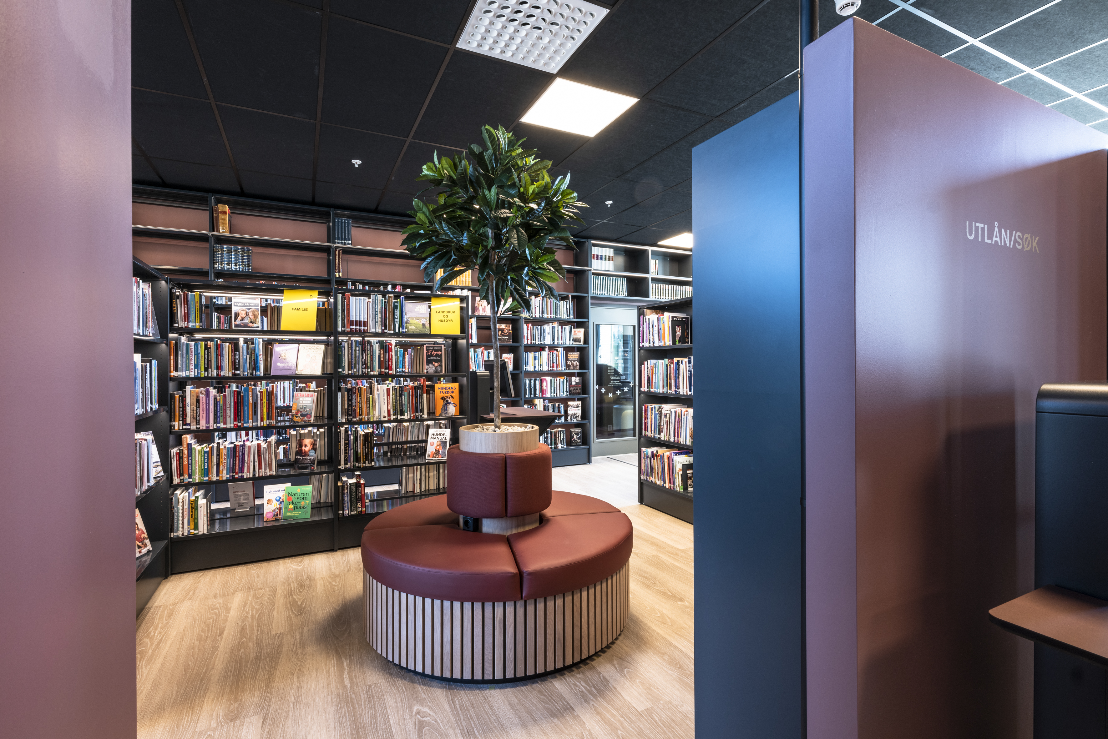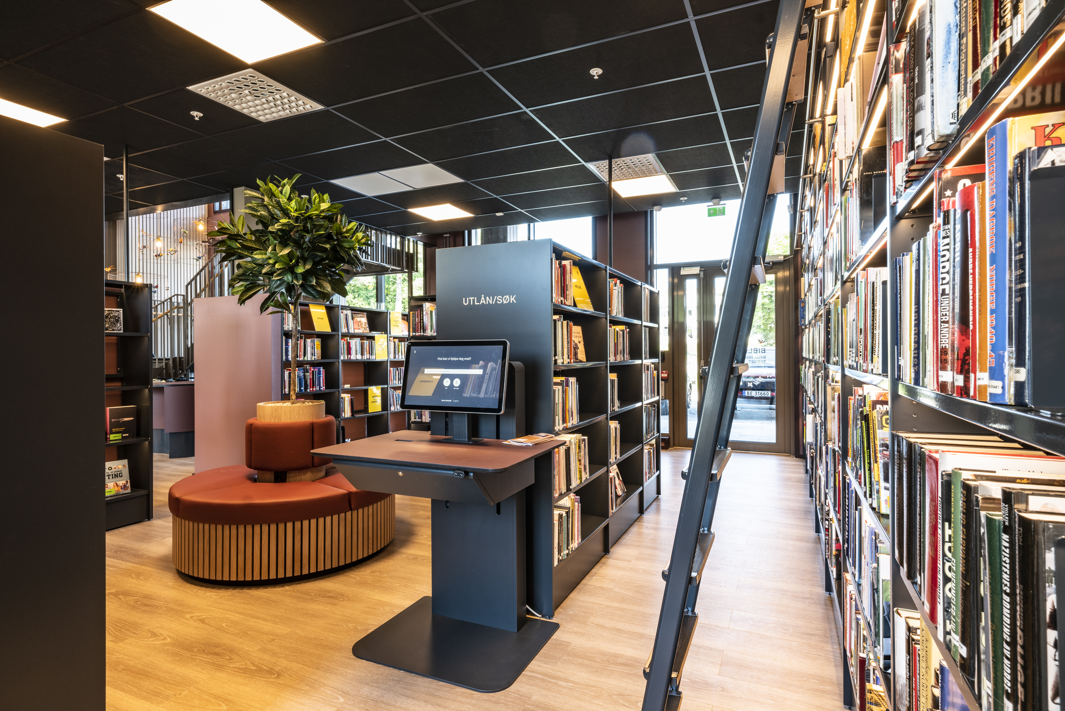 After spending more than 40 years in a basement at a school, Skiptvet Library has now acquired a fantastic location in the new and modern Torggården. The different departments are spread across two floors, connected by a staircase adorned with playful birdcage lamps hanging between the levels. Elements like air, light and warm colours have been a focal point to make the community’s new meeting place as inviting as possible. Simultaneously, a homely atmosphere prevails with the use of biophilic design – e.g., many plants of various sizes can be seen throughout the library.